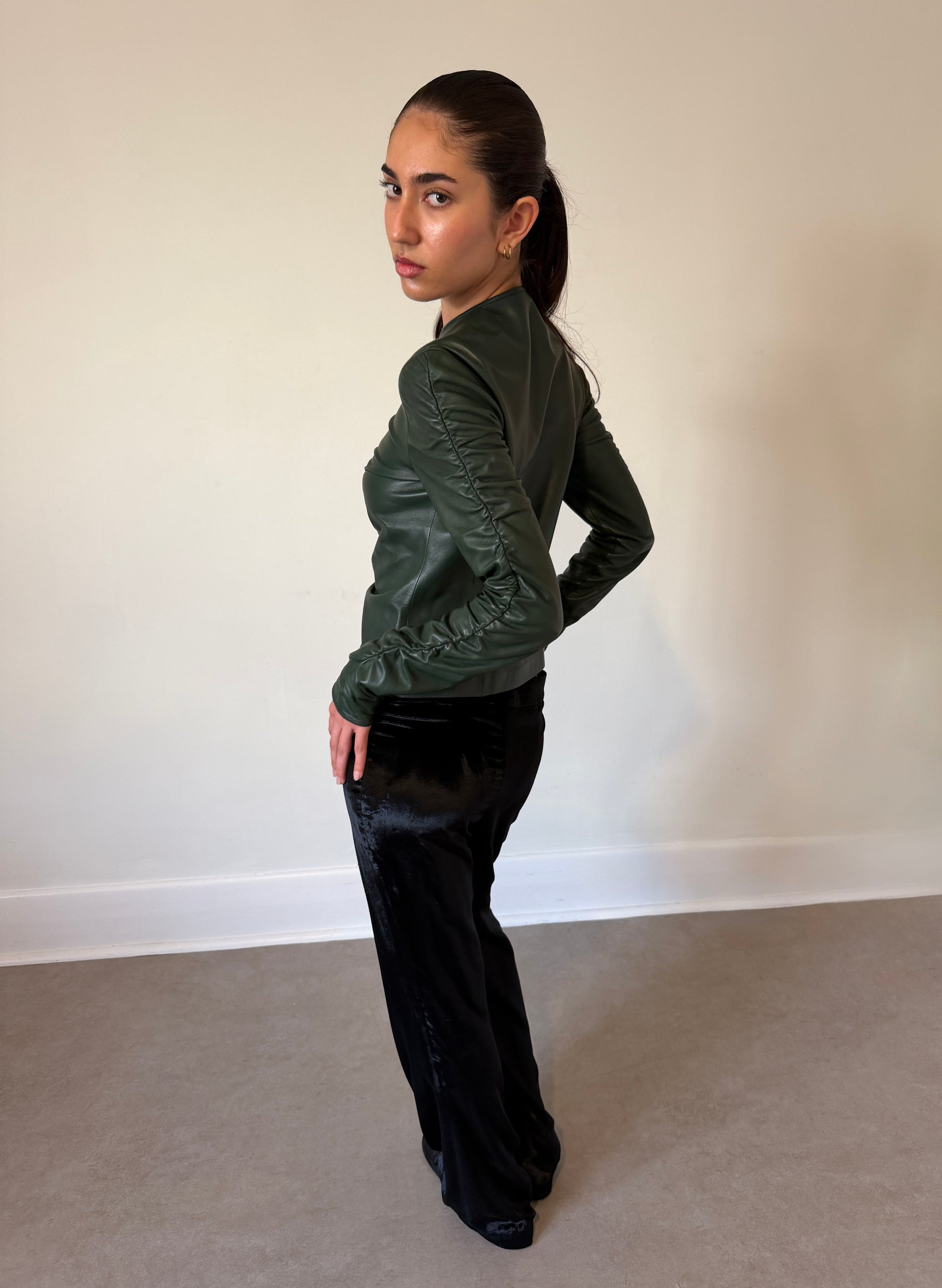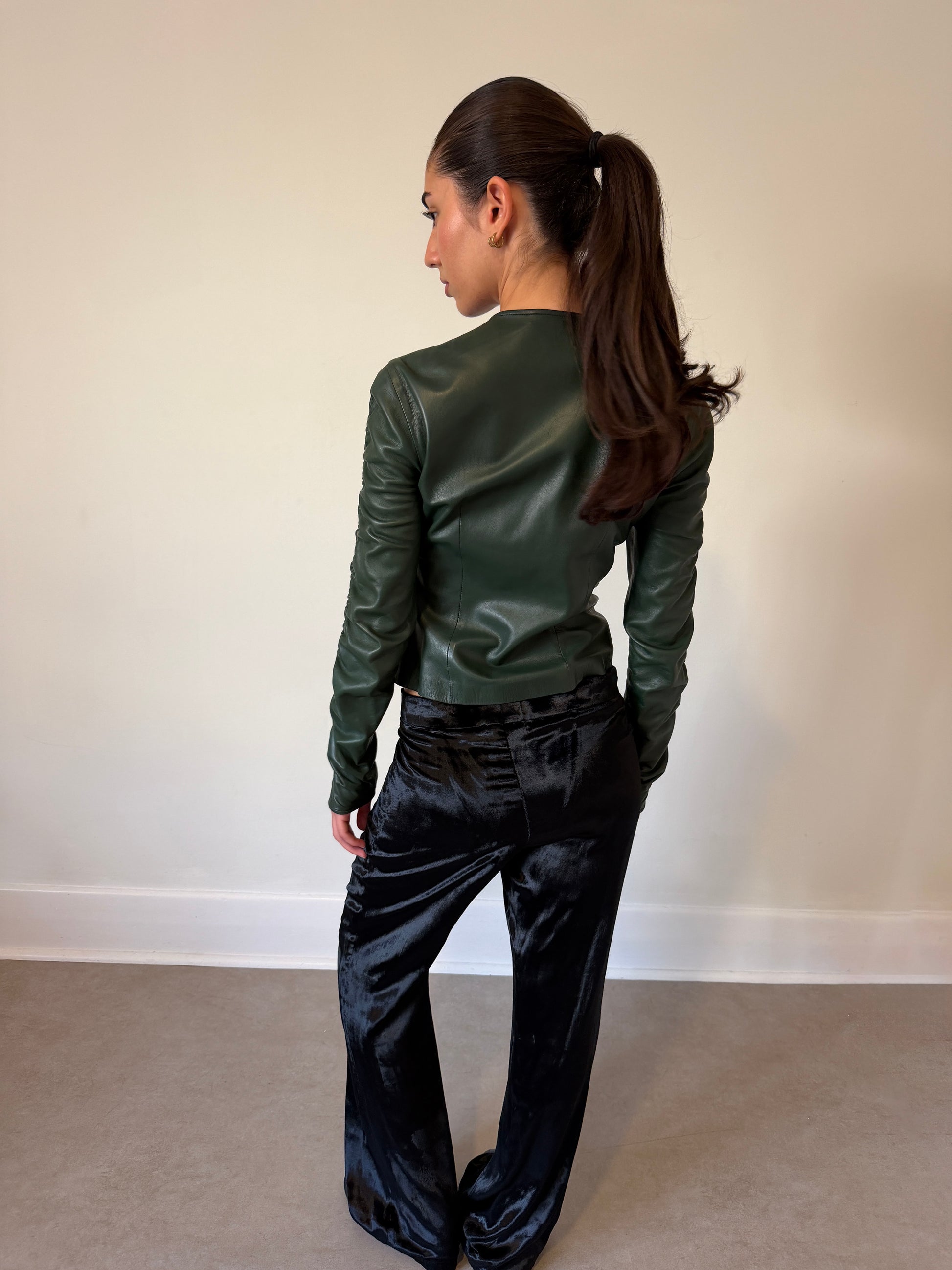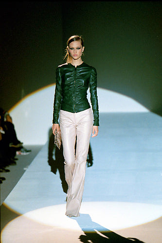 gucci fall 1999 runway leather jacket in deep green nappa leather, cut with a fitted, feminine silhouette and finished with a clean crew neckline. designed with sculptural shirring through the body and sleeves, creating soft gathering and contouring throughout. crafted from supple cowhide leather with a smooth, lightweight hand feel. front zip closure with a cropped proportion and refined structure through the torso. fully lined interior. no visible dirt, tears, or odour. leather remains soft and fluid