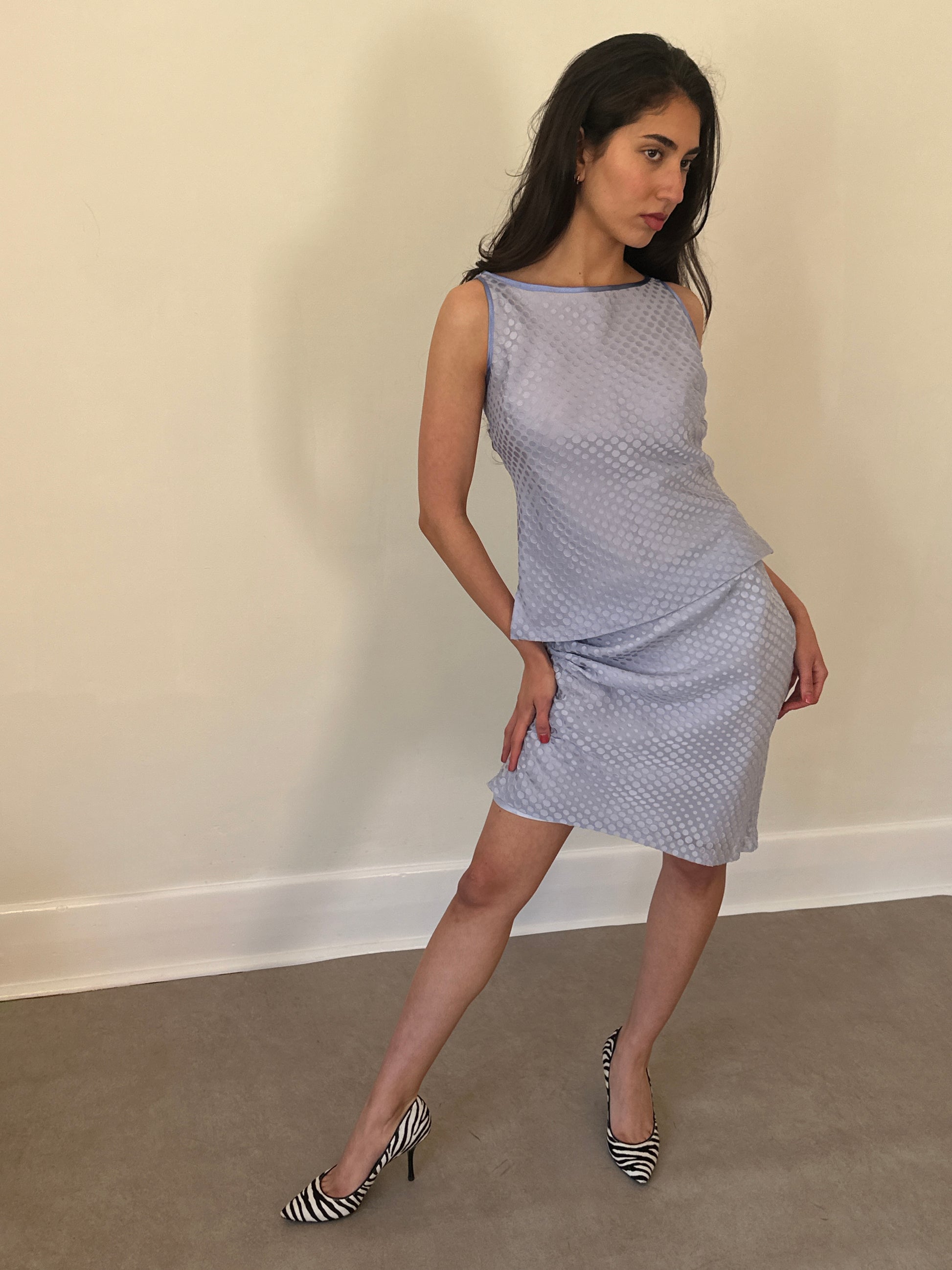 rayon-blend ensemble featuring a sleeveless tank top and matching midi skirt. crafted in a soft blue-gray base with a subtle dot jacquard texture throughout. tank top has a clean bateau neckline, while the skirt is straight-cut with a flattering mid-rise waistline. versatile as separates or worn together for a coordinated look.