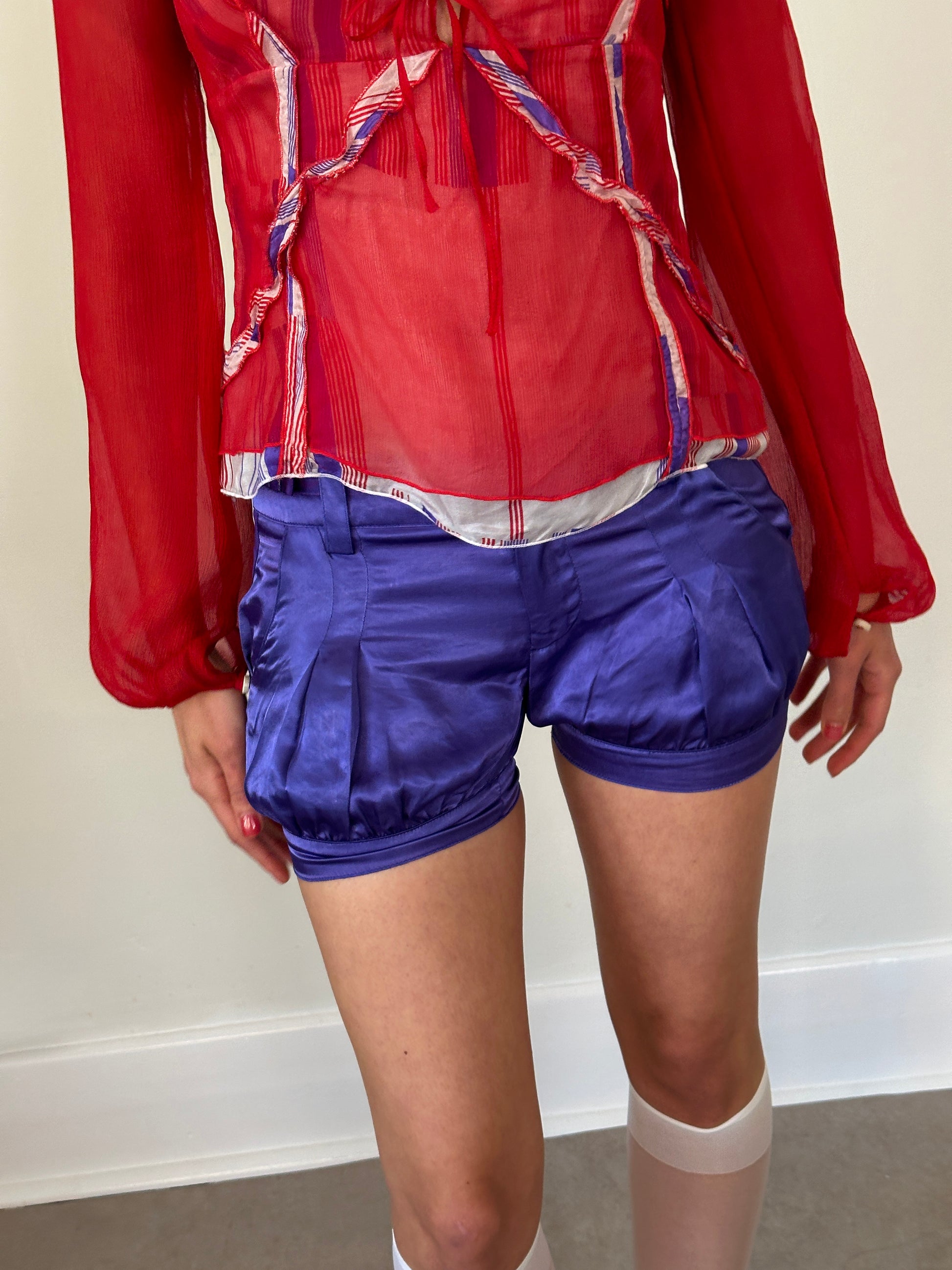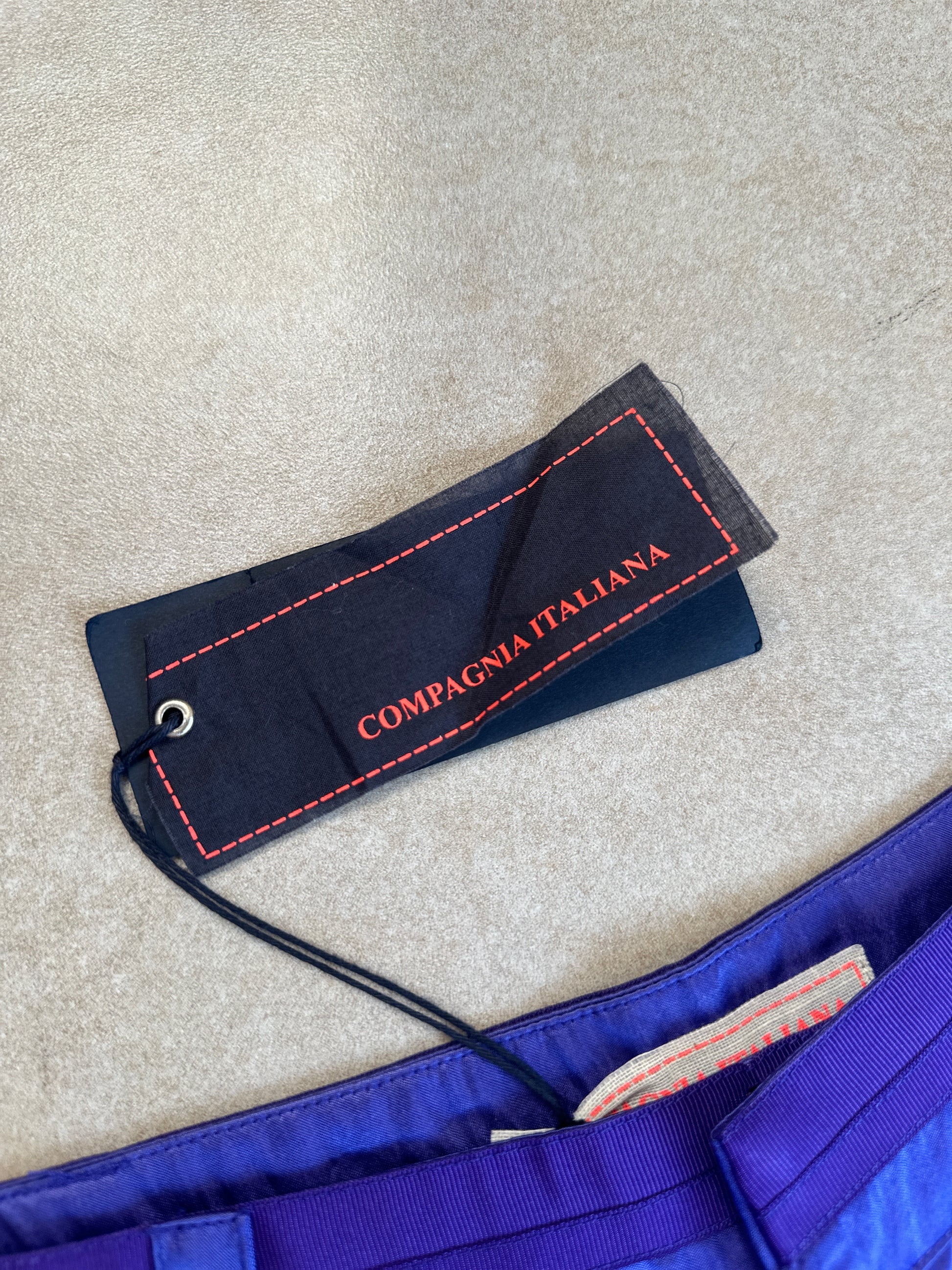 silky acetate-rayon blend in a vibrant violet tone, features pleated front detailing, cuffed hems, side pockets, and tonal ribbon trim along the waist and side seams. finished with belt loops and a fitted waistband for structure