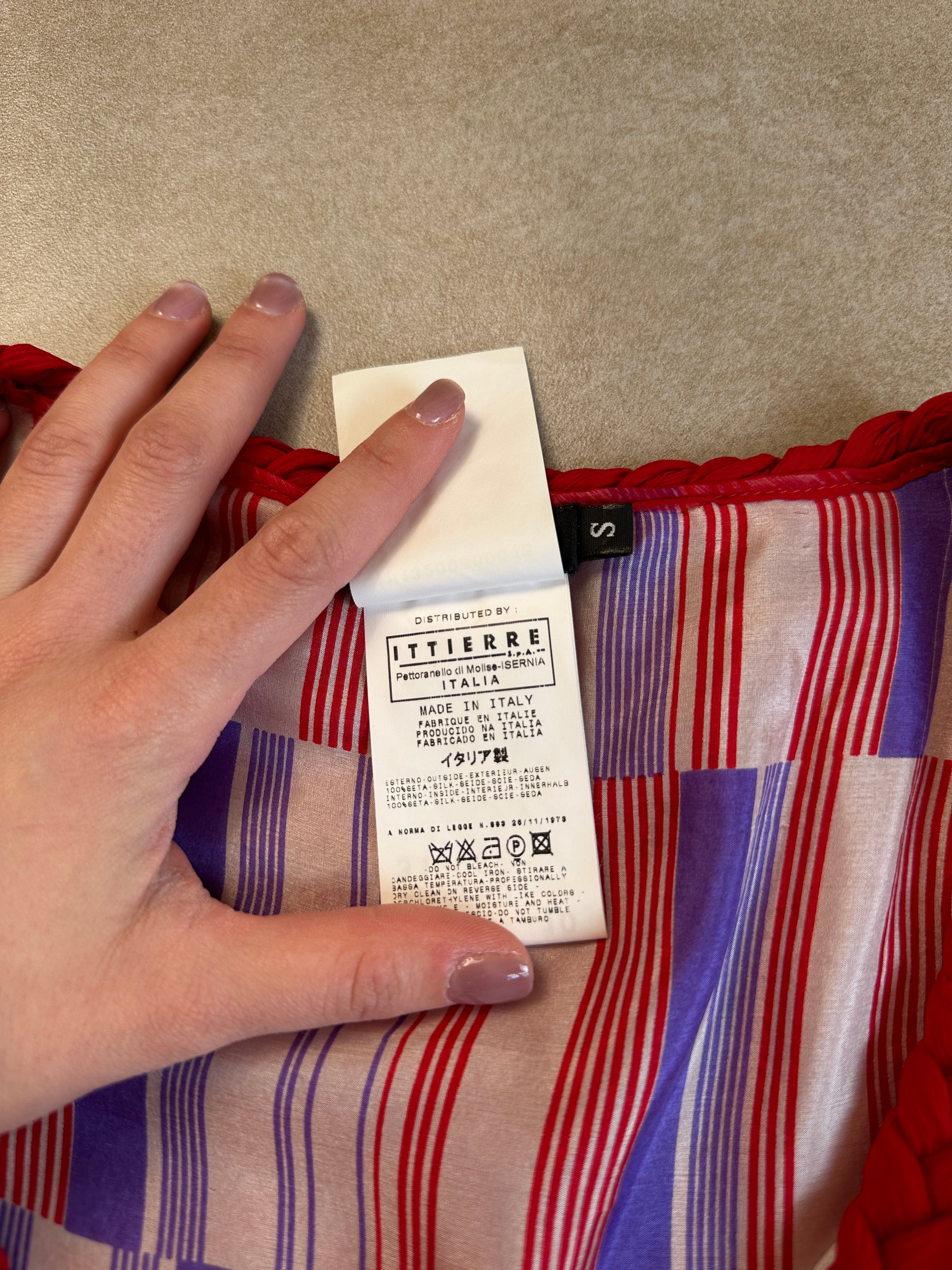 crafted in italy from 100% silk chiffon in vibrant red with striped accents in blue and white. features a braided deep v neckline with tie closure, contrast striped paneling that shapes the waist, and a subtle peplum flare at the hem. sheer long sleeves and a side zip closure complete the lightweight, airy silhouette.