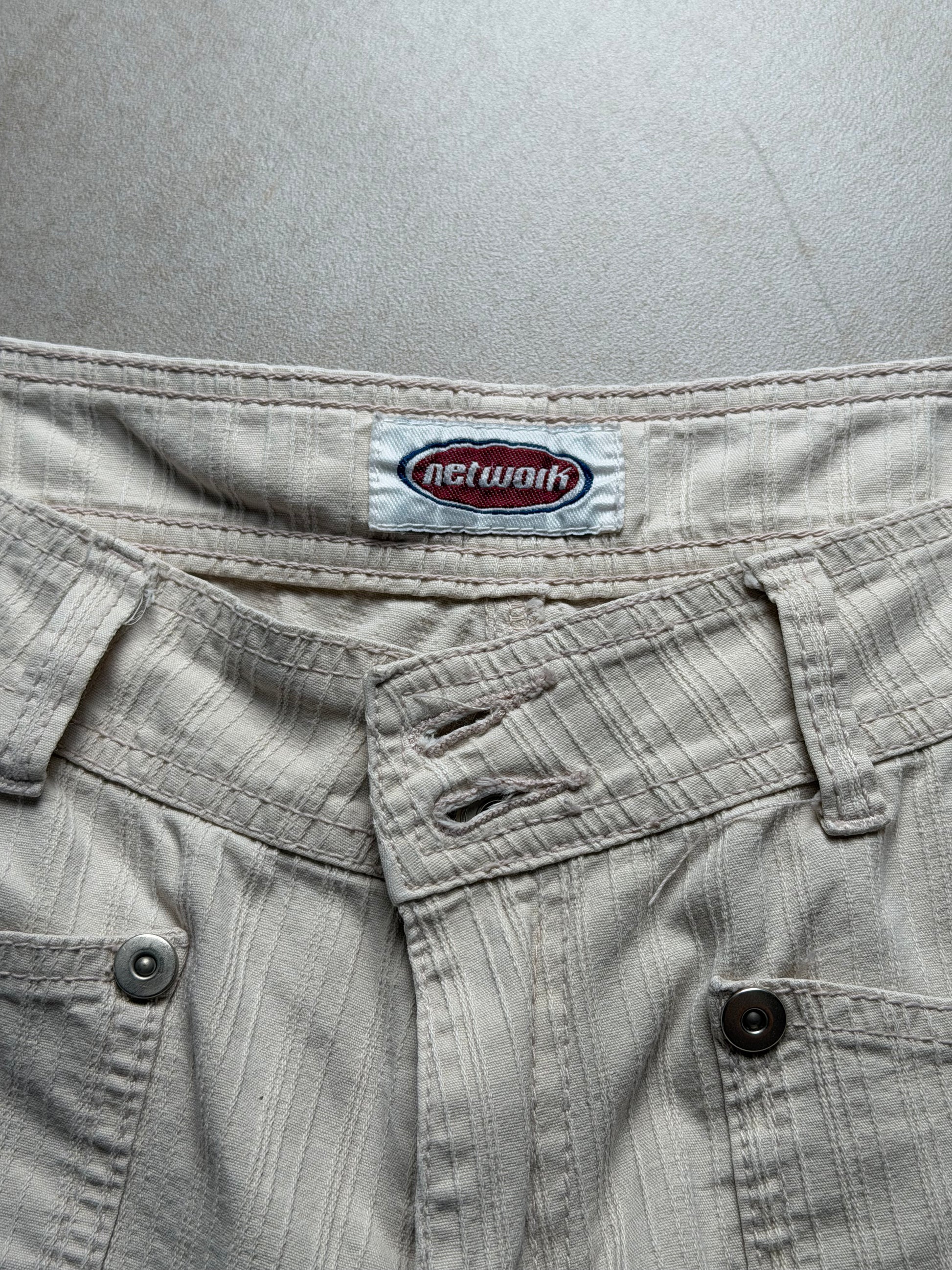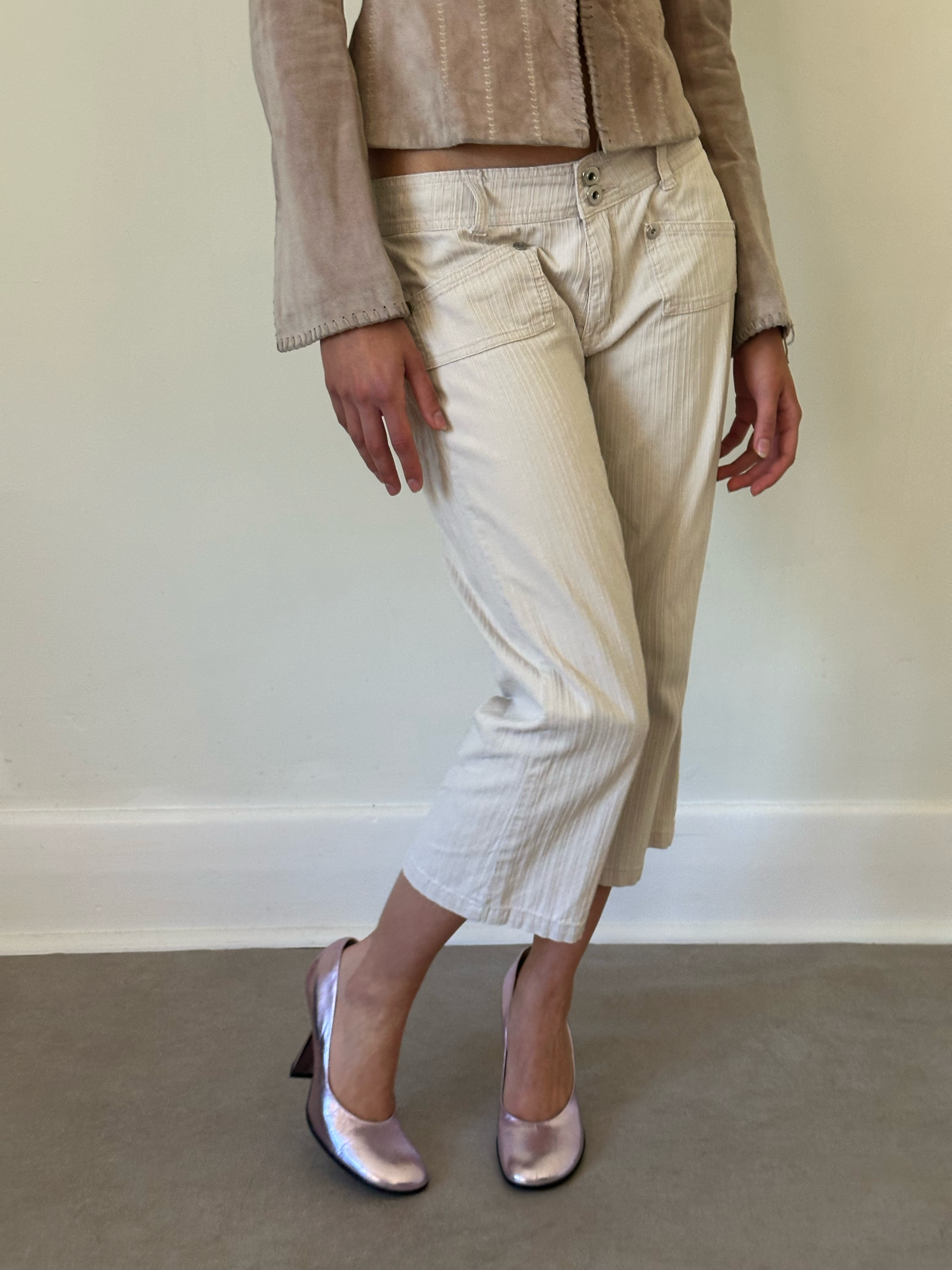 2000s cropped ivory trousers featuring a mid-rise fit with signature double-button closure. crafted in italy from a softly structured cotton-blend with subtle vertical texture. detailed with front and back patch pockets and straight cropped leg. in excellent vintage condition with minimal signs of wear.