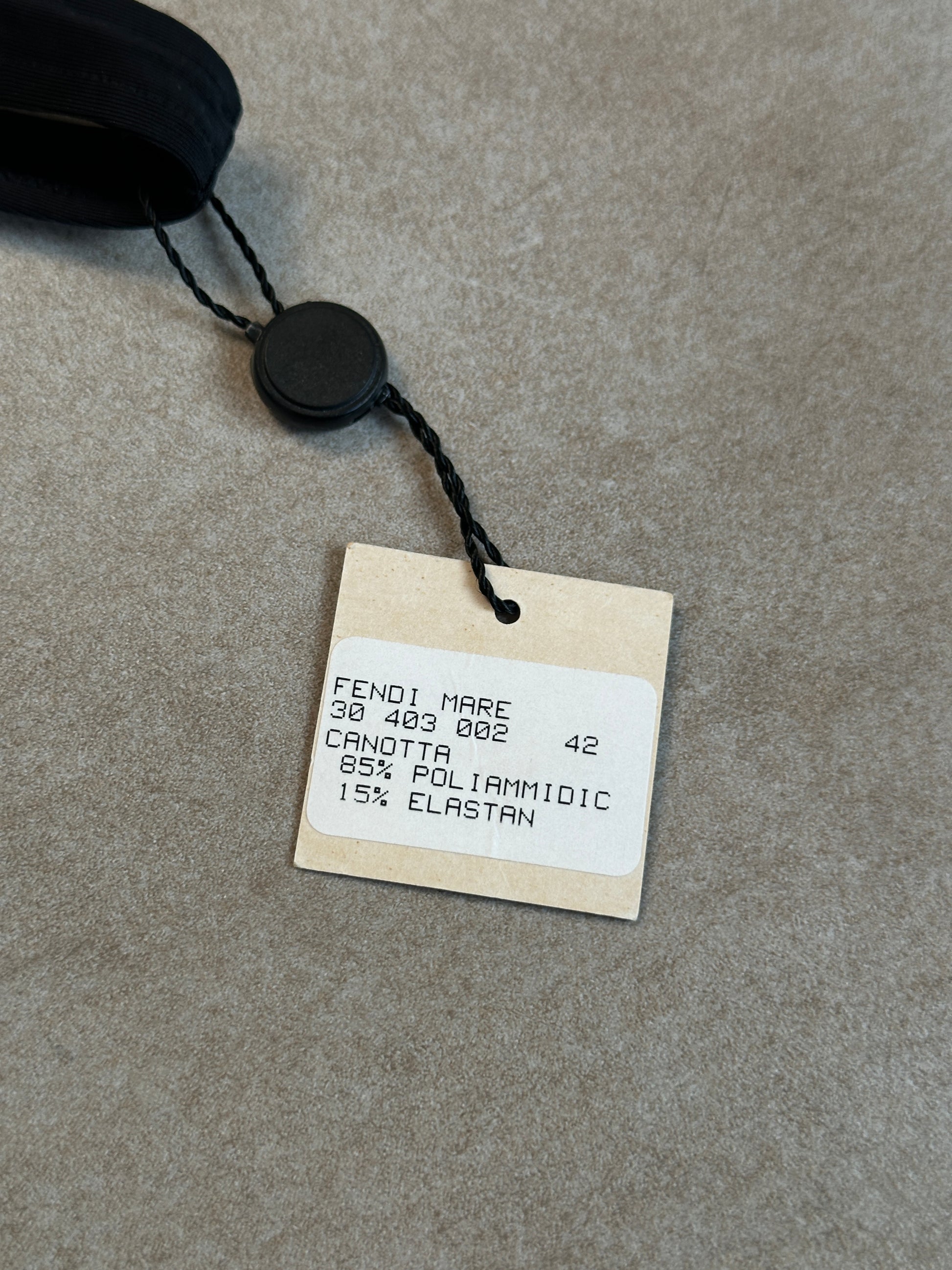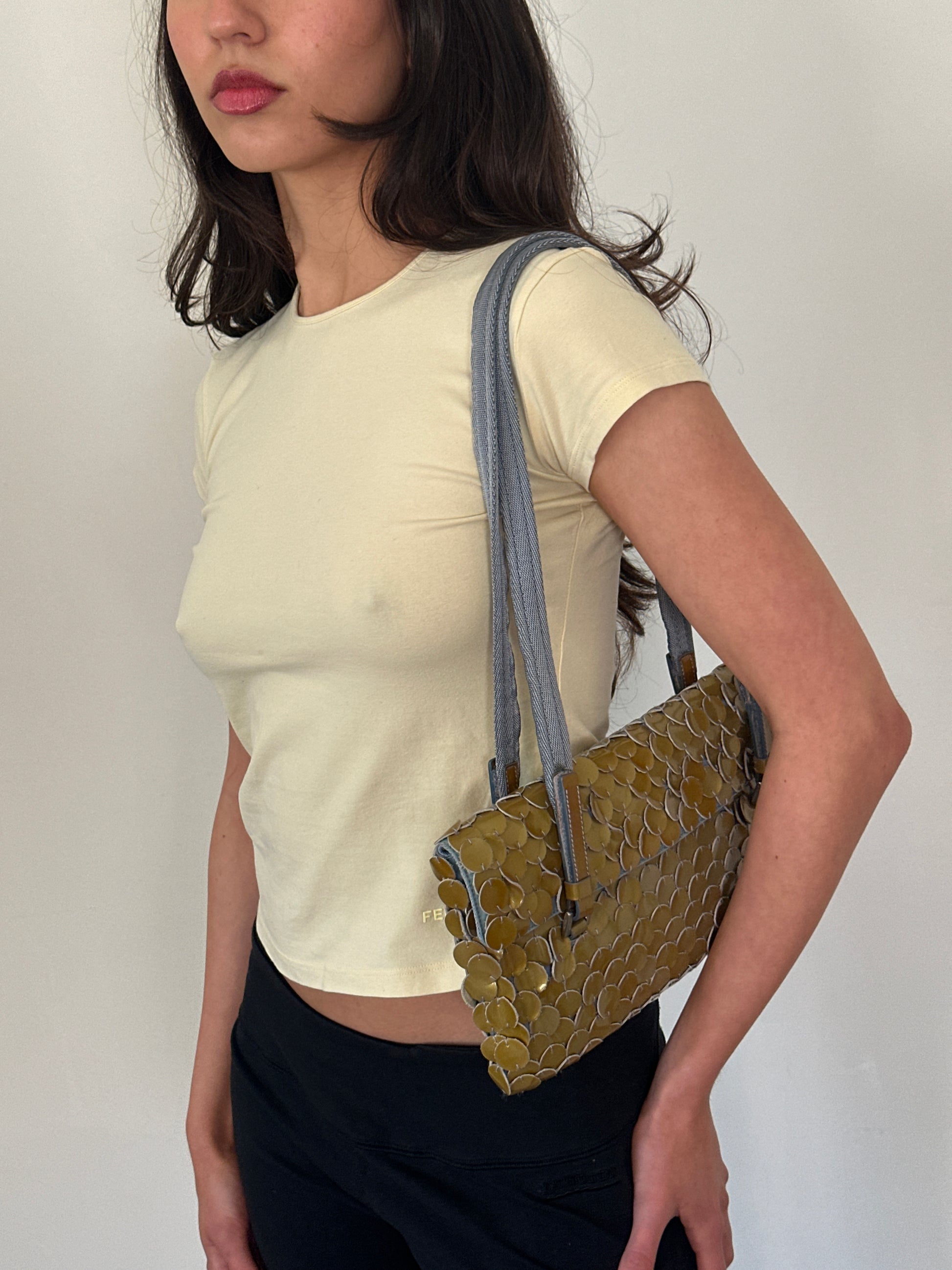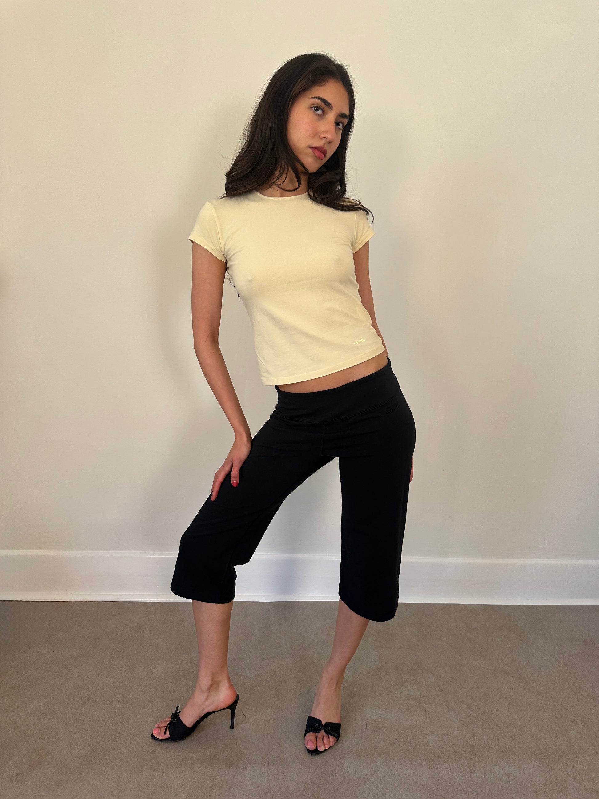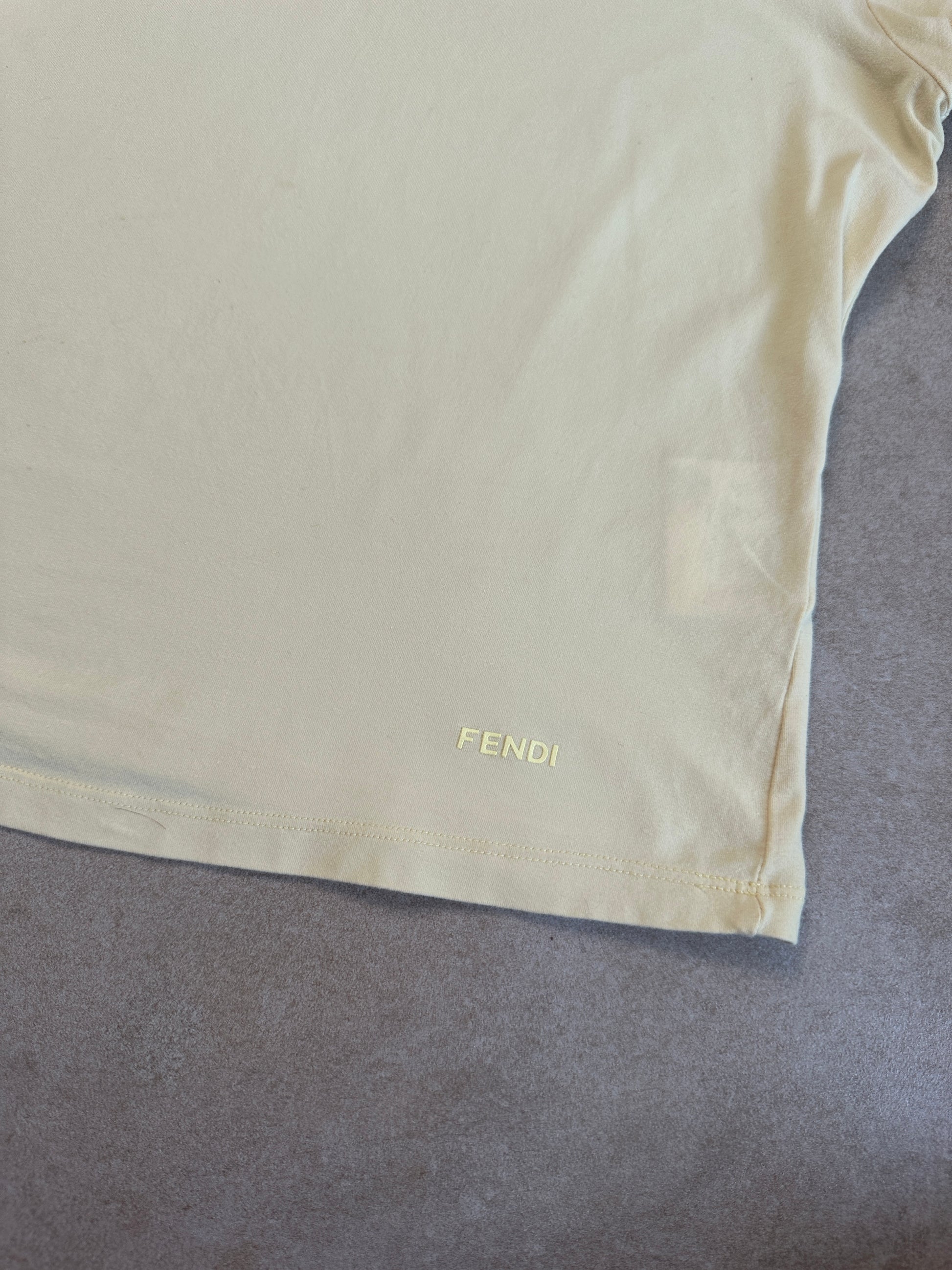 vintage fendi t-shirt in soft yellow, early 2000s. classic short sleeve crew neck with minimal branding and a slim, slightly cropped fit. features small tonal fendi logo at the hem. lightweight stretch cotton with clean construction