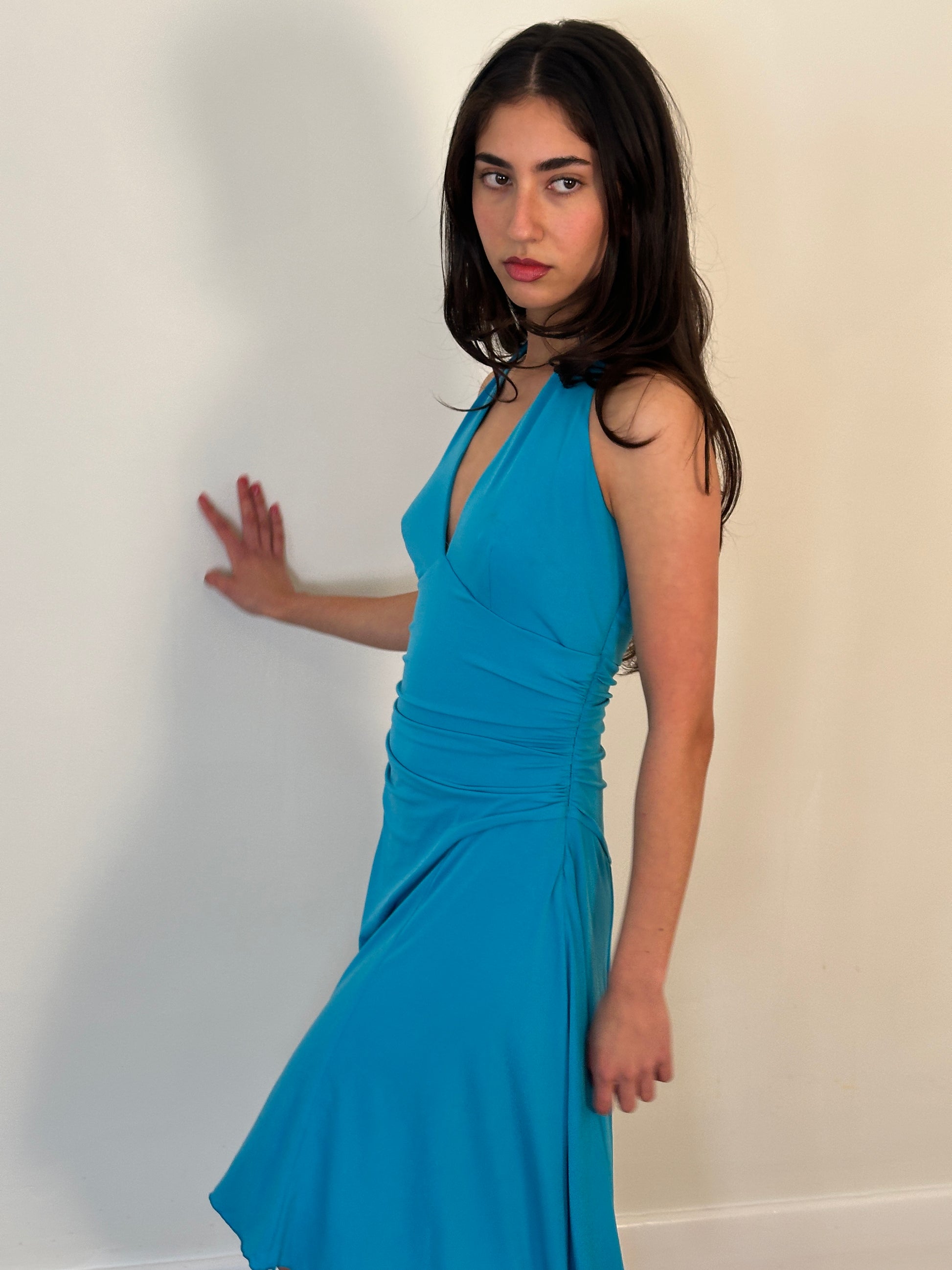 turquoise halter dress with a deep v neckline, ruched waist and an asymmetric hem. open back with a tie at the neck and soft drape through the skirt, lined
