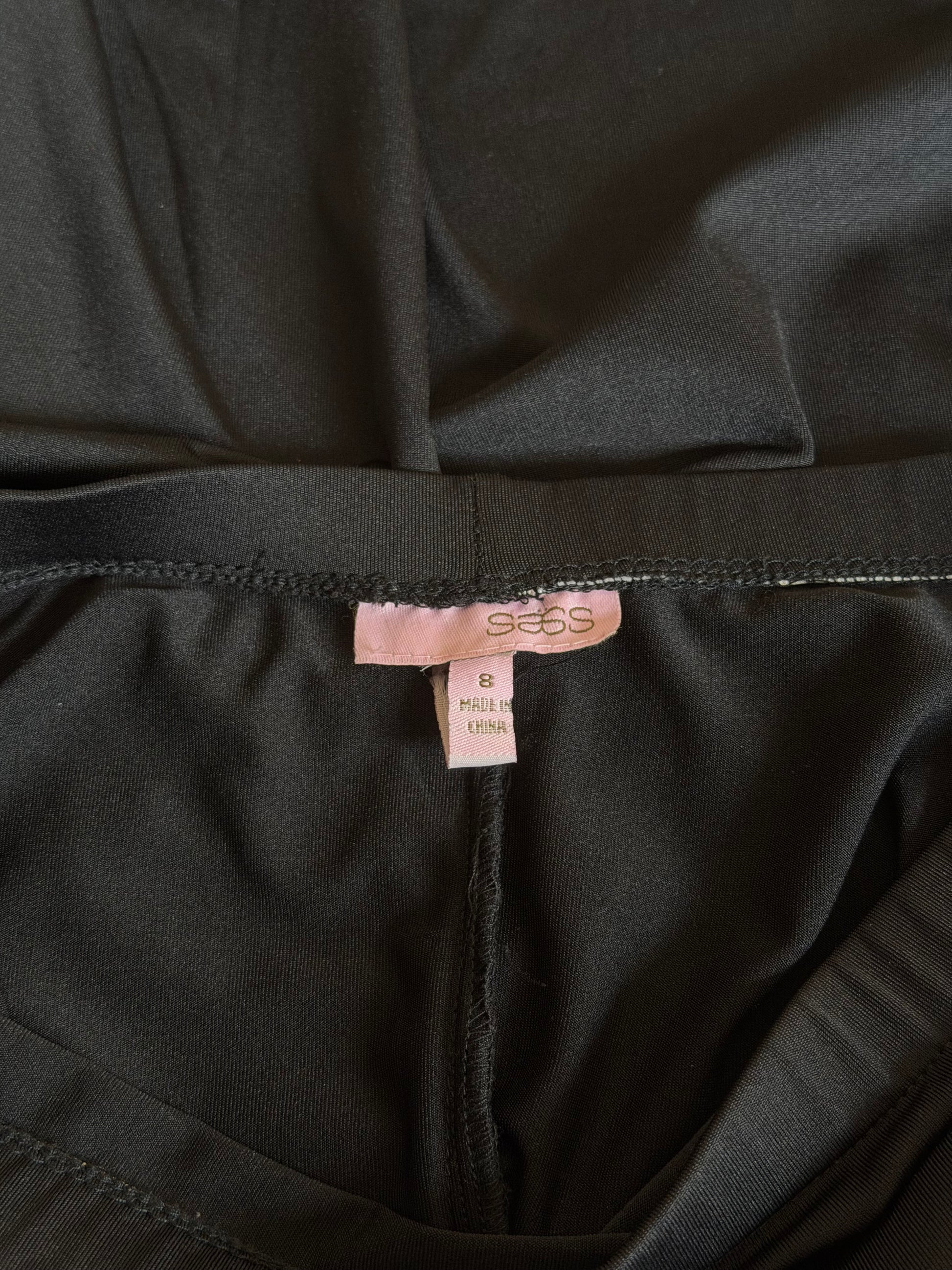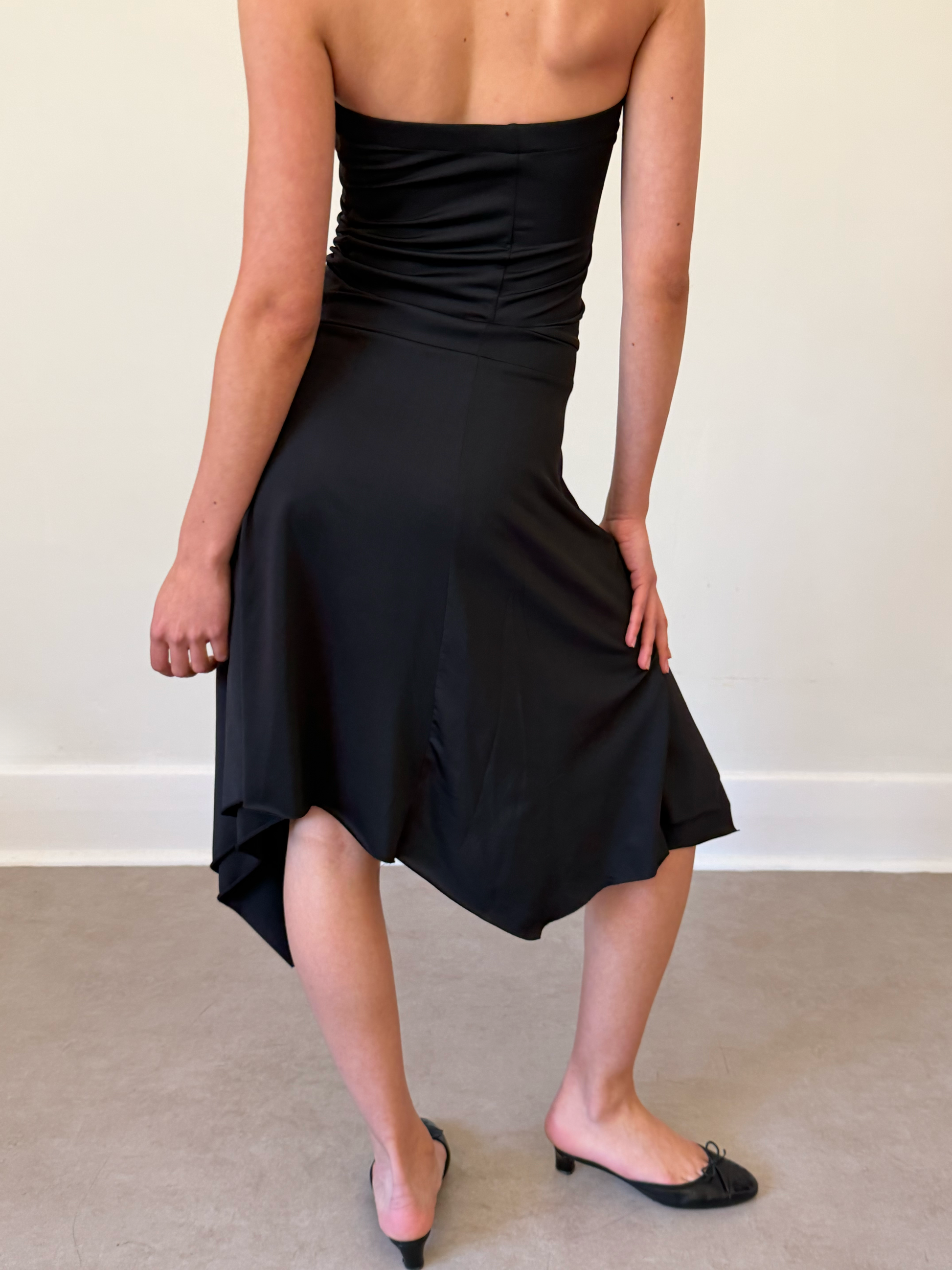 90s sass black strapless asymmetrical dress, soft slinky stretch jersey with bandeau neckline and draped handkerchief hem. in good vintage condition with gentle natural wear