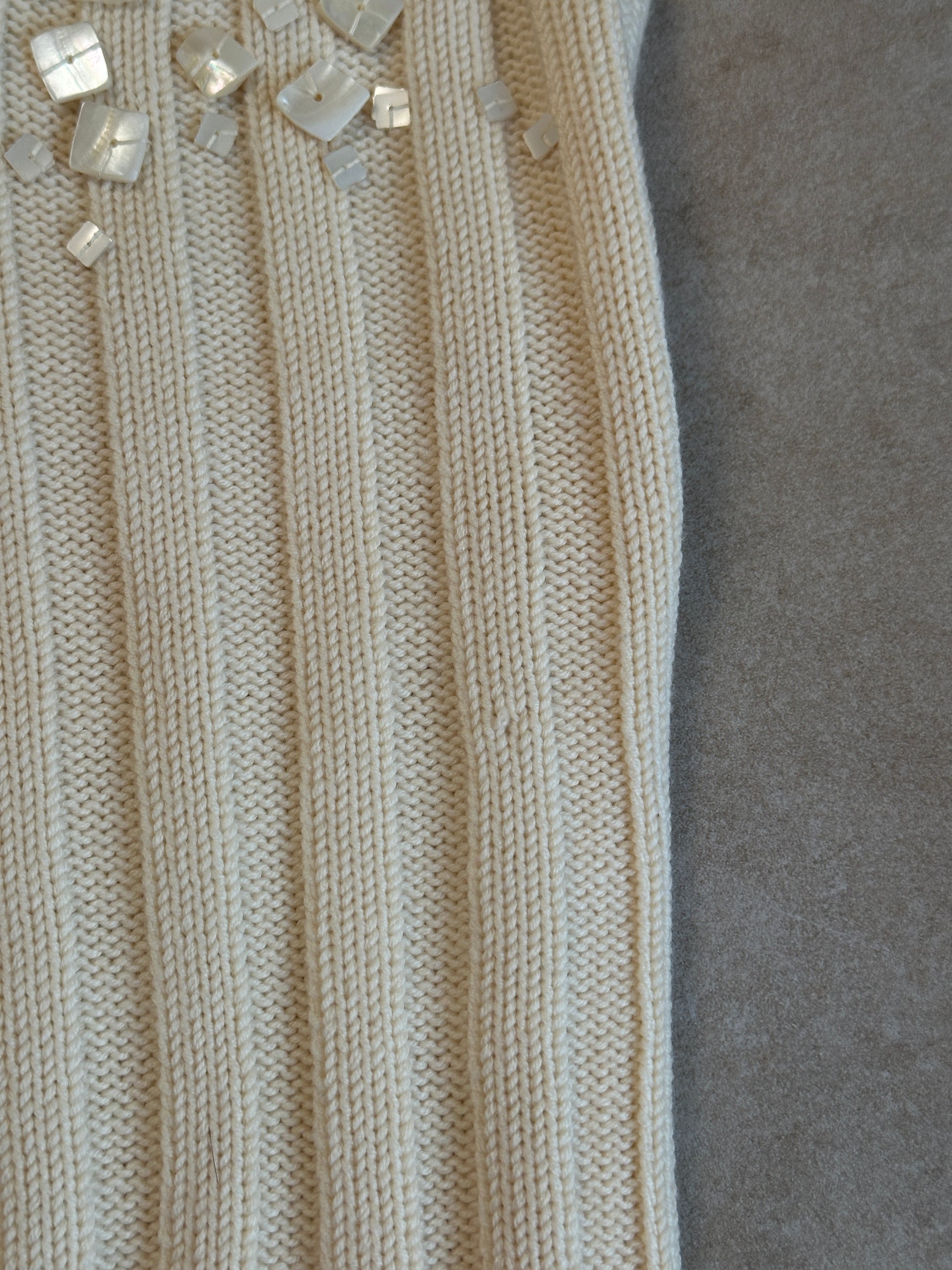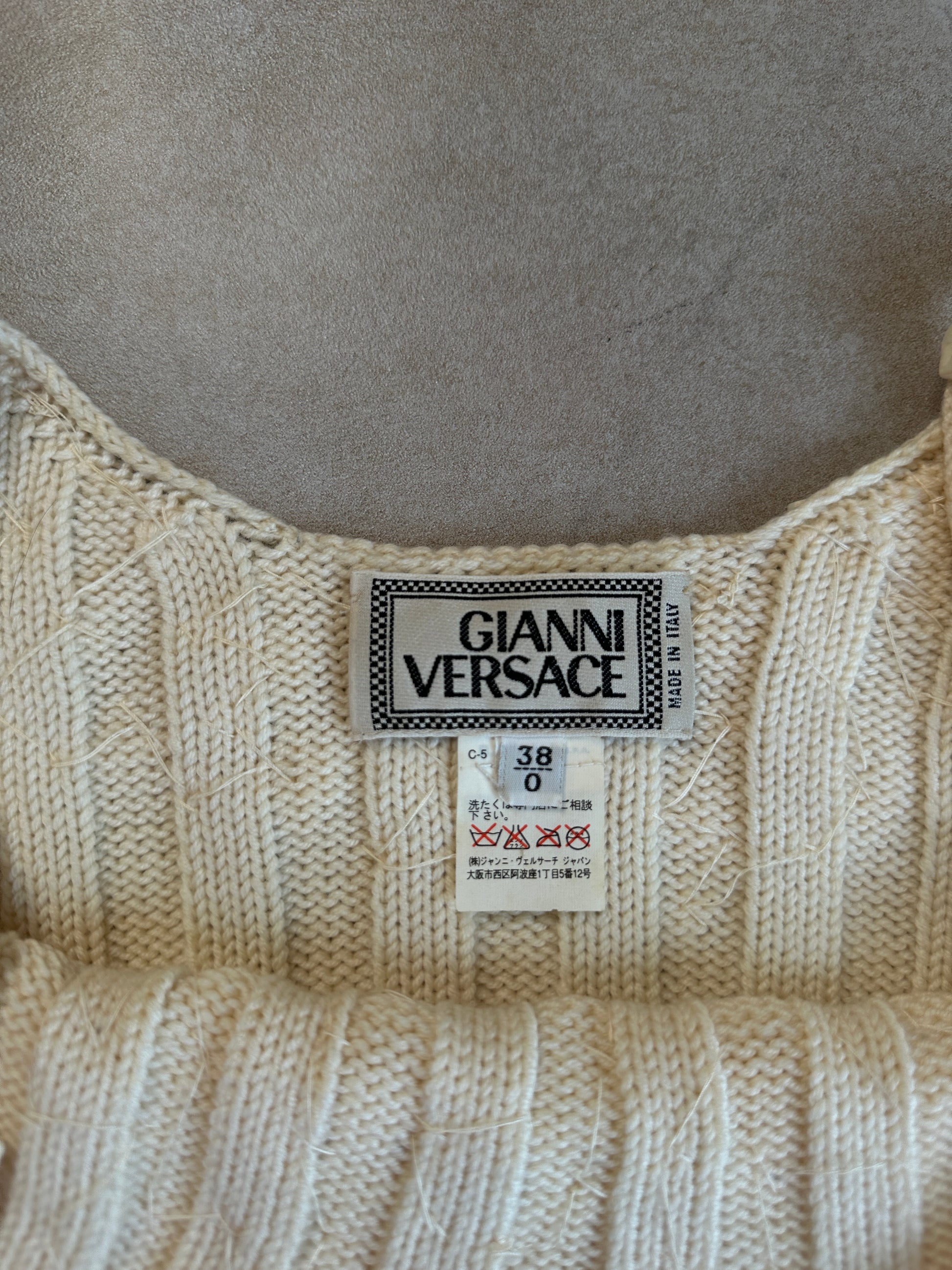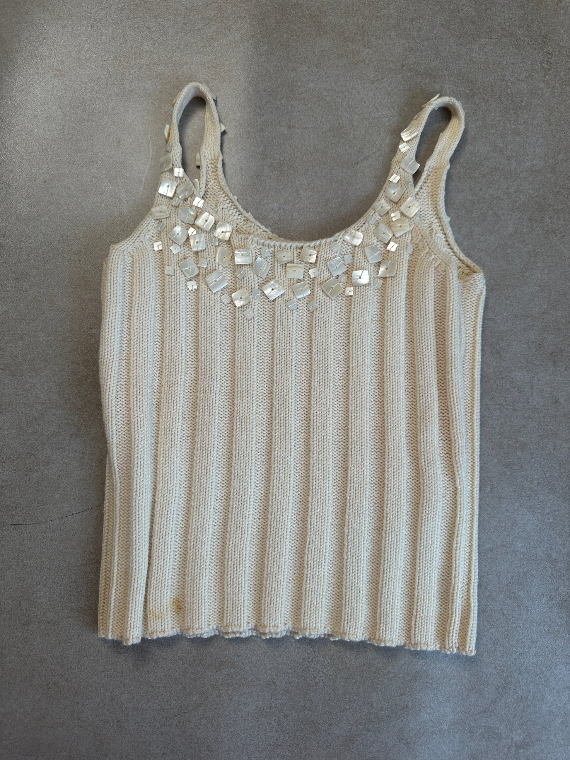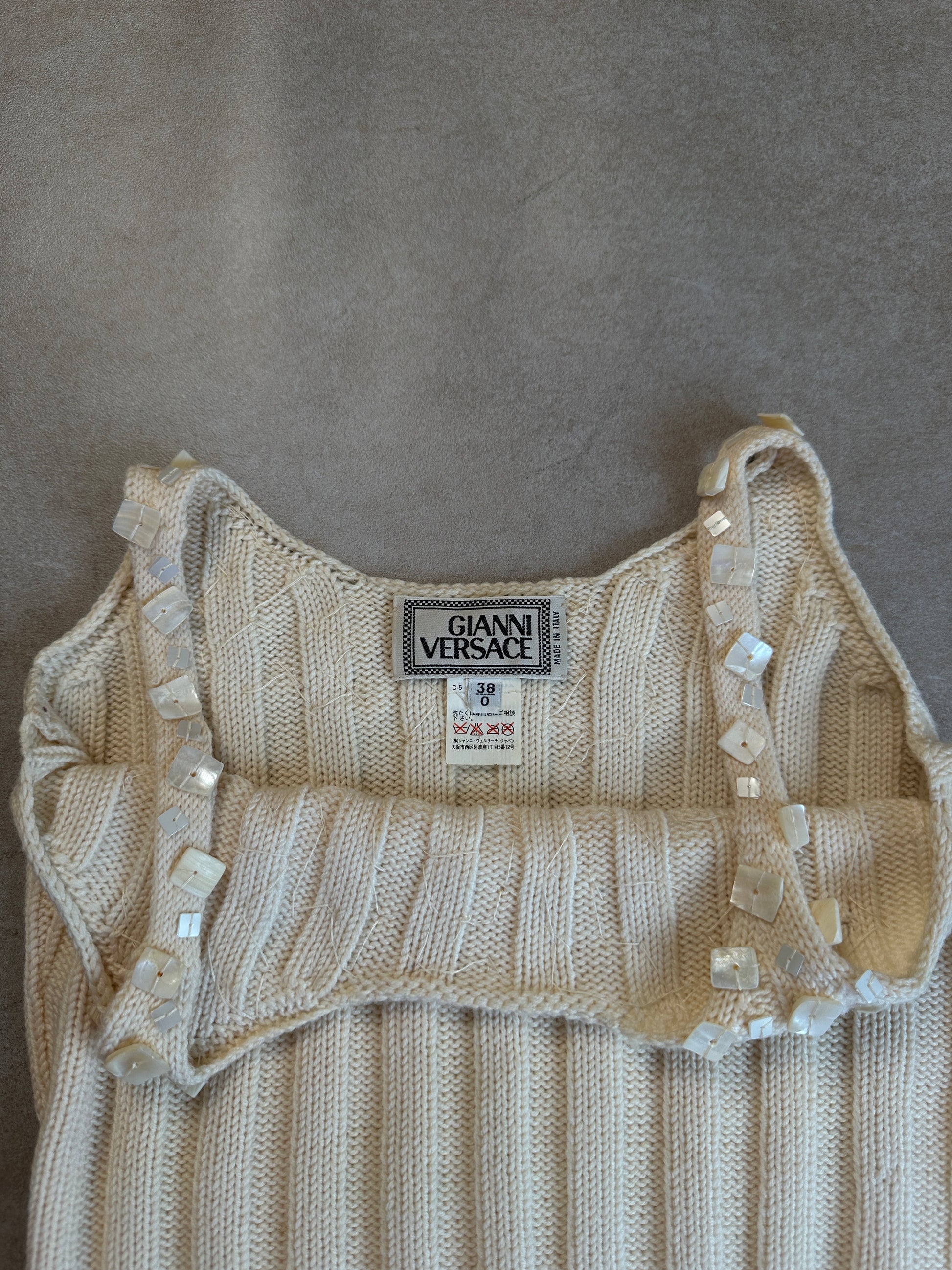 archive gianni versace ivory knit tank top, early 90s. fitted ribbed body with cropped length and square neckline. embellished with pearl-style square beads across the straps and bust. knit construction with structured stretch for a sculpted fit