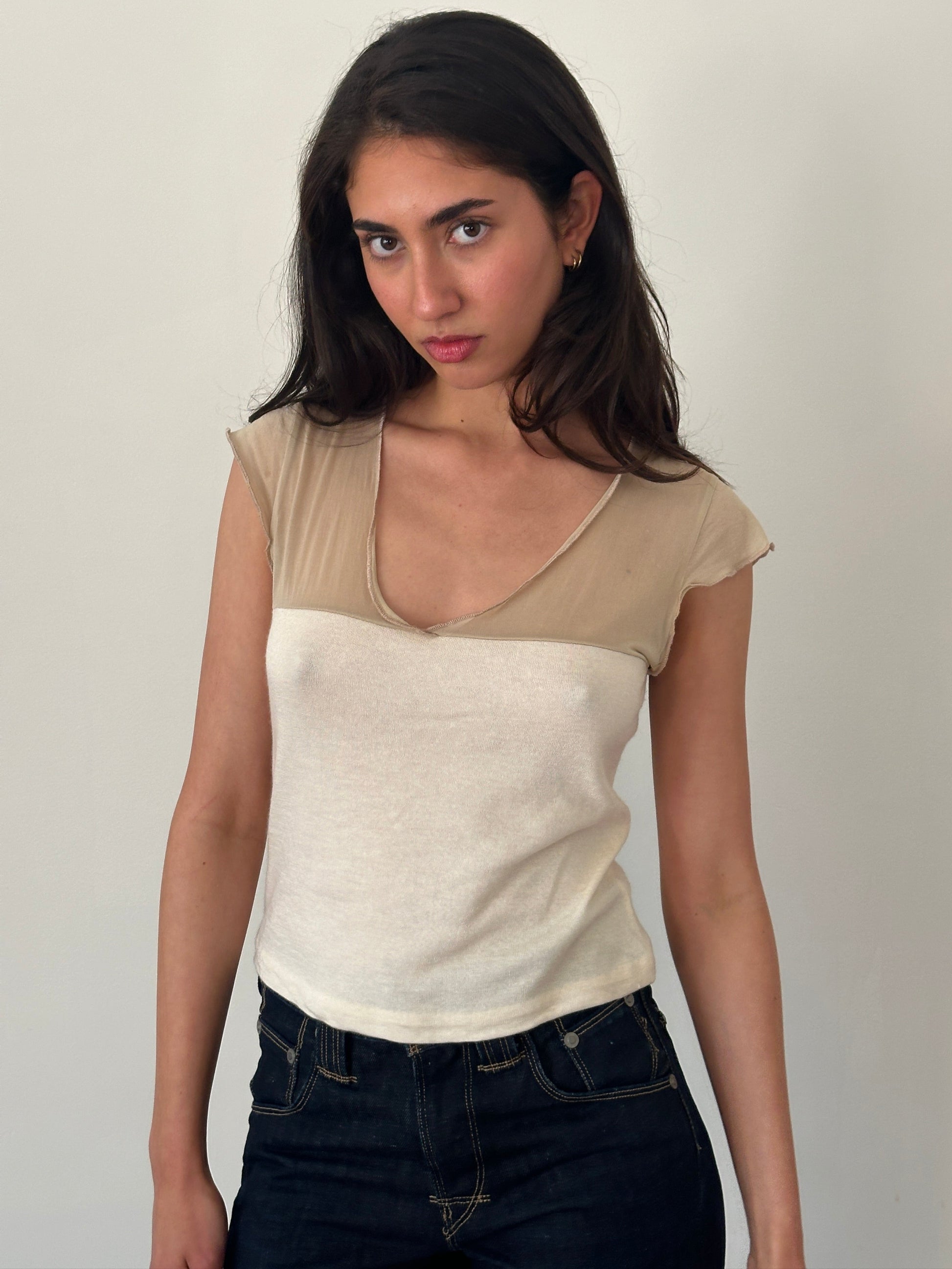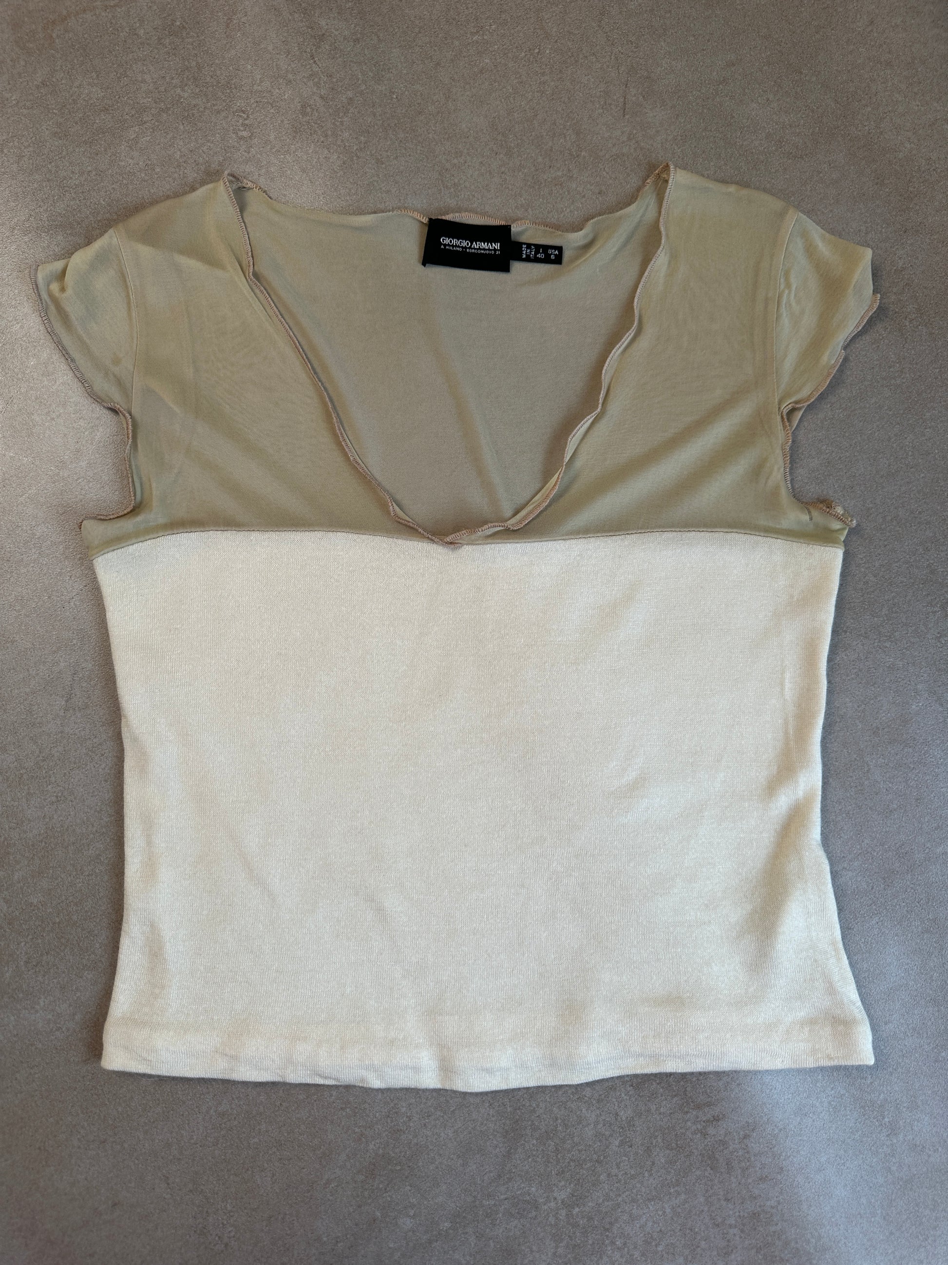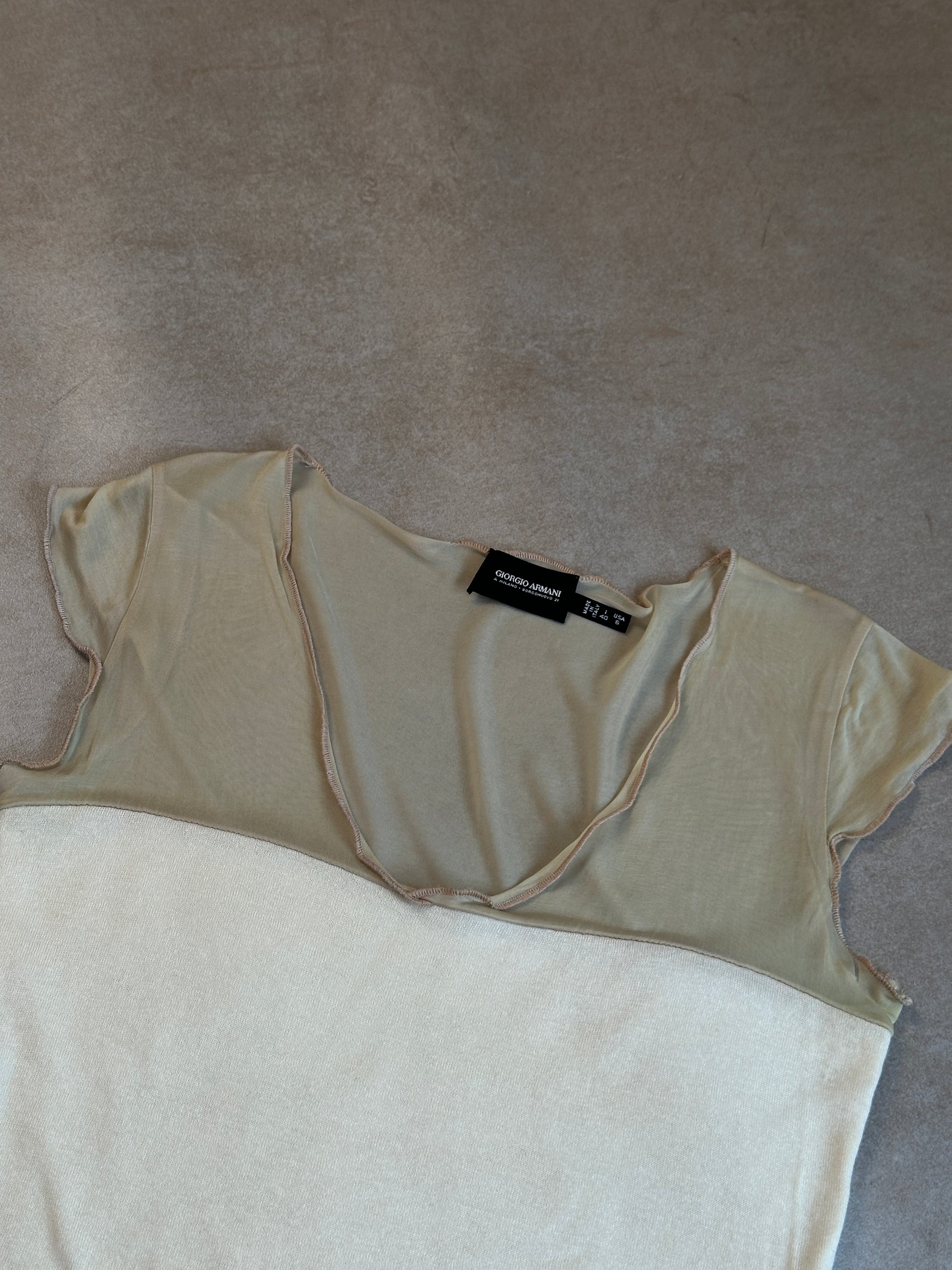 giorgio armani collezioni sleeveless top in beige. cashmere cotton blend with semi-sheer upper panel and soft knit body. v neckline with delicate drape through the shoulders. lightweight and refined with a slim fit