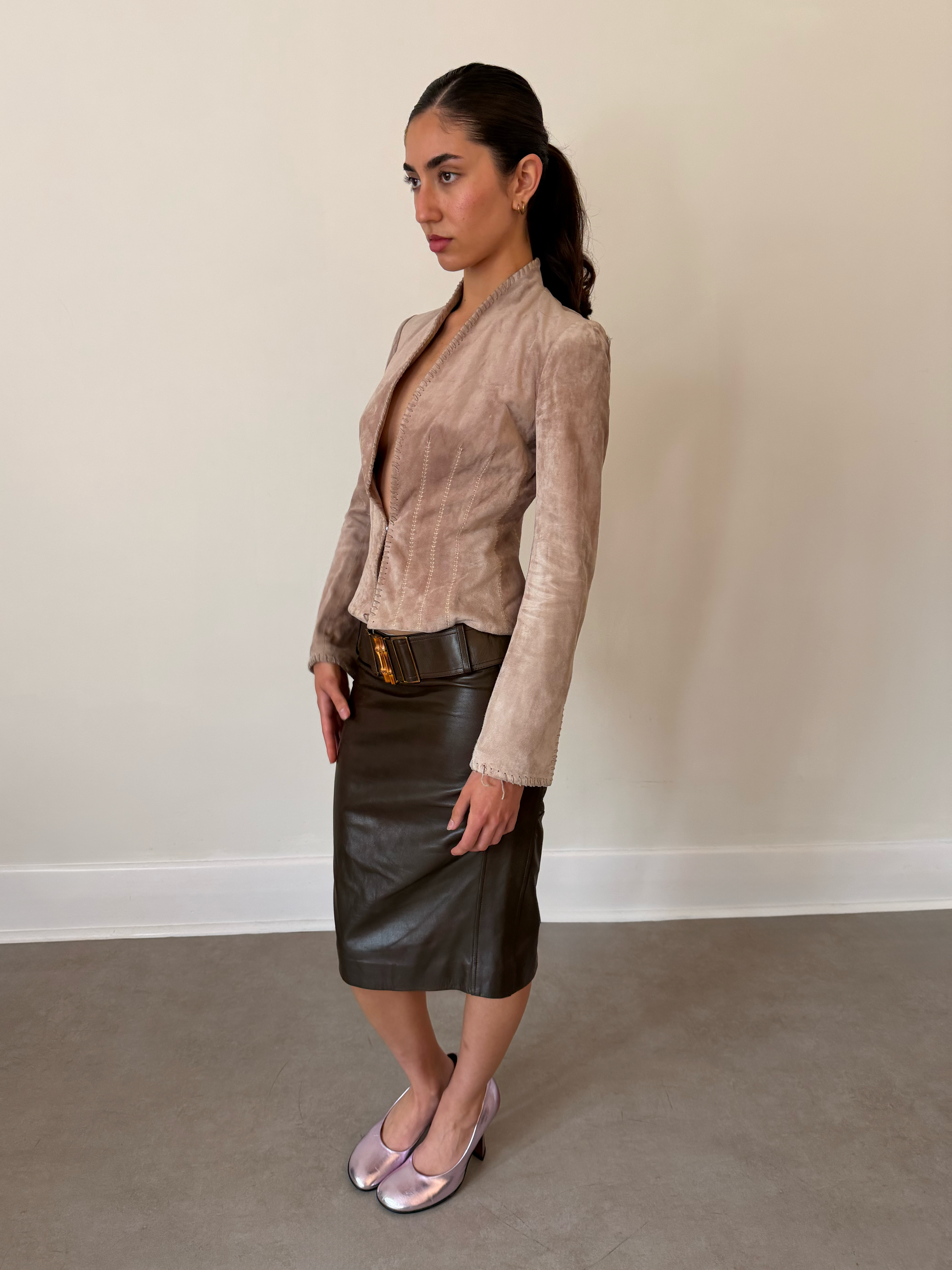 90s gucci brown leather pencil skirt from the tom ford era, featuring the iconic bamboo-detail belt. made in italy in a soft, structured leather with a subtle sheen. in great vintage condition with light creasing to the leather surface