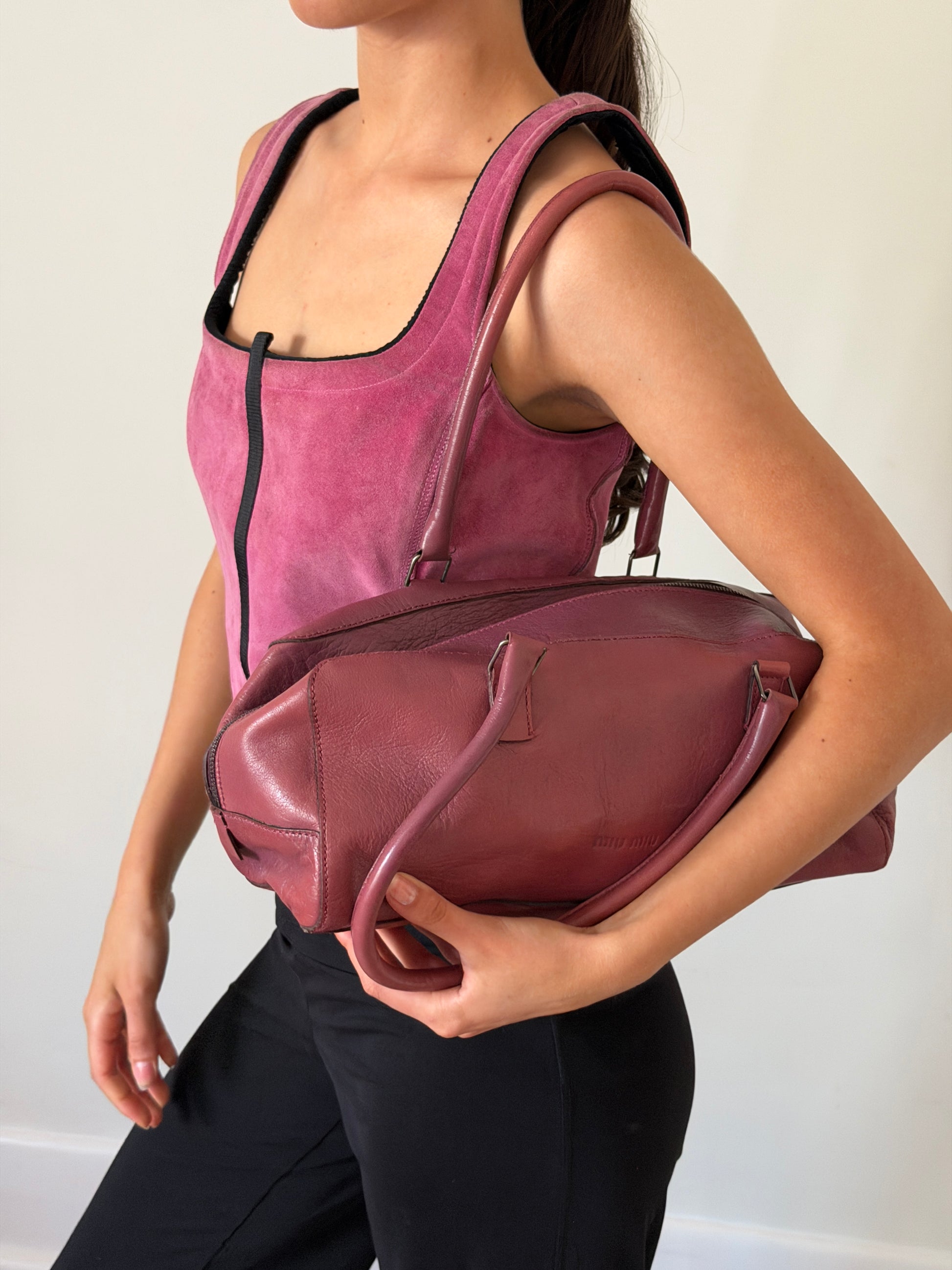 90s miu miu rose leather handbag with double top handles and a soft structured body. genuine leather outer and brown suede leather inside. classic shape with natural wear and a visible water mark near the logo