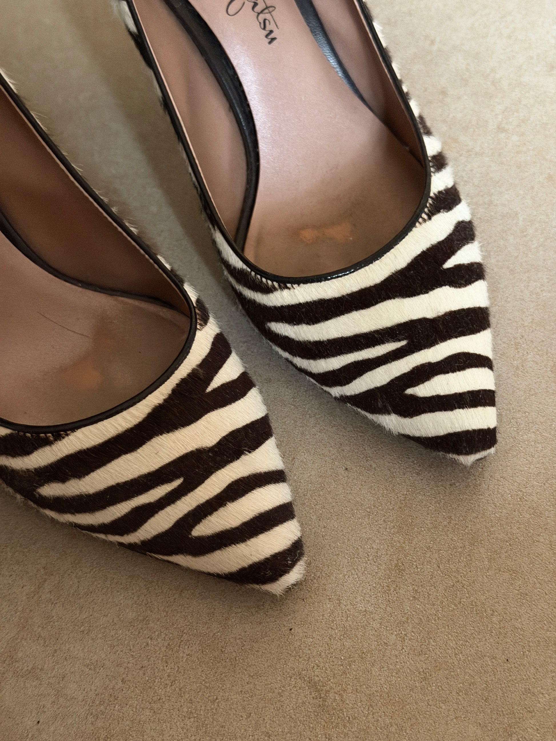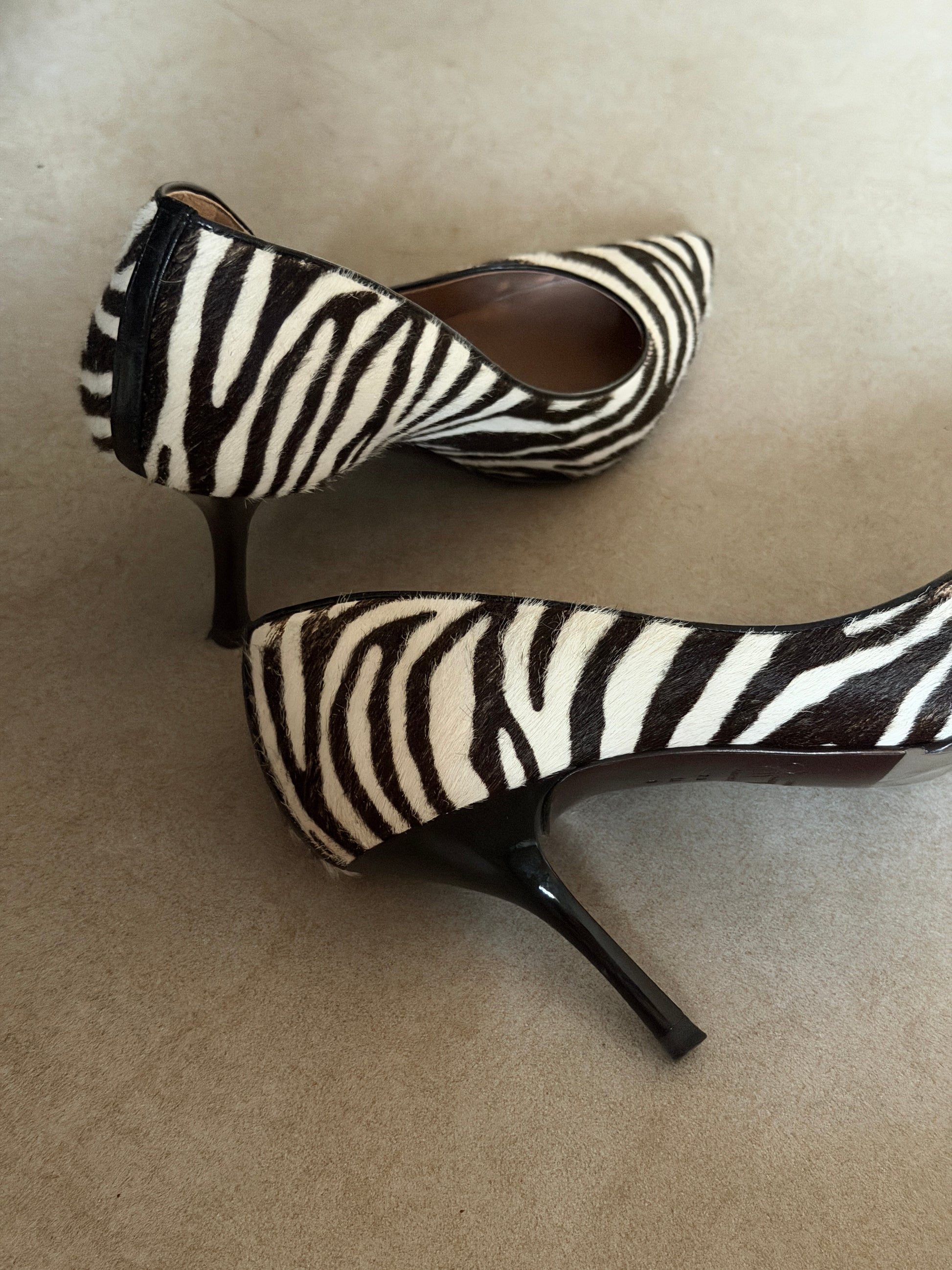 pony hair pointed-toe heels in a bold zebra pattern, genuine pony hair with a elongated silhouette and slim mid heel. light signs of wear throughout, including subtle sole wear and natural texture variation consistent with age and use