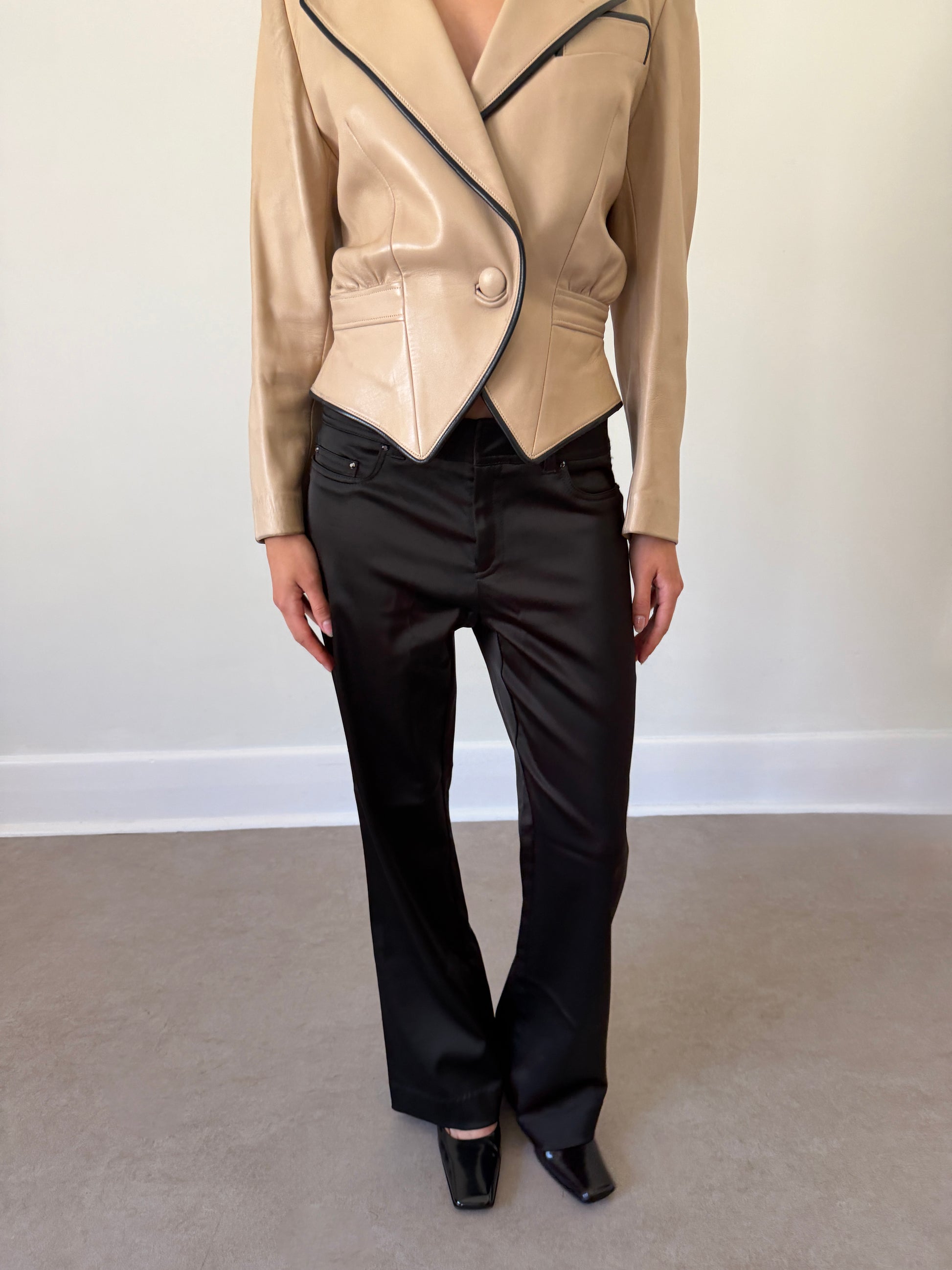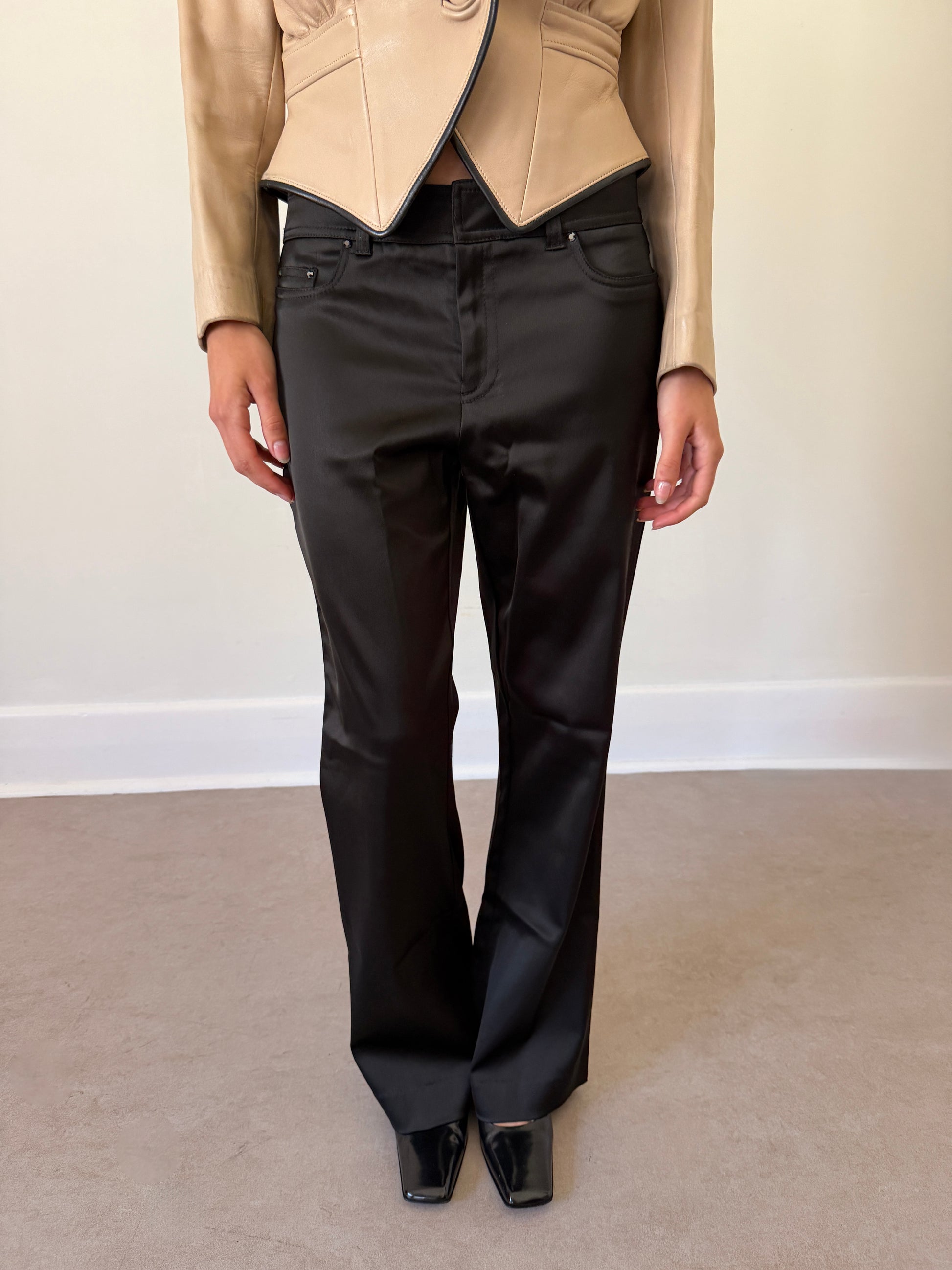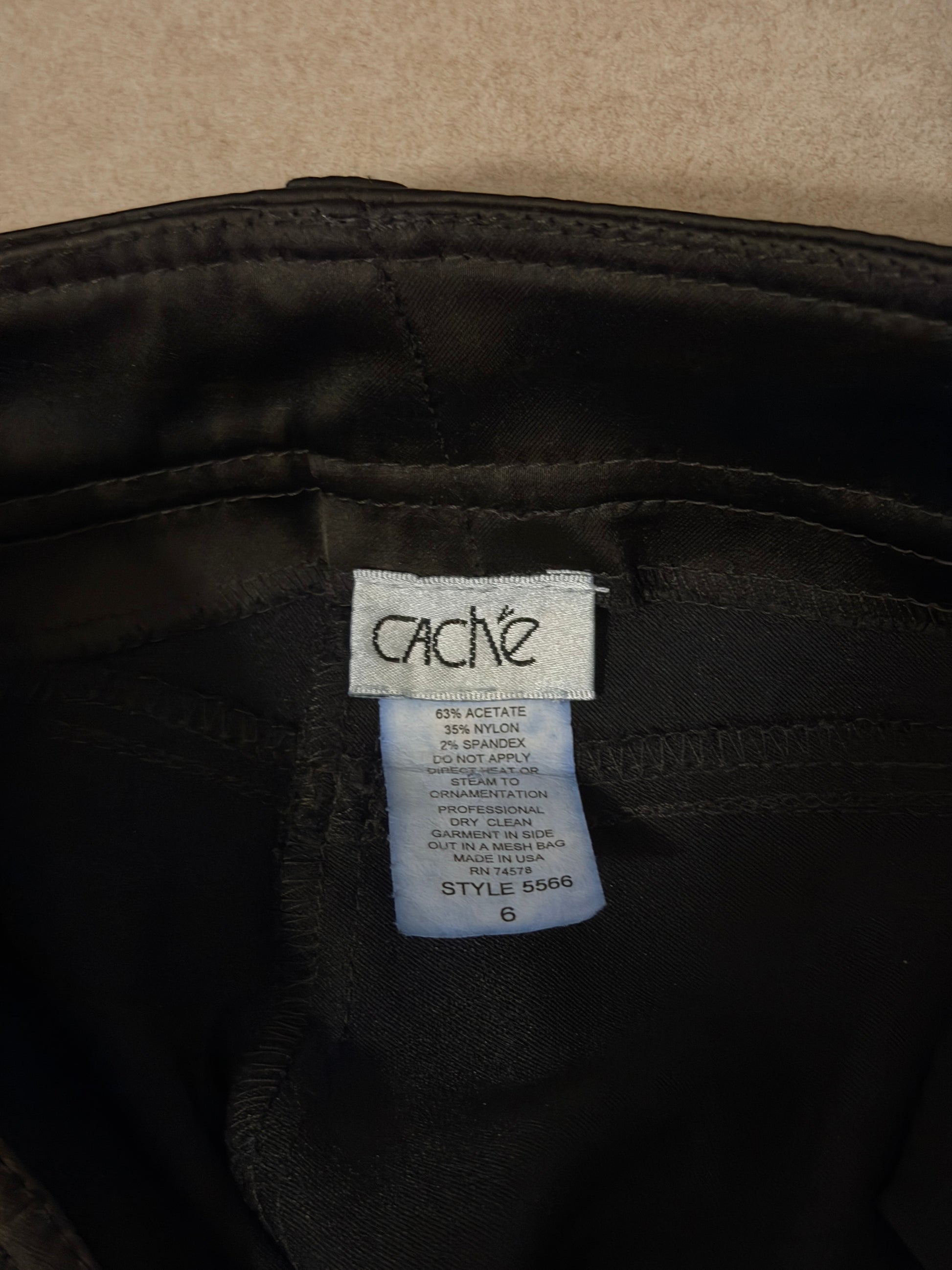 cache 90s satin pants in a fluid black acetate-blend with a subtle sheen, cut with a straight-leg silhouette and a smooth mid-rise waist. softly structured through the hip with gentle stretch, falls cleanly over the shoe for an elongated line. minimal signs of wear throughout, consistent with age, made from acetate, nylon, spandex