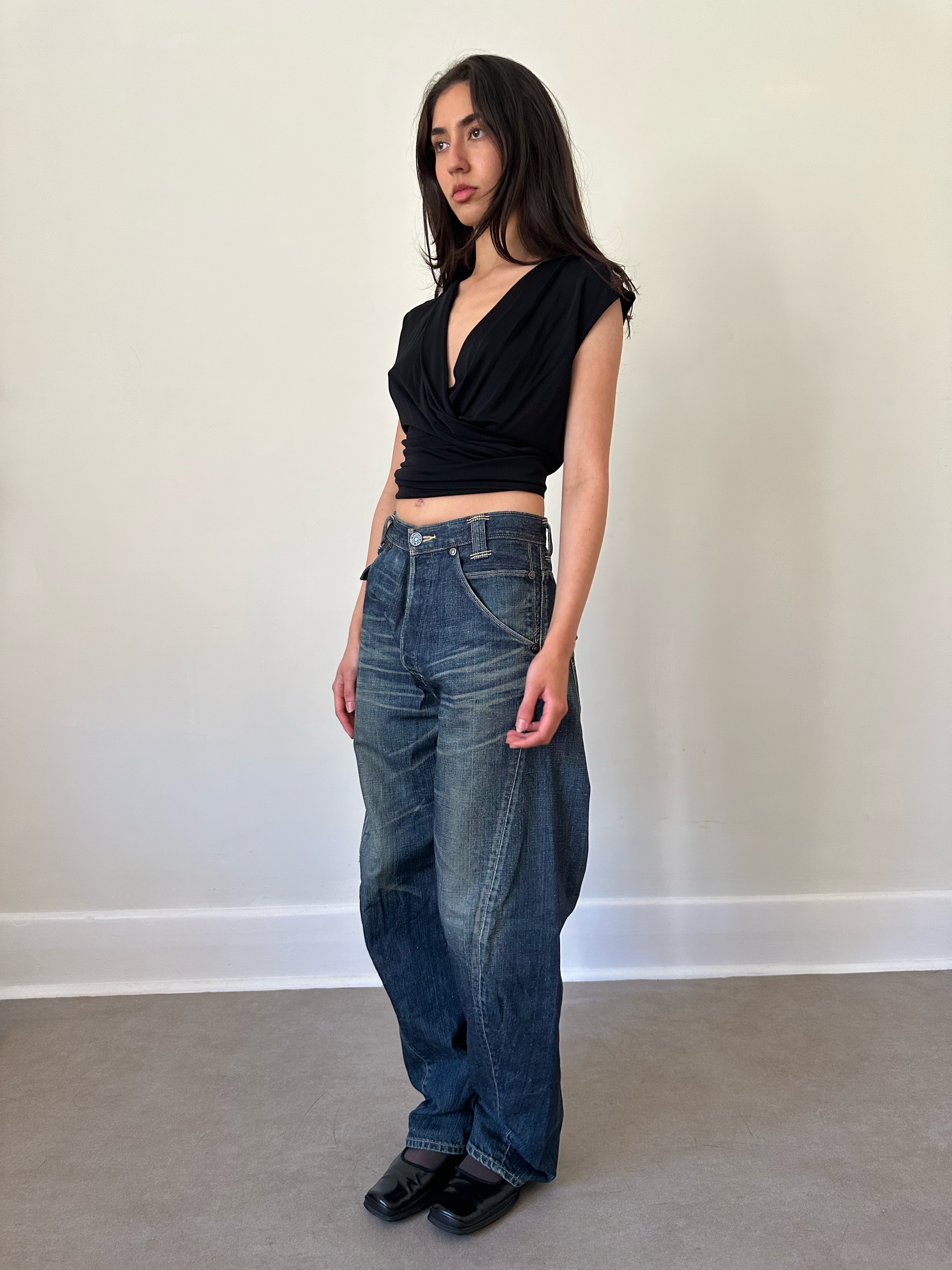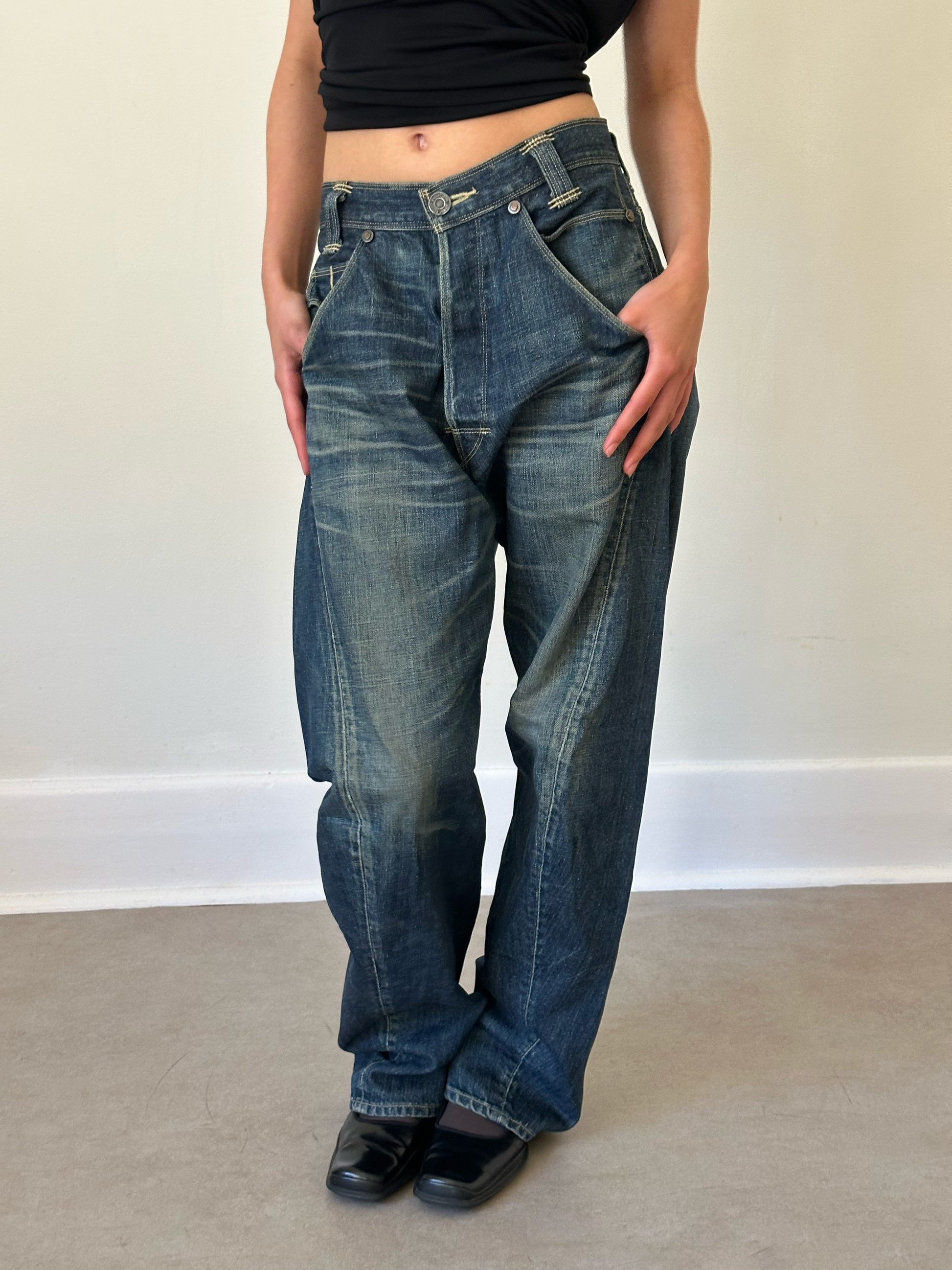 levi’s engineered jeans dark blue straight-cut denim with signature back panel construction. features distinct back pocket design, belt detailing, and zipper vents at the back hem. made from heavy washed cotton denim with natural fading. in great vintage condition