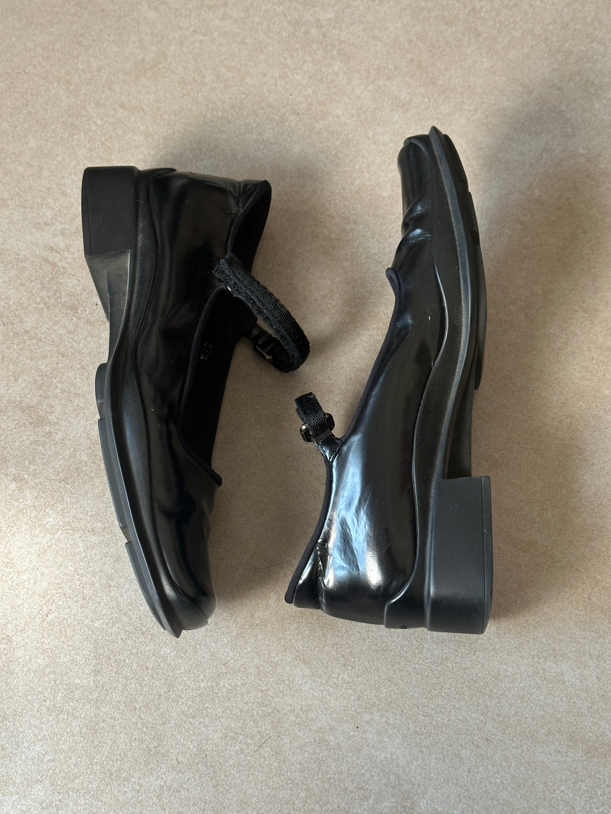 prada mary janes, crafted in italy from supple black leather. sculptural silhouette with a low 3cm block heel, elastic strap detail, and soft rounded edges. good condition with light signs of wear, scratches and sole use as pictured