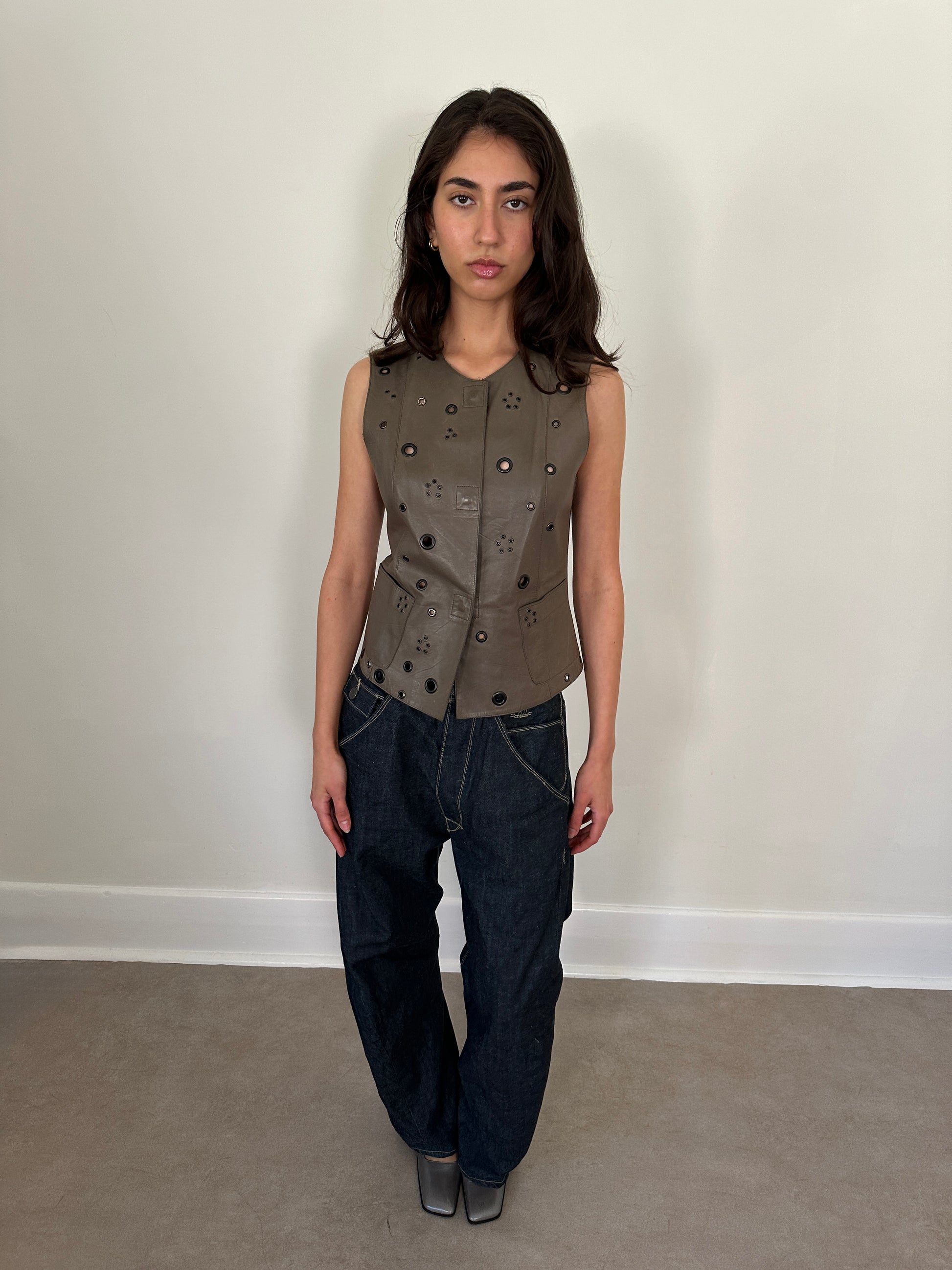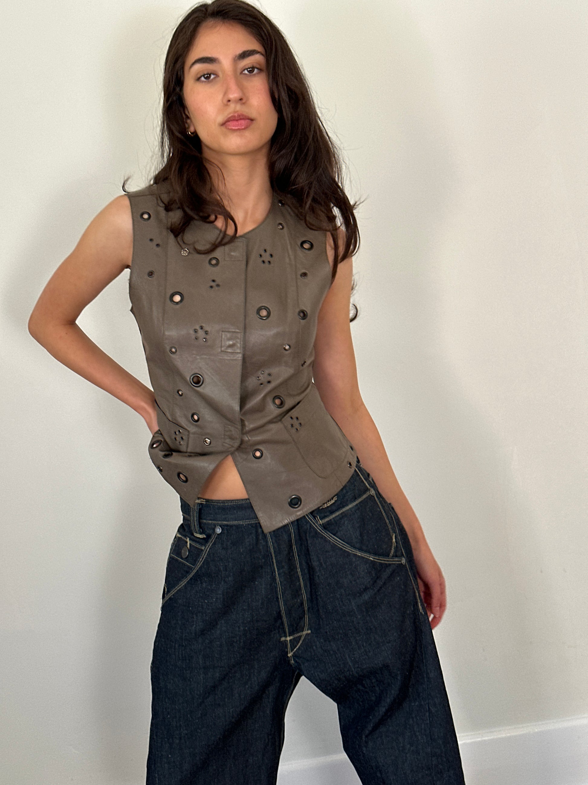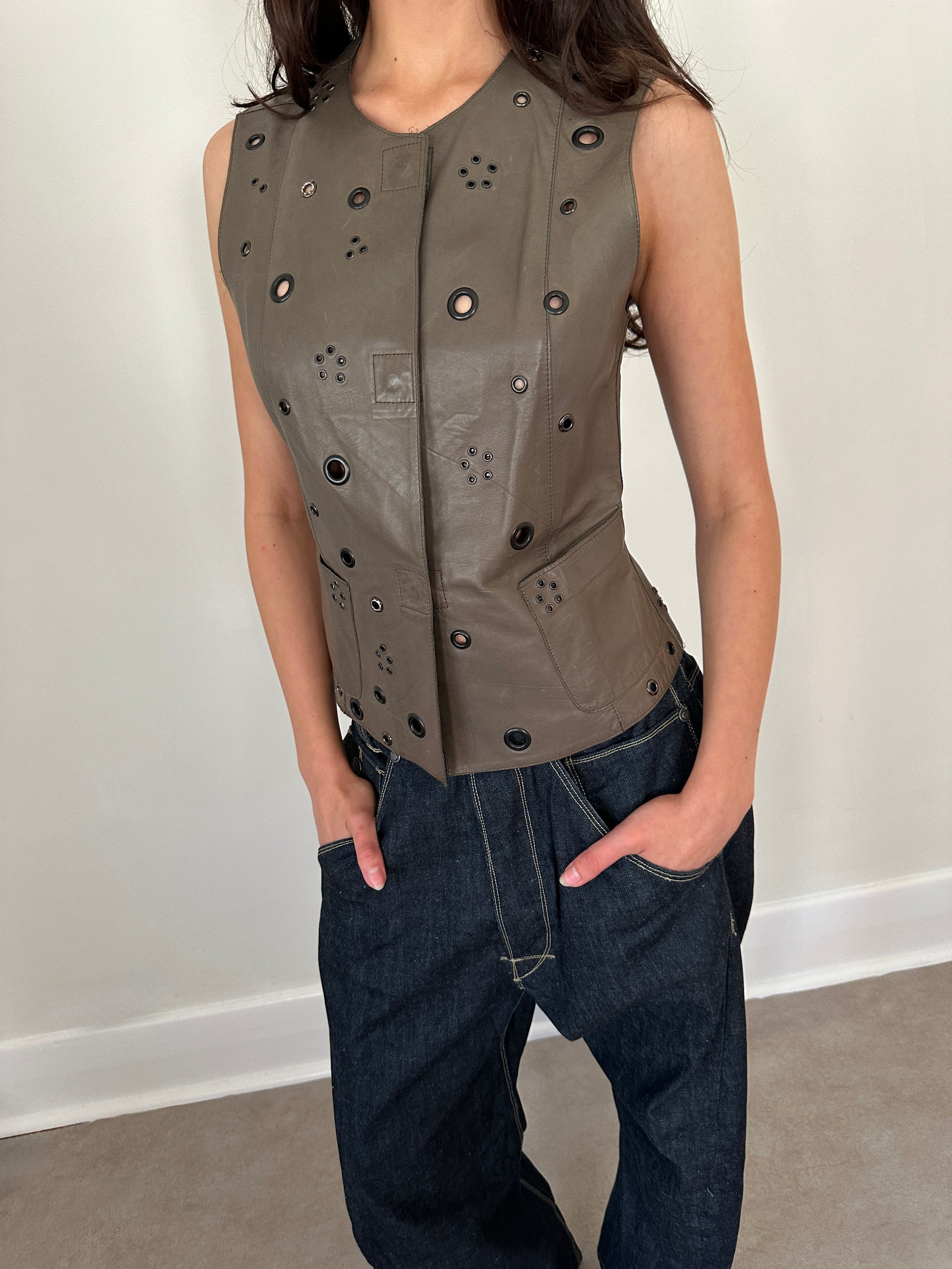 sylvie schimmel khaki lamb leather vest featuring multi-sized eyelet hardware and front pockets. supple lambskin with a structured fit and industrial detailing throughout. finished with a concealed snap closure. made in france, good vintage condition with minor wear including small surface scratches and slight paint loss on some eyelets