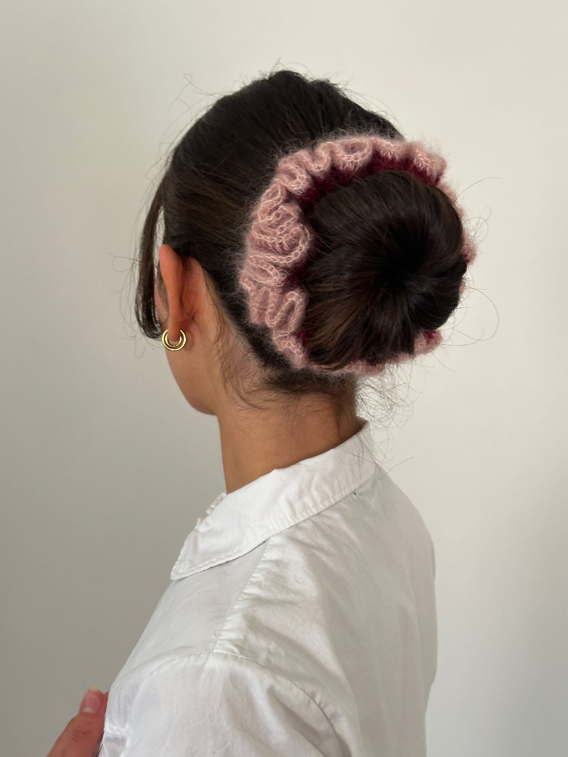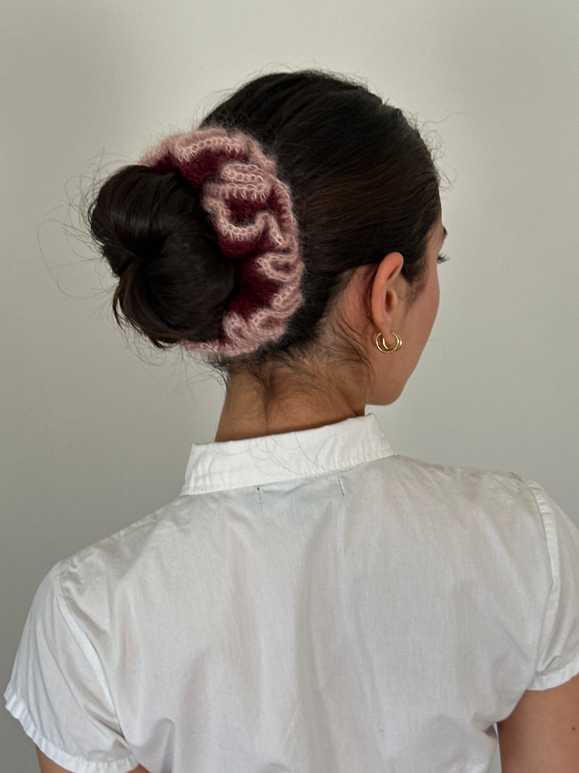 handmade crochet scrunchie in burgundy with lace pink trim. made with premium 75% mohair 25% silk yarn.