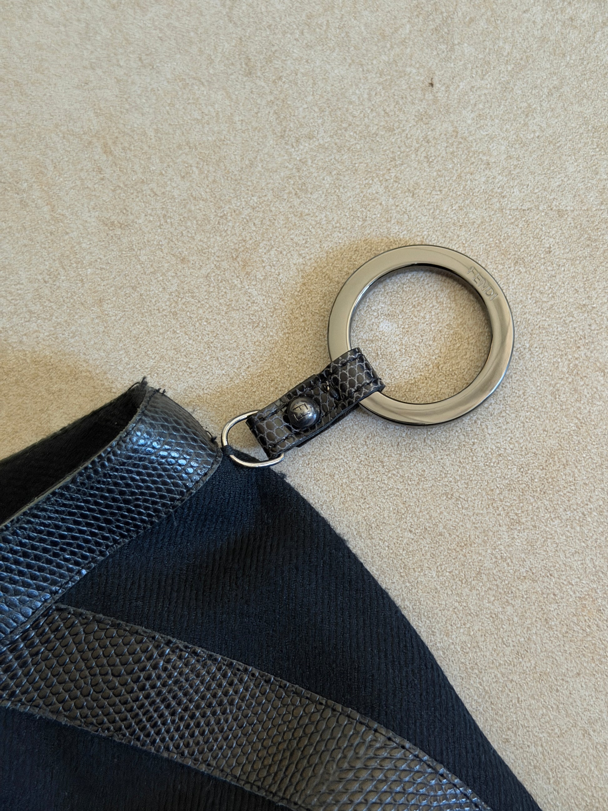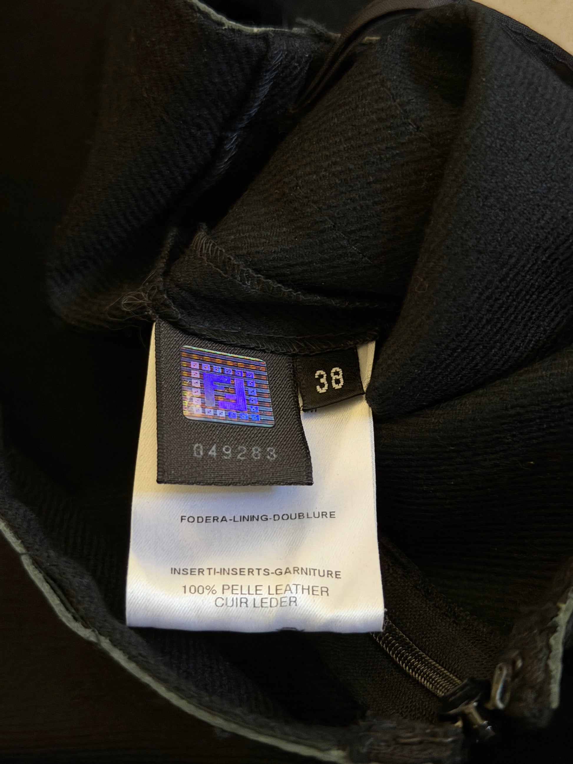fendi fall 2003 leather pants in black, cut with a clean, elongated straight-leg silhouette and a mid-rise waist. crafted from wool with a lined snakeskin leather finish and refined structure through the leg, designed to fall fluidly with a sharp, tailored line. minimal construction with subtle side panel detailing and a streamlined waistband