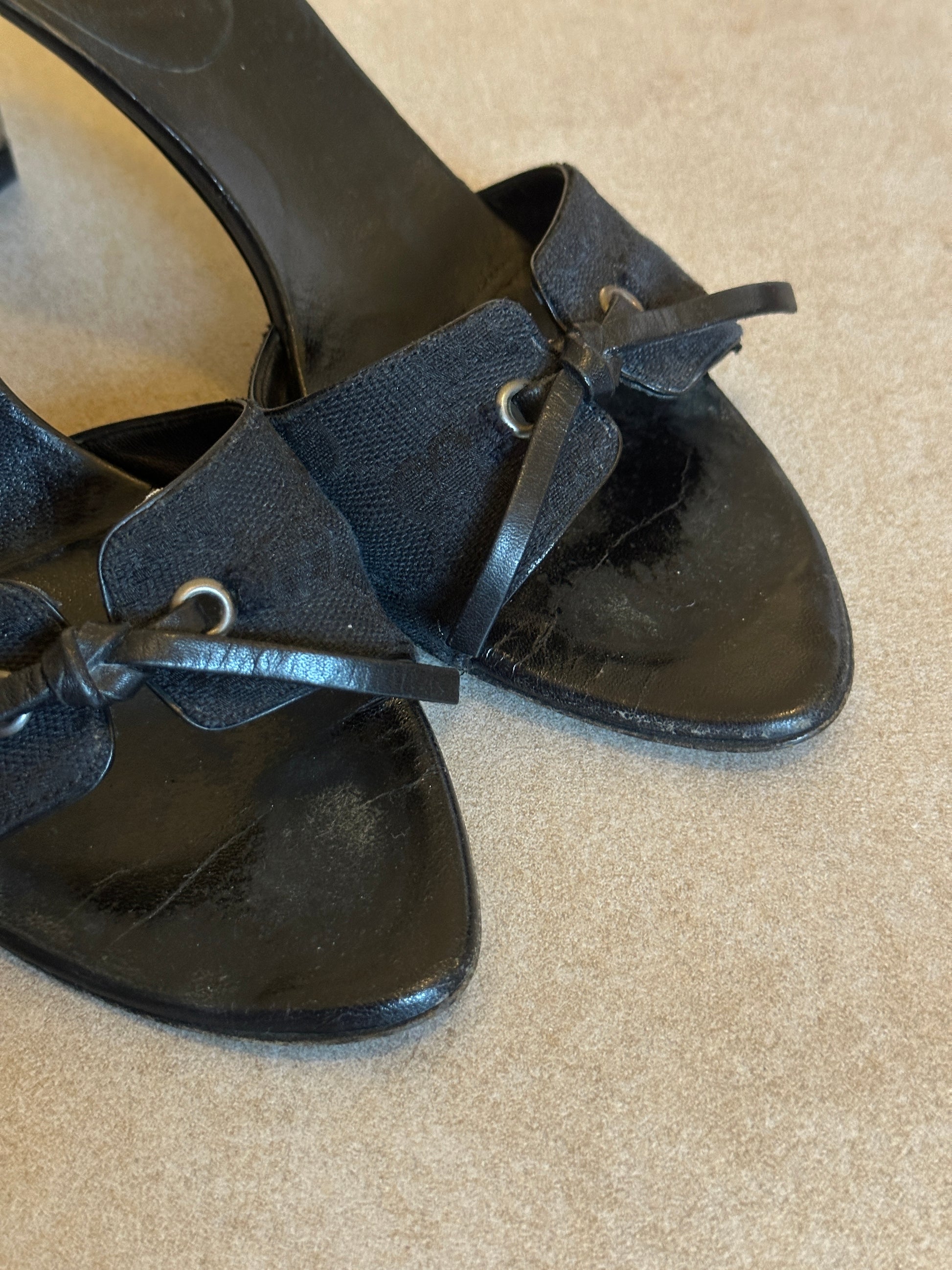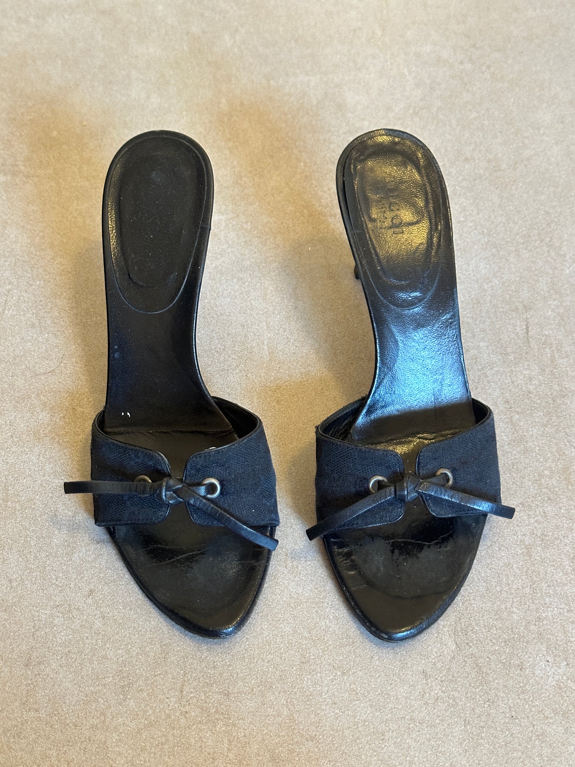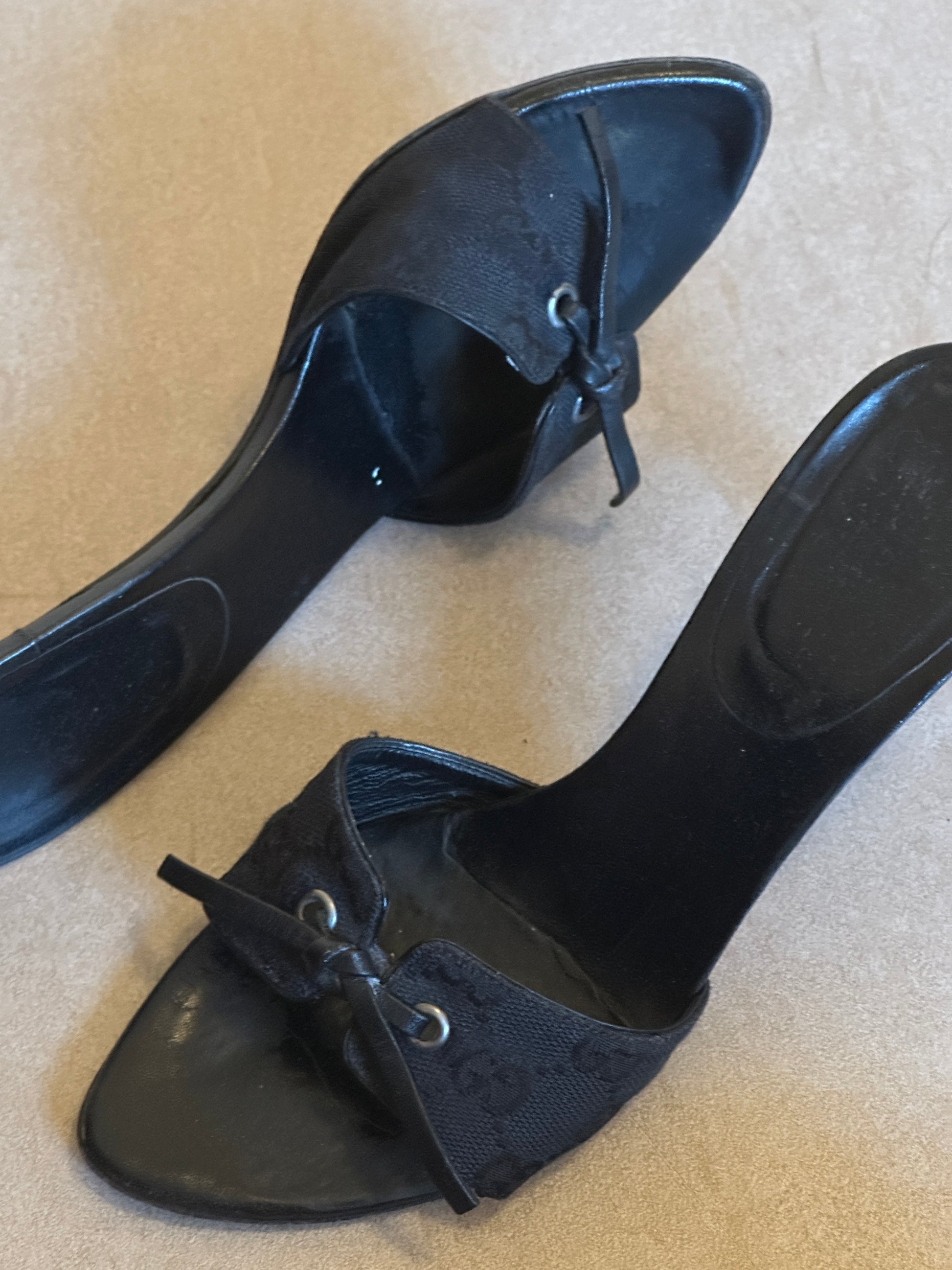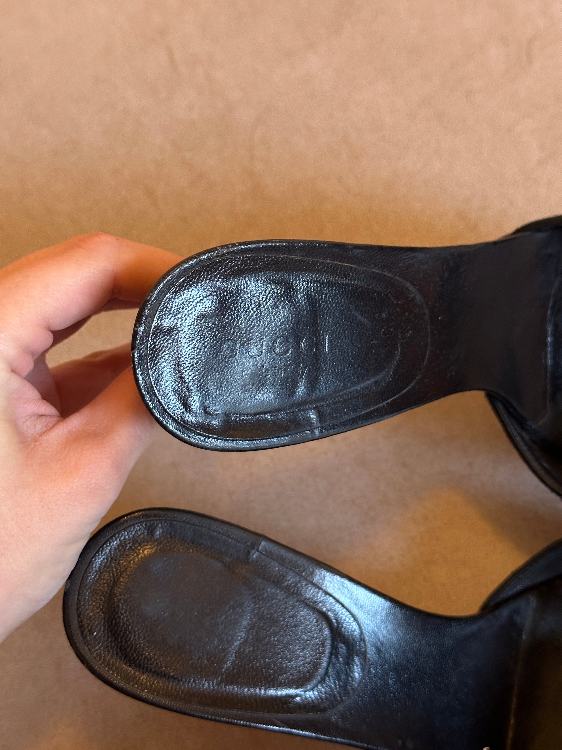 gucci black mules featuring signature gg jacquard pattern combined with a leather ribbon accent. bella hadid wore the orange in cannes. condition is heavily worn — the heel is scraped, and there are visible signs of use on the insoles and toes.