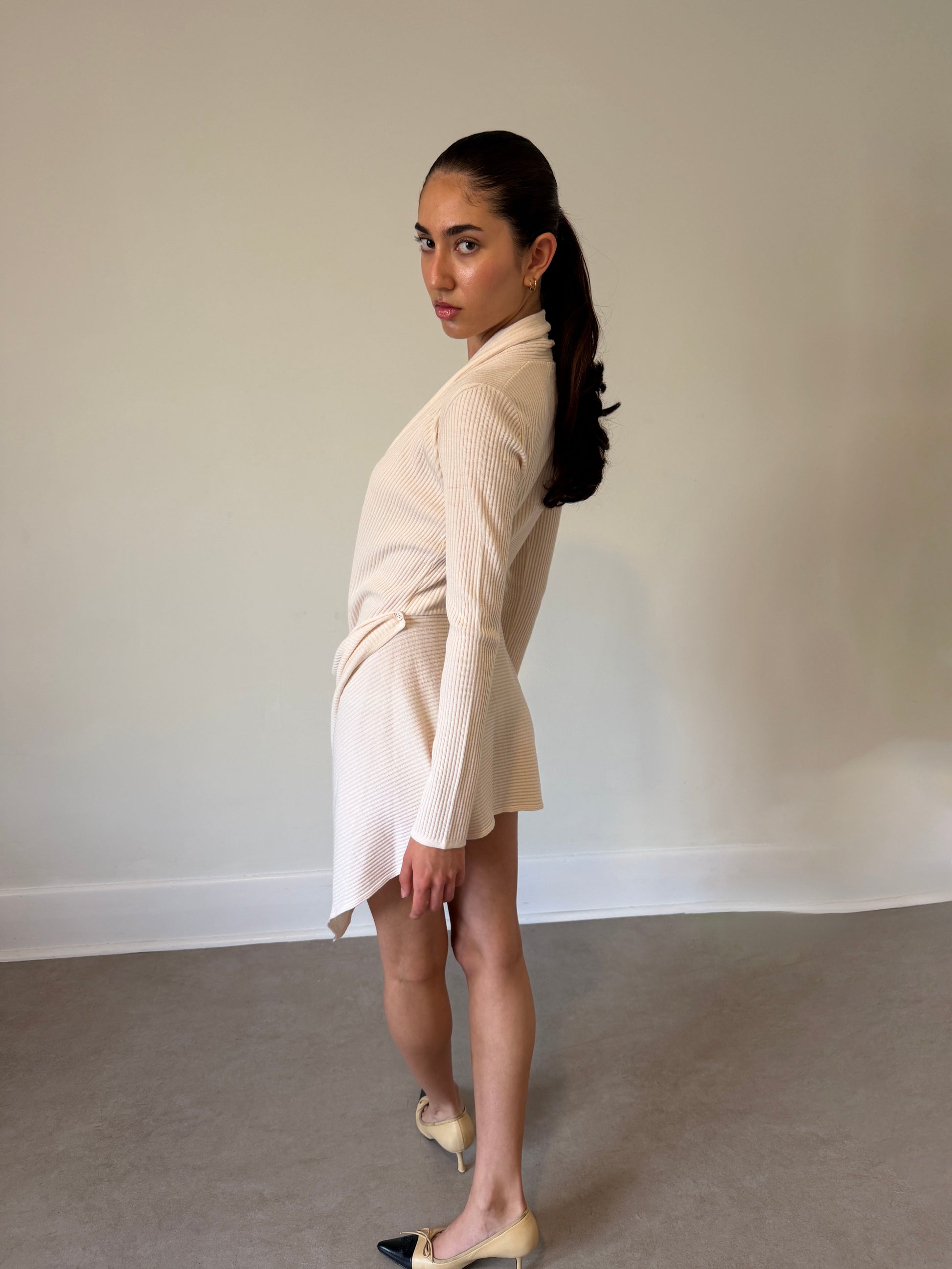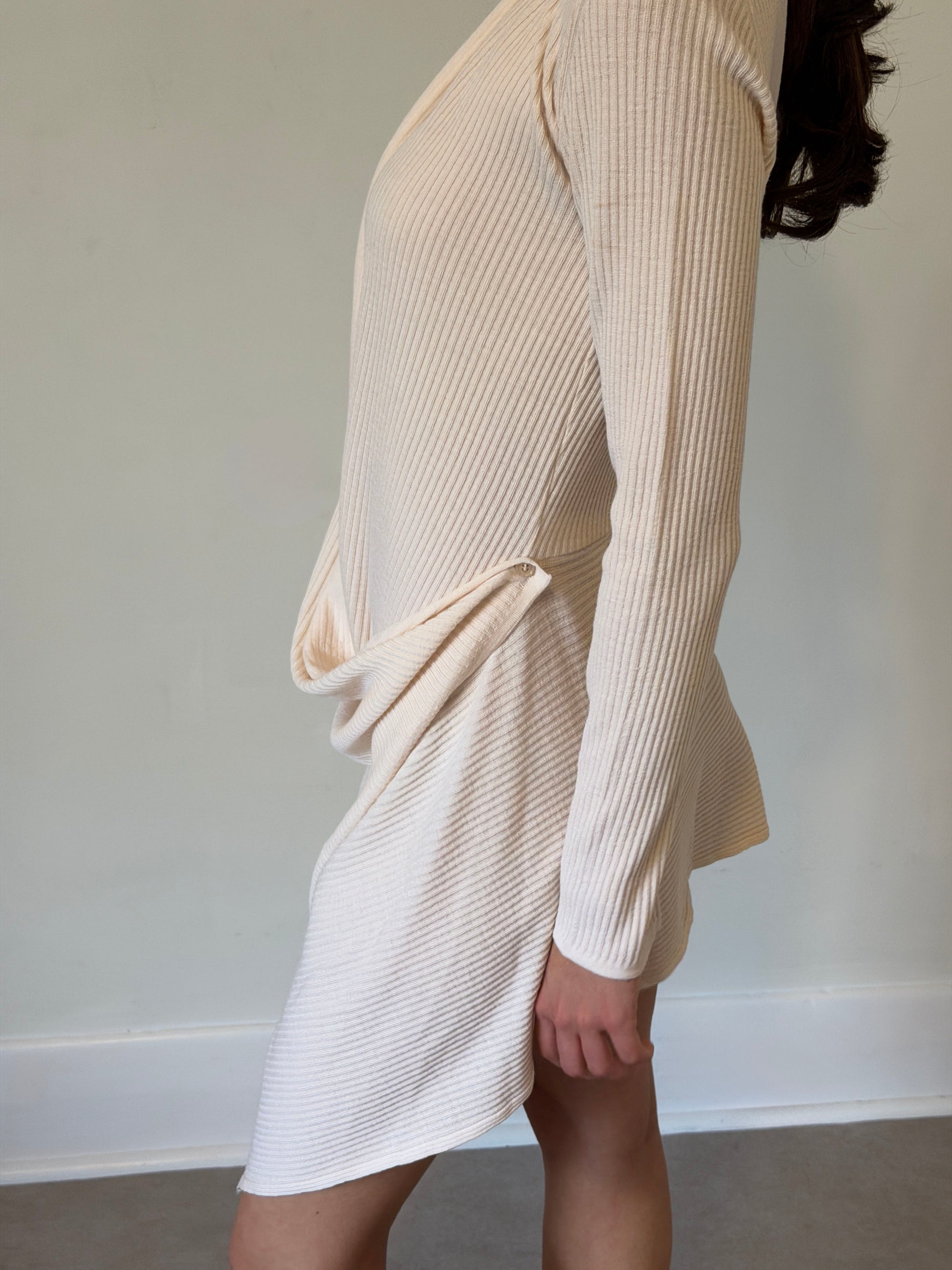 italian 2000s merino wool drape knit dress in soft ivory, cut with a fluid, body-skimming silhouette and an asymmetric hemline. designed with a deep draped front that creates a clean vertical line through the body, offering a naturally elongating effect. crafted from 100% italian merino wool with a subtle sheen and smooth, lightweight hand feel. versatile construction allows the piece to be worn as both a dress or an open cardigan. long sleeves with gentle stretch and soft structure throughout