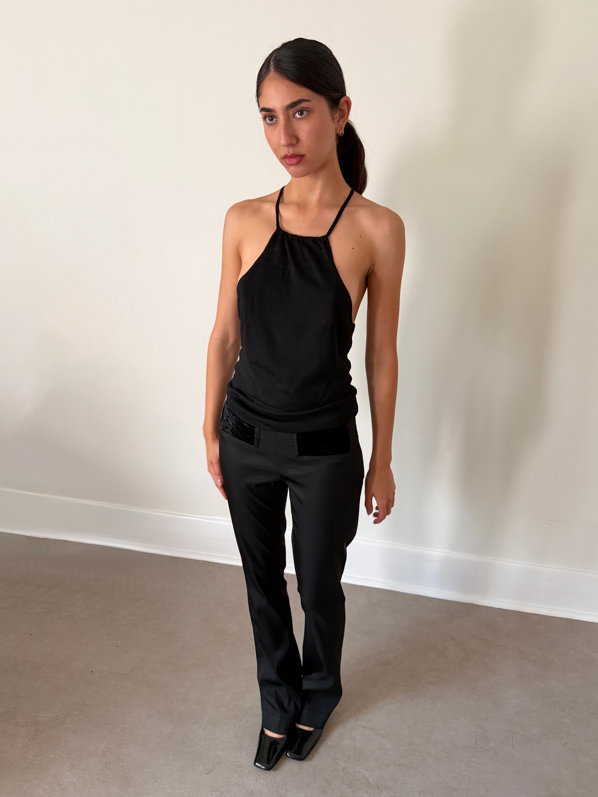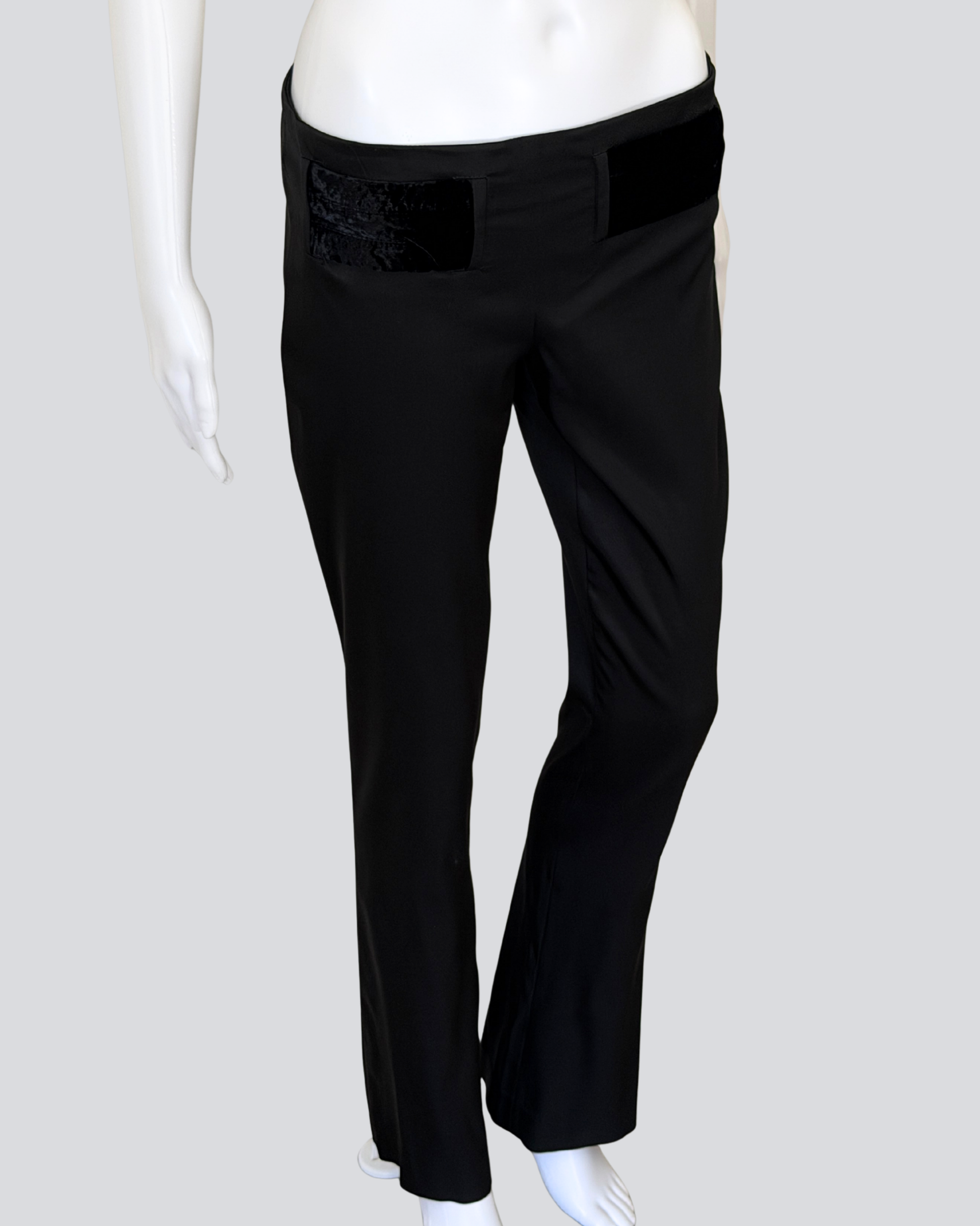 gucci tom ford black flare pants with velour belt detail at the back waist. clean straight to flare fit with a subtle sheen, good vintage condition with light surface wear.