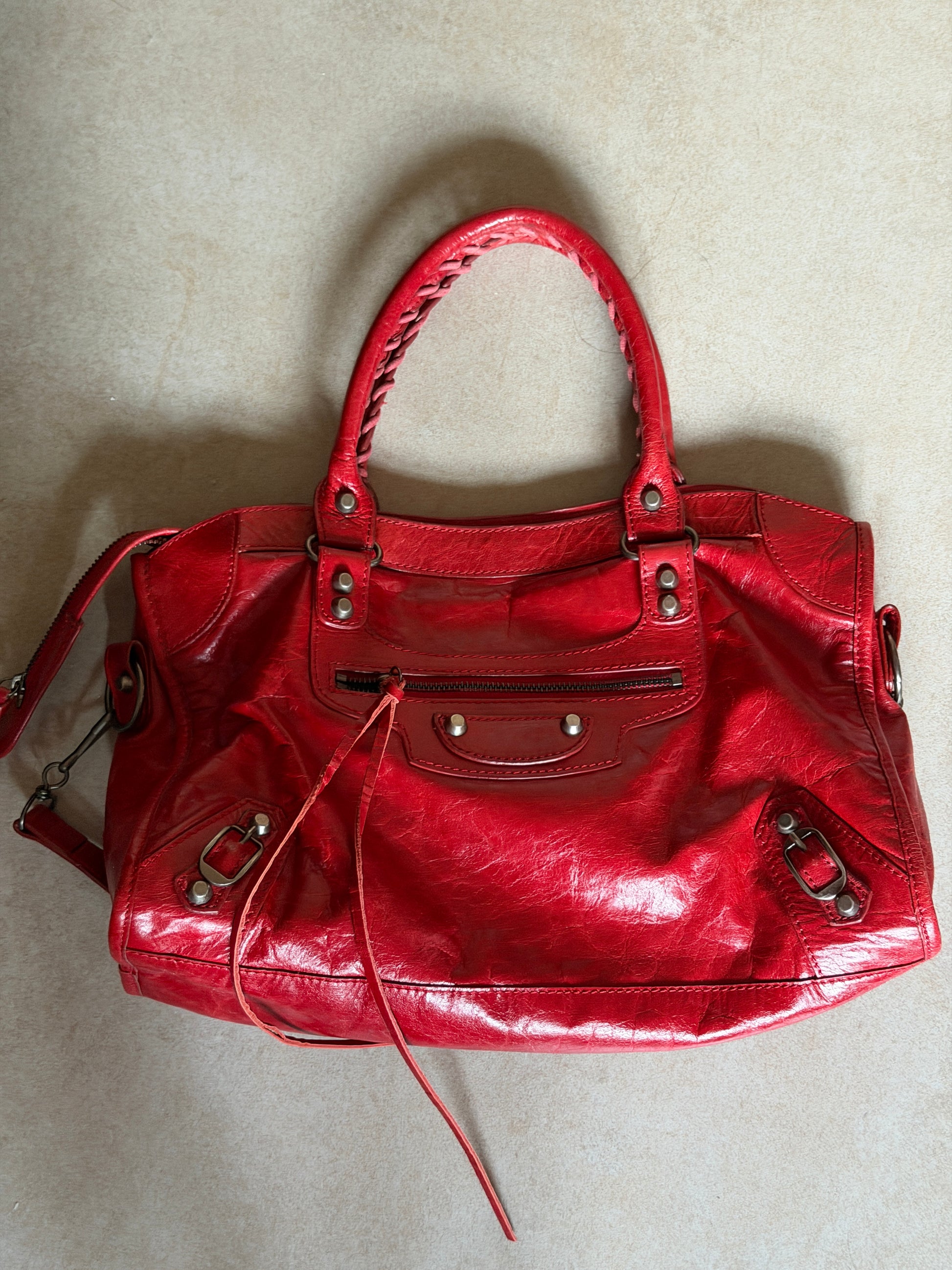 'lush' city style shoulder bag in red genuine lamb leather, slouchy silhouette, front zip pocket with stud detailing, braided top handles, and detachable shoulder strap. comes with the hanging mirror. soft, broken in leather with visible creasing and wear throughout, consistent with authentic early-2000s city-style bags