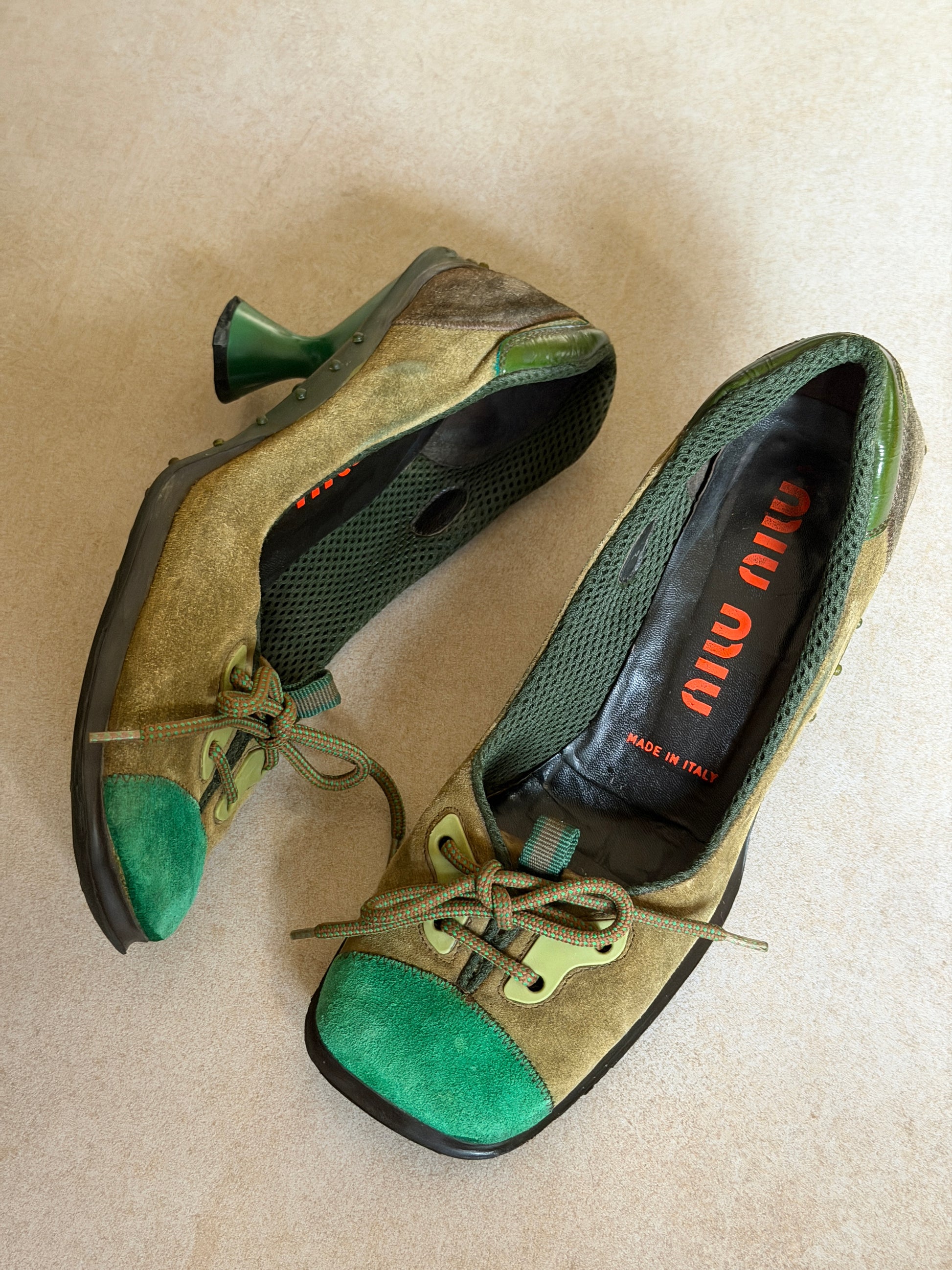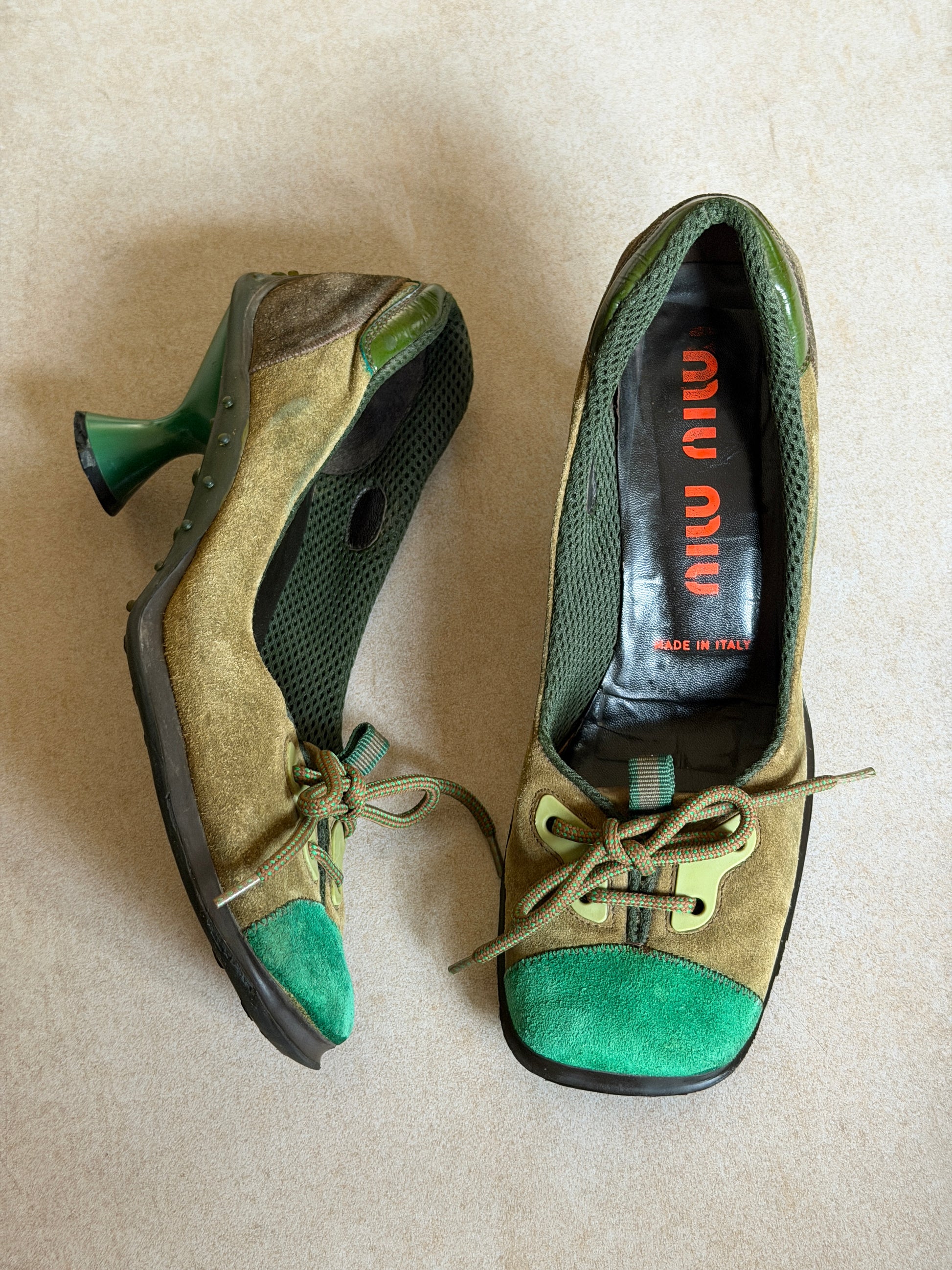 miu miu fall winter 1999 square toe lace up pumps in green suede, designed with a sculptural flared heel and rounded square toe. lace-up front with contrast suede panelling and rubberised sole details, finished with the distinctive butterfly-like heel shape seen in late-90s miu miu runway footwear. visible signs of wear throughout, sole marks, and light abrasions, consistent with age and use, heel caps have been replaced for optimal wear *ships end of next week