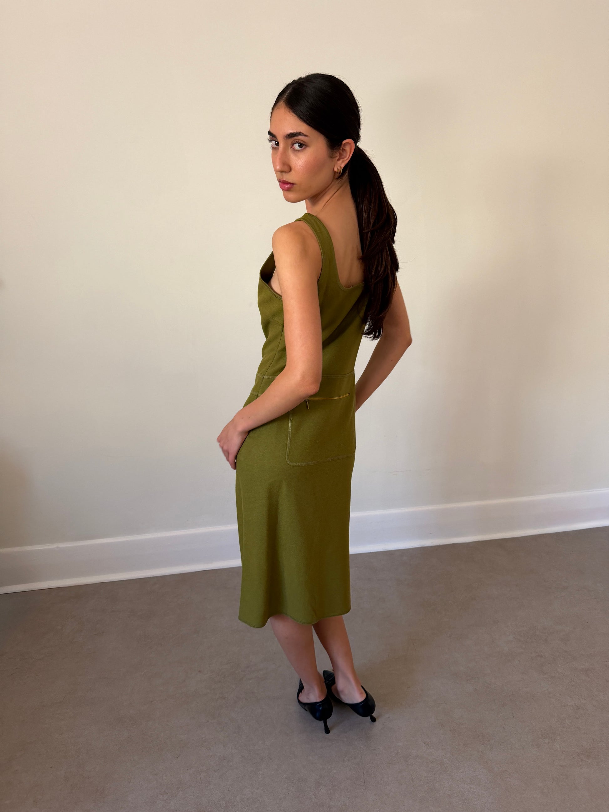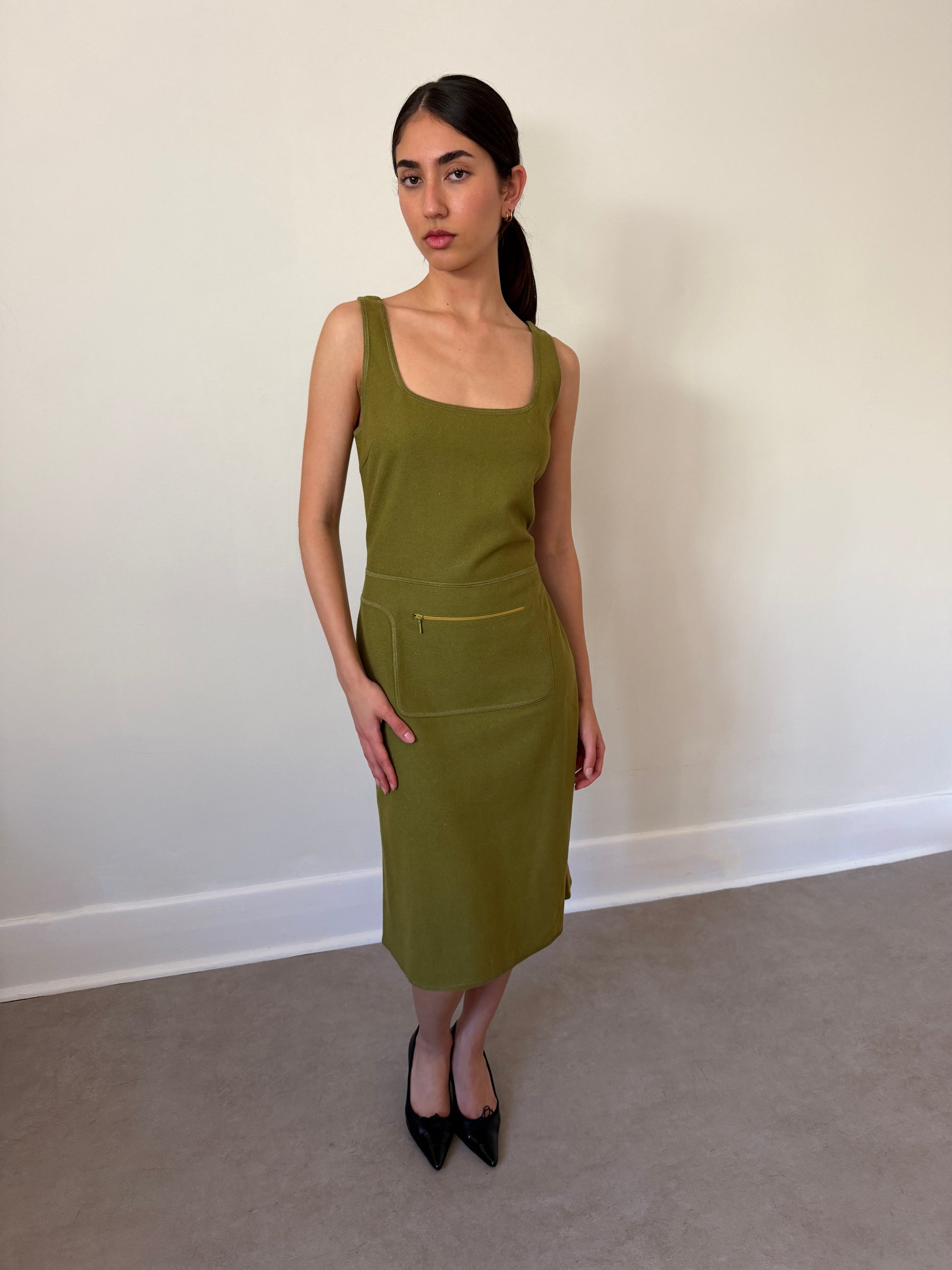 miu miu fall winter 1999 sleeveless dress in a muted khaki wool blend, cut with a straight, minimal silhouette and a clean crew neckline. knee-length, finished with a front patch pocket at the back and from with soft structure through the body. gentle signs of wear throughout, including light fraying and small marks
