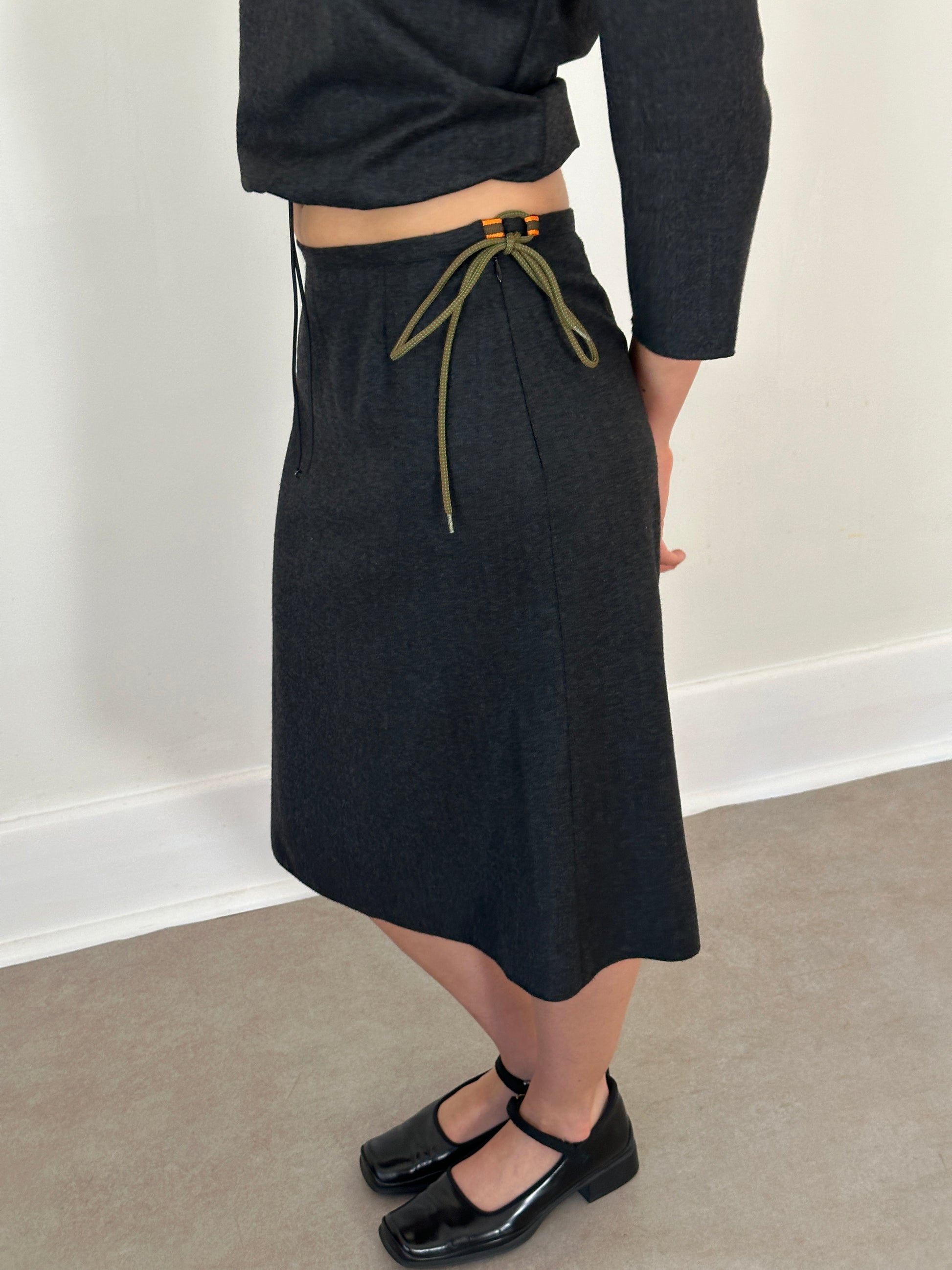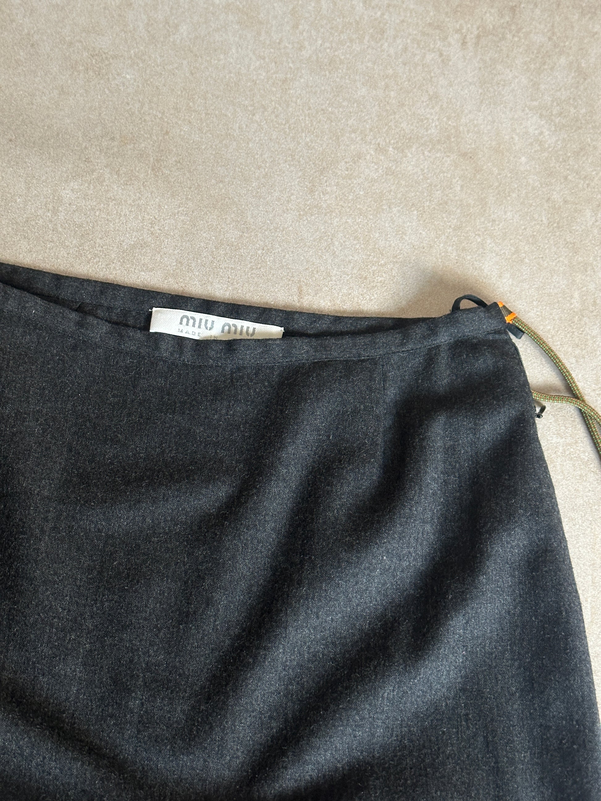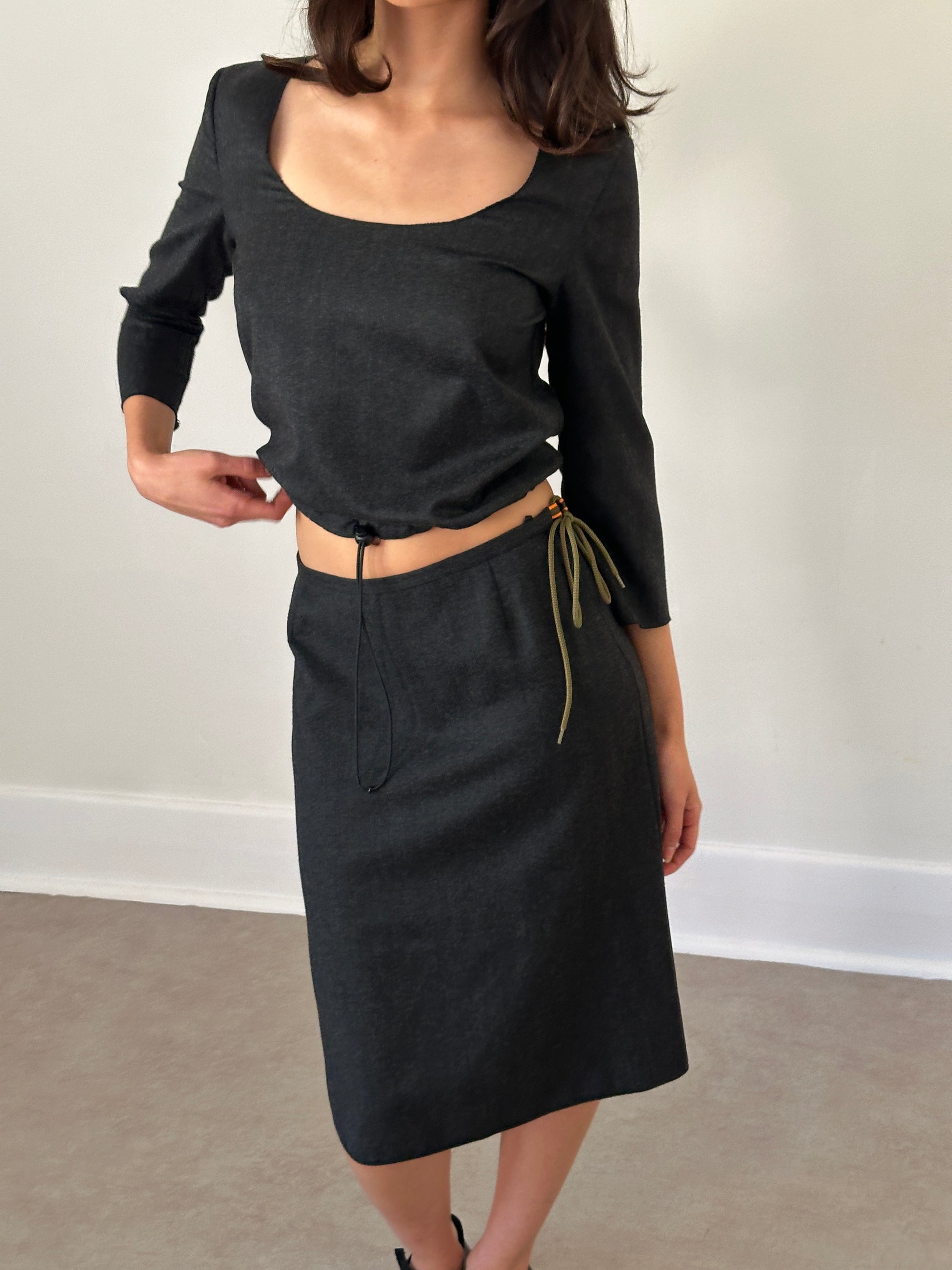 miu miu two-piece set, features a soft dove grey hue with a three-quarter sleeve top and matching midi skirt. the top includes an adjustable drawstring hem for a cinched silhouette, while the skirt has a side zipper and removable cord ribbon detail. light signs of use under the arms consistent with age, otherwise in beautiful vintage condition.