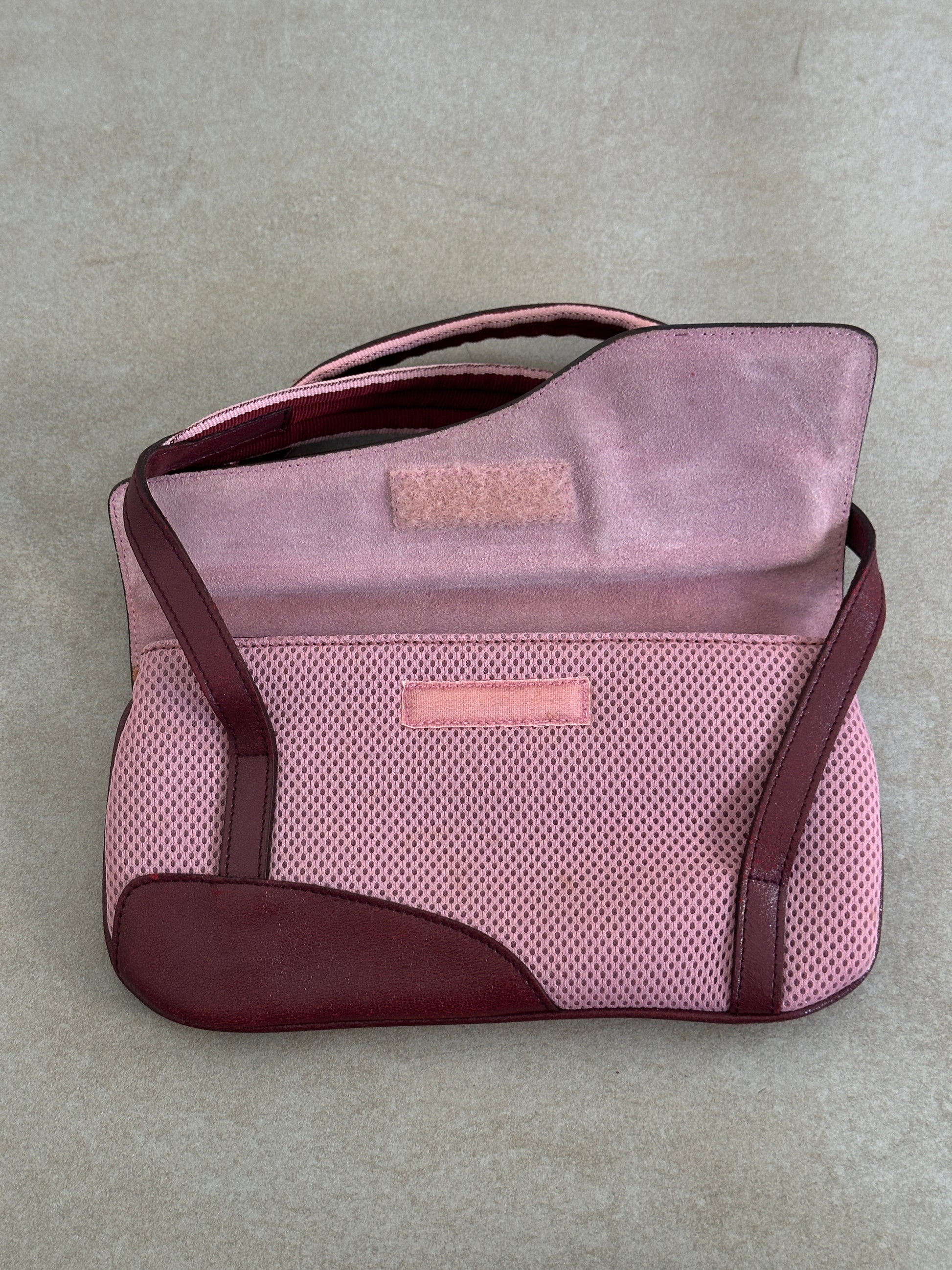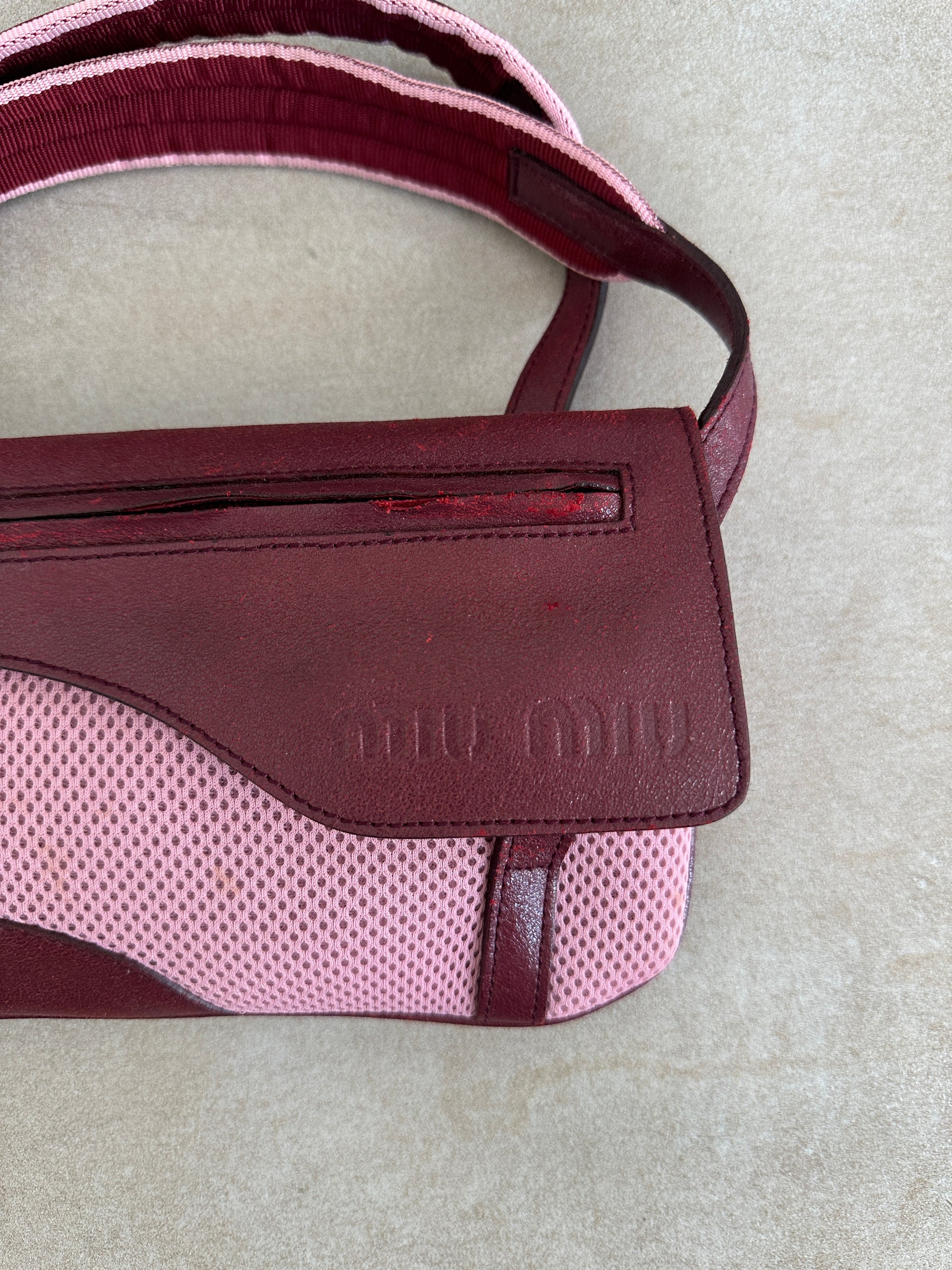 archival spring summer 2000 design in pink technical mesh with curved burgundy synthetic leather overlays. features a structured rectangular body with dual top handles, zip-top closure with branded pull, and tonal embossed miu miu logo at the front