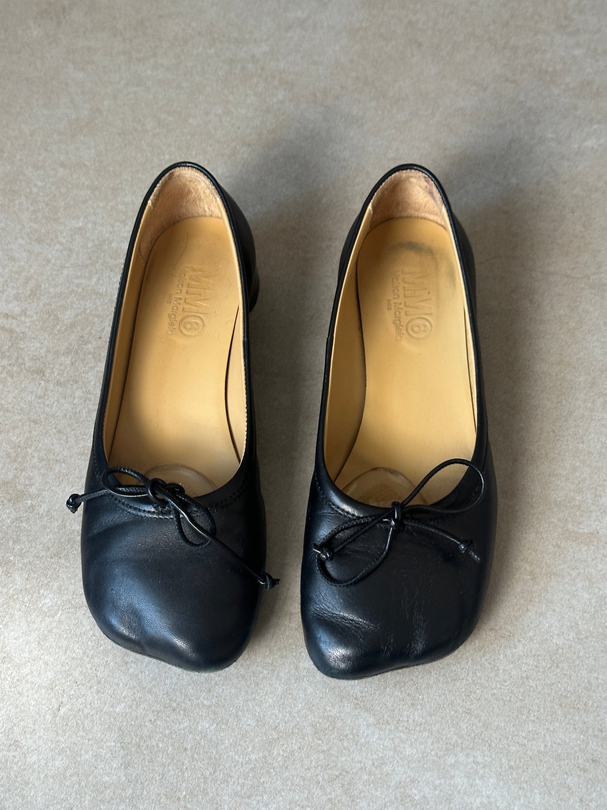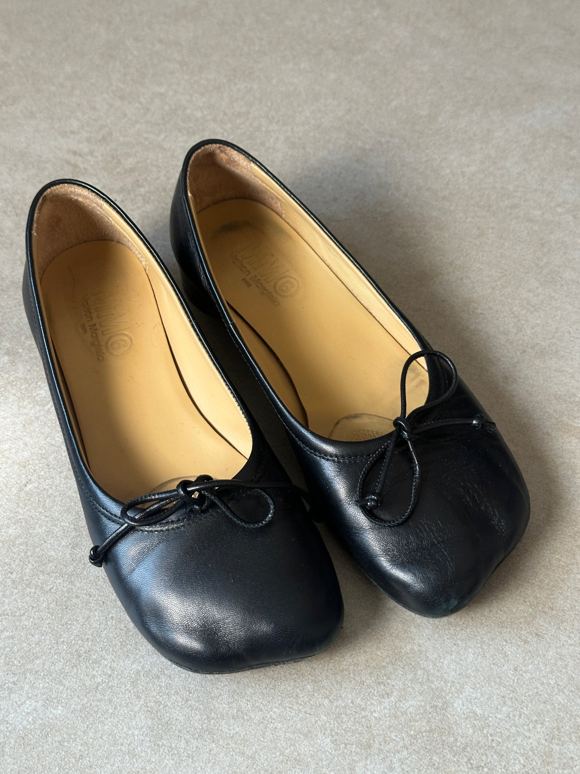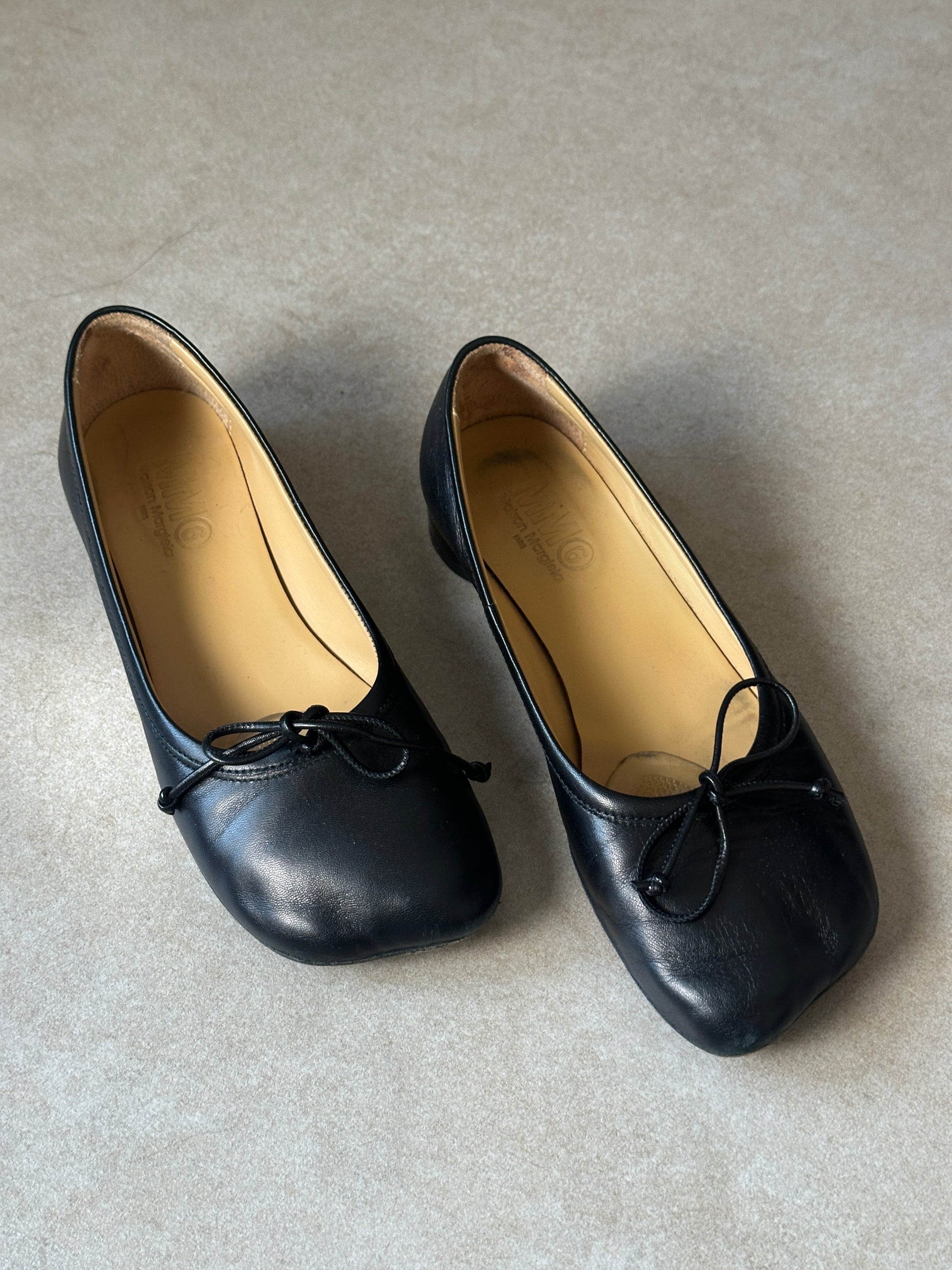 mm6 maison margiela classic black ballet flats, made in italy from smooth calf leather. feature a rounded square toe, delicate bow detail, and signature internal leather lining for comfort. finished with a low-profile rubber sole. timeless and versatile design. excellent condition with light wear, sole use and scratches as pictured