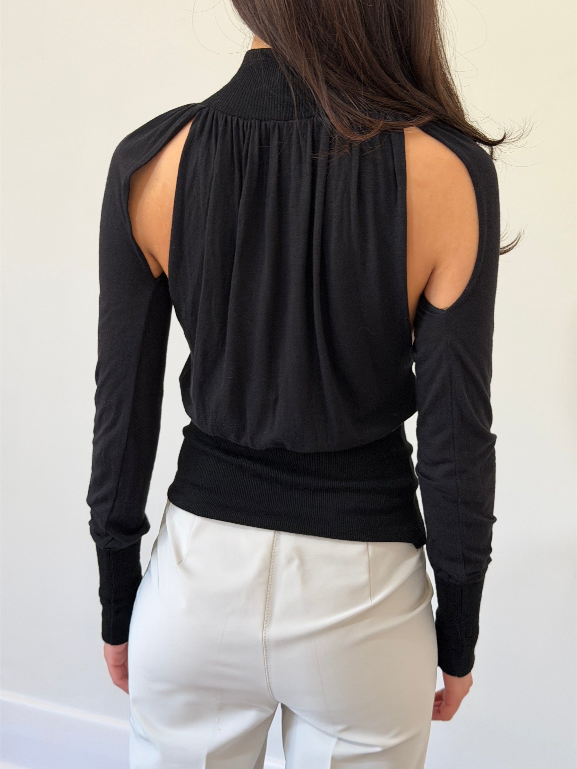 vintage patrizia pepe cut-out top crafted in a soft lightweight knit. designed with a high gathered neckline, sculptural shoulder cut-outs and a dramatic front slit that creates an elegant draped silhouette through the waist. a striking minimal piece that pairs effortlessly with tailored trousers or denim. made in italy