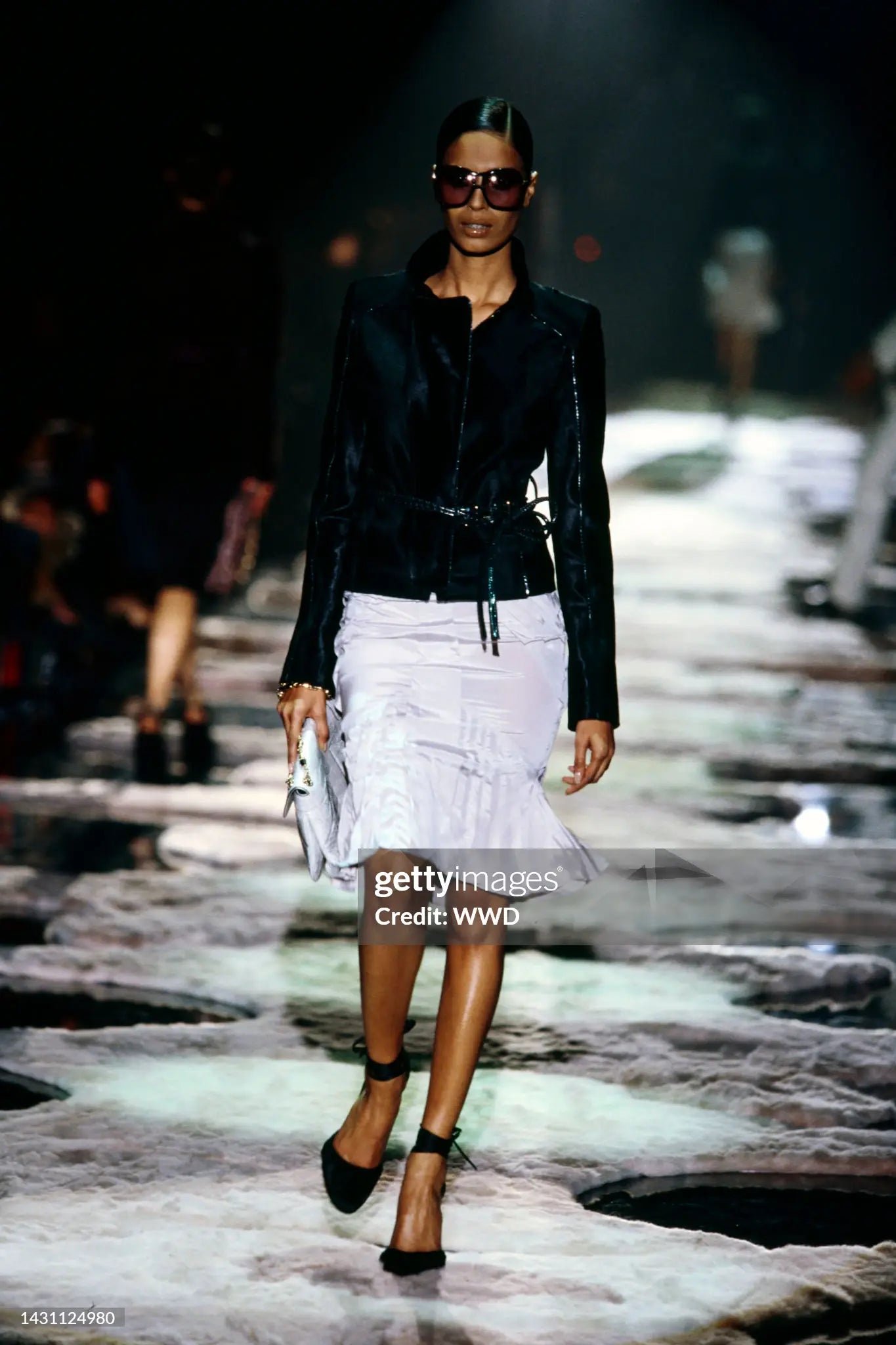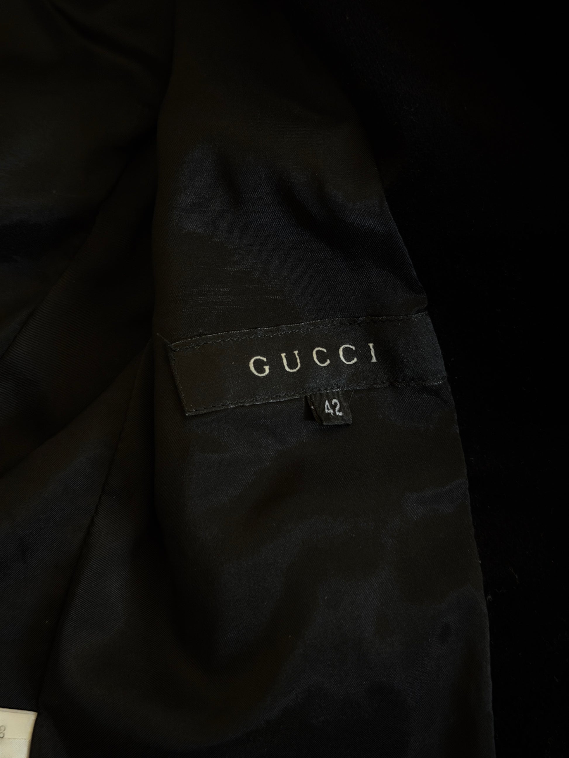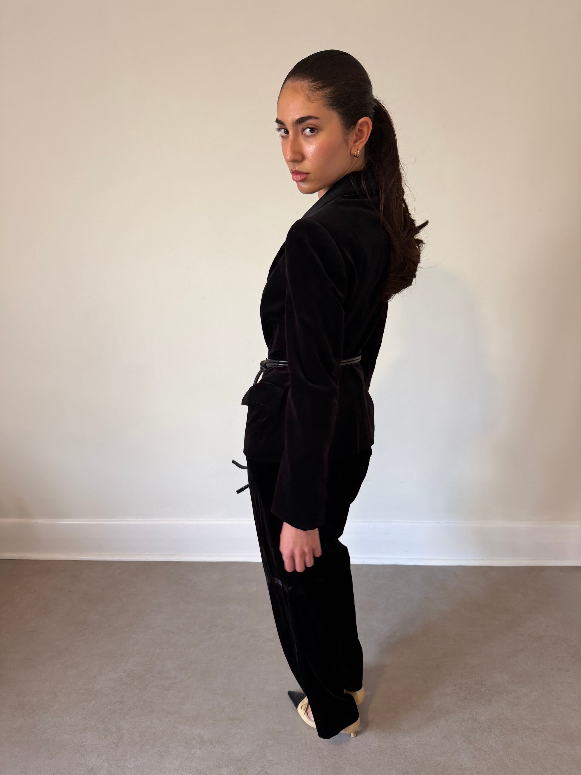 gucci fall 2004 velour tailored jacket in black velvet, cut with a structured, sculptural silhouette and finished with a peak lapel collar. designed with a leather rope belt featuring a gold buckle closure that cinches the waist. fully lined interior with soft structure through the body. gentle signs of wear consistent with age.