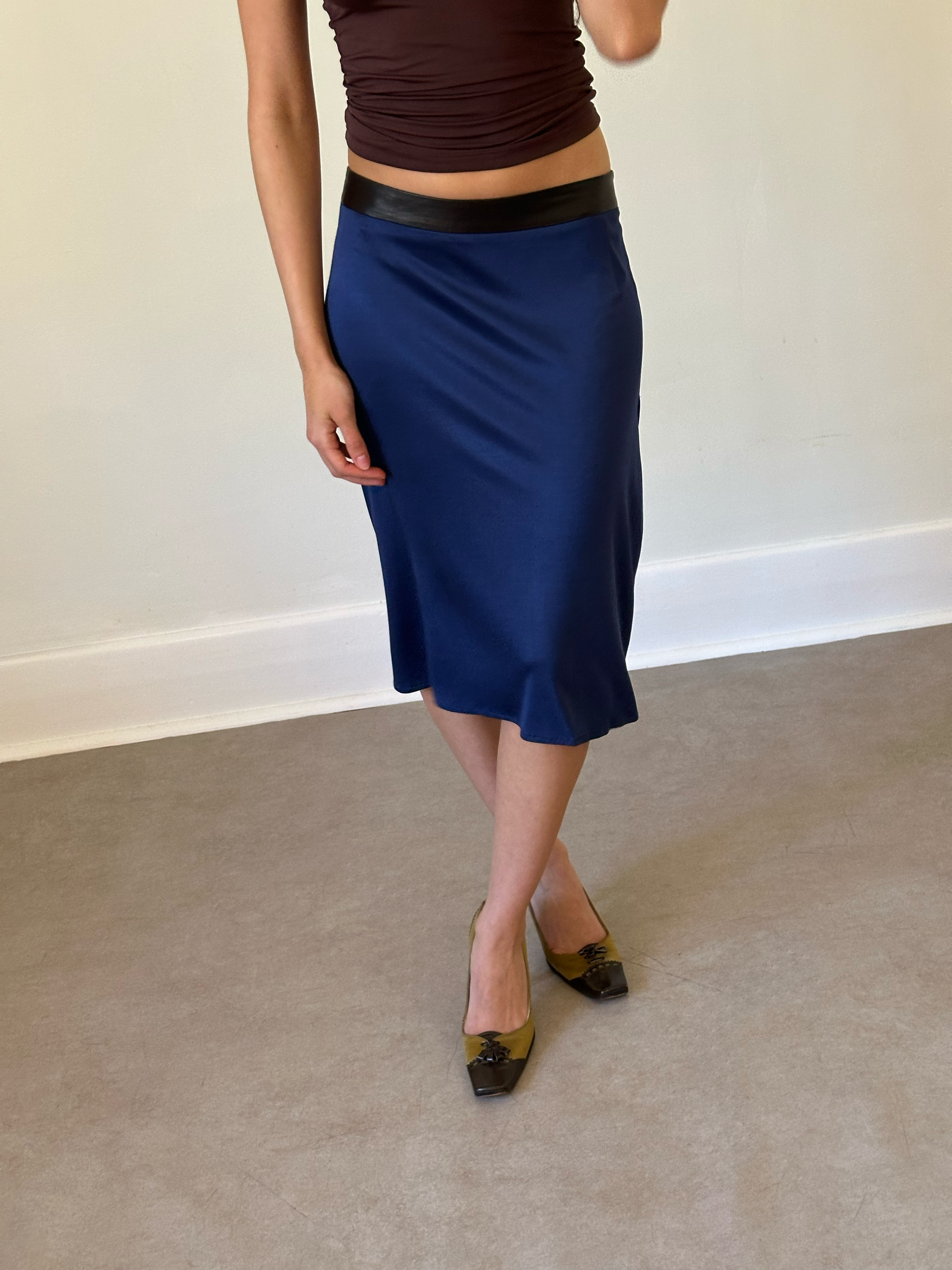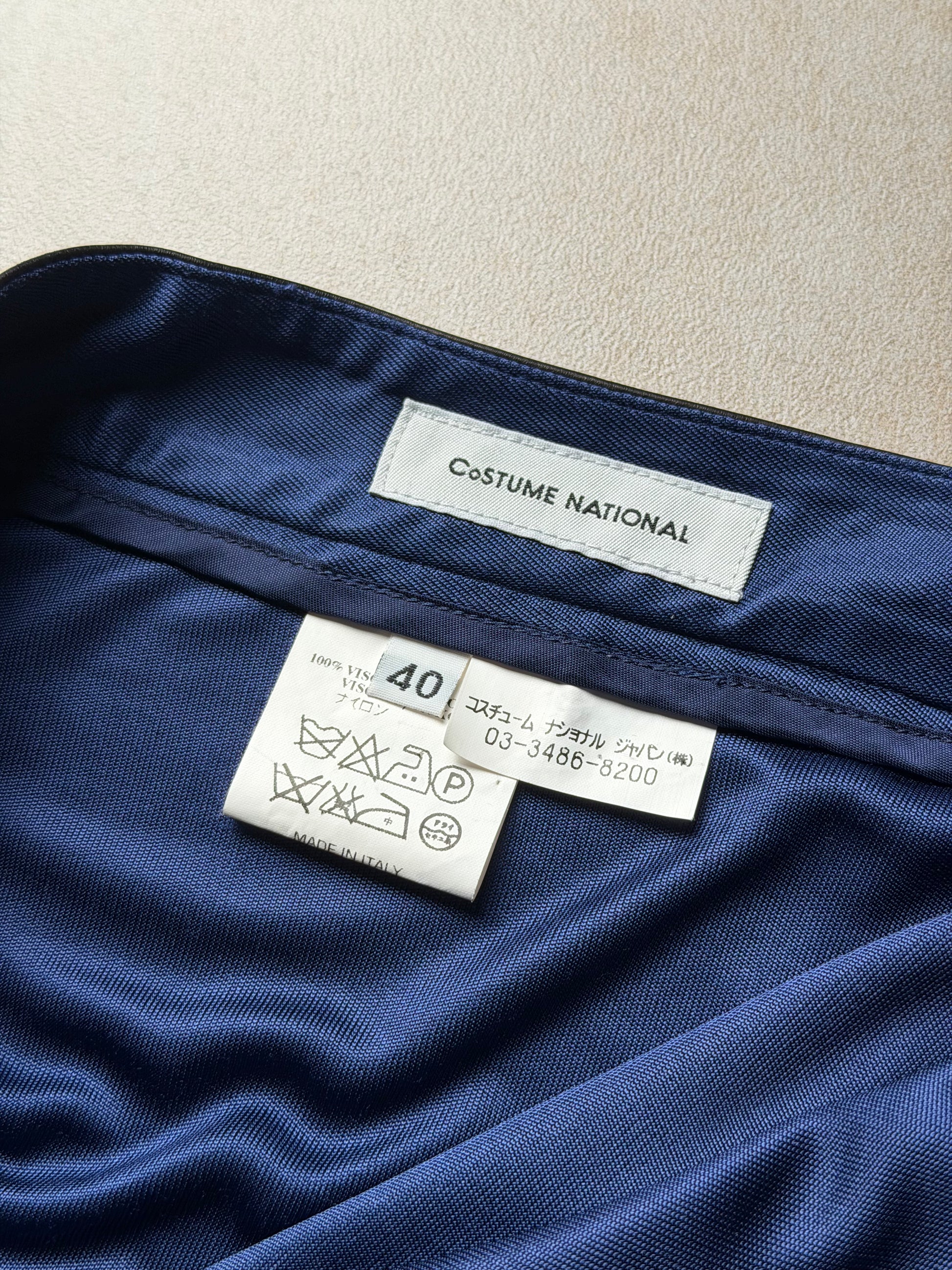 costume national high-waisted midi skirt in navy blue. crafted in italy from a soft viscose blend with a genuine leather waistband and side zip closure. features a sleek, minimal silhouette with a back slit. in excellent vintage condition with minimal signs of wear