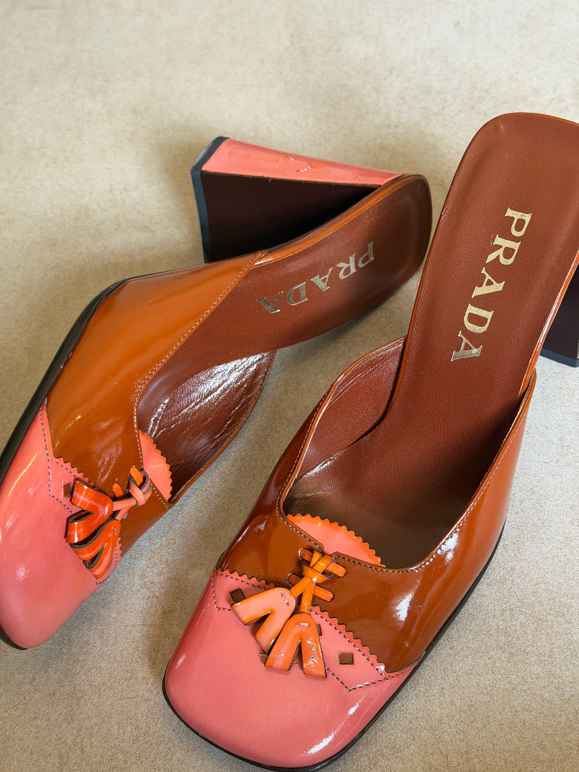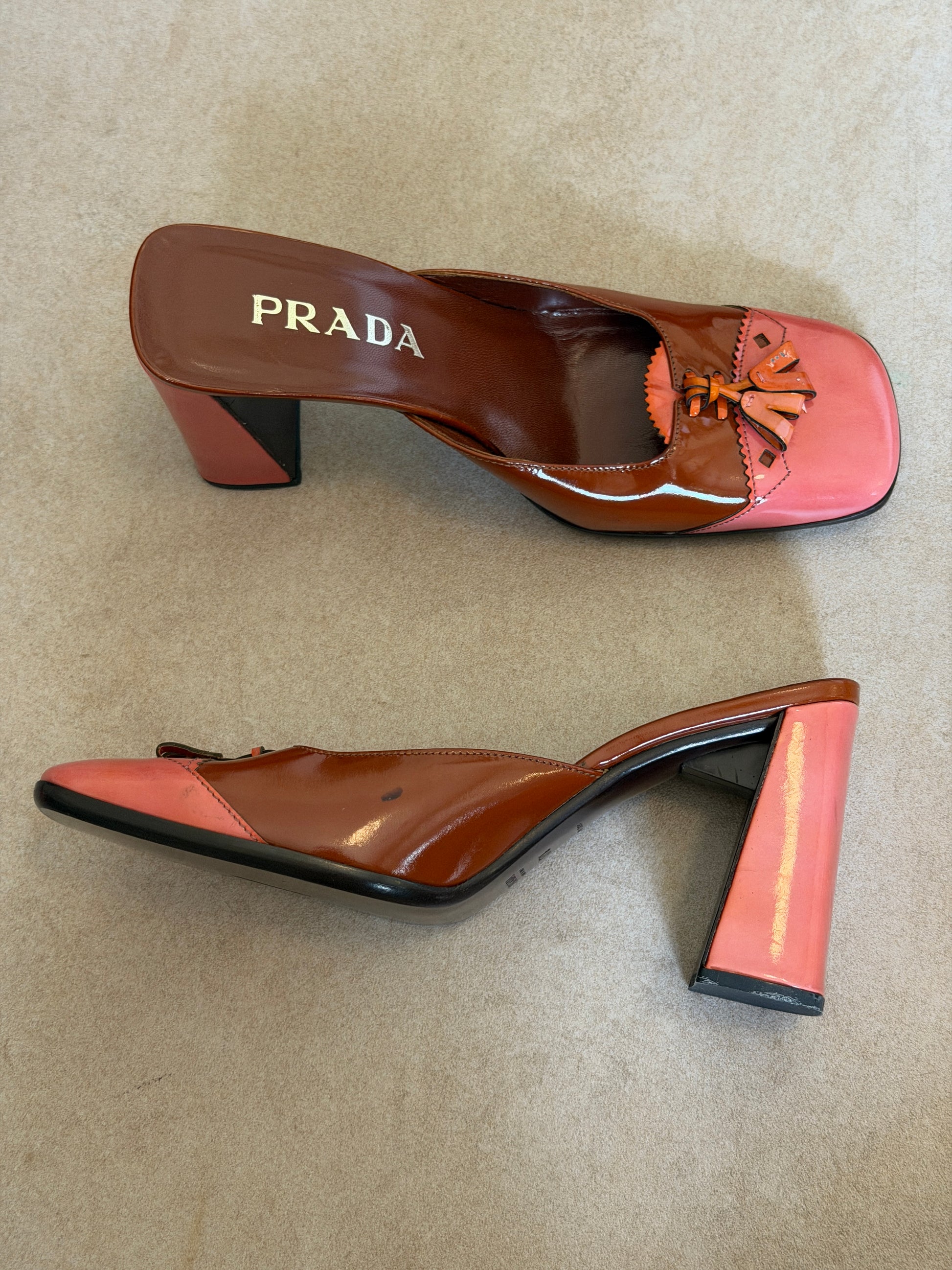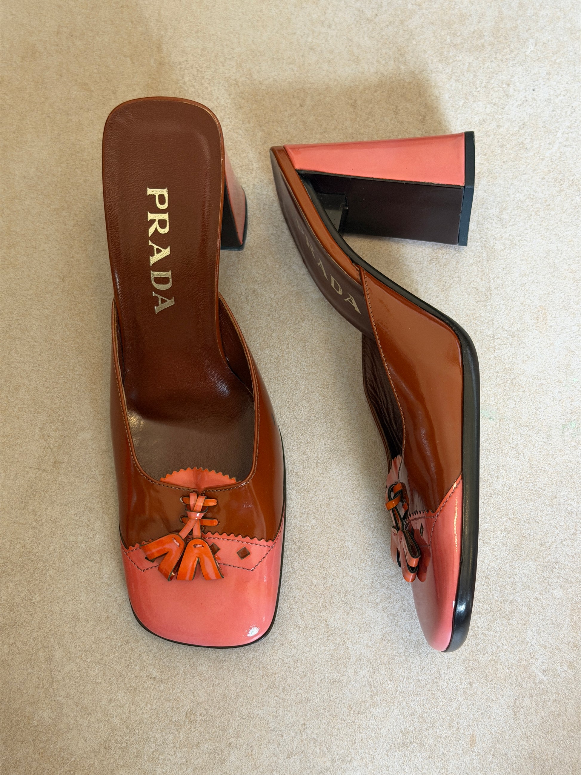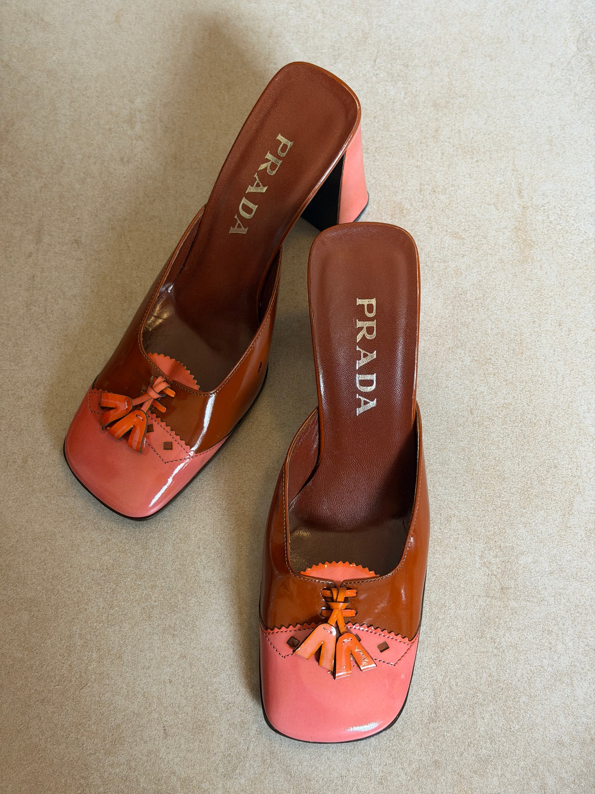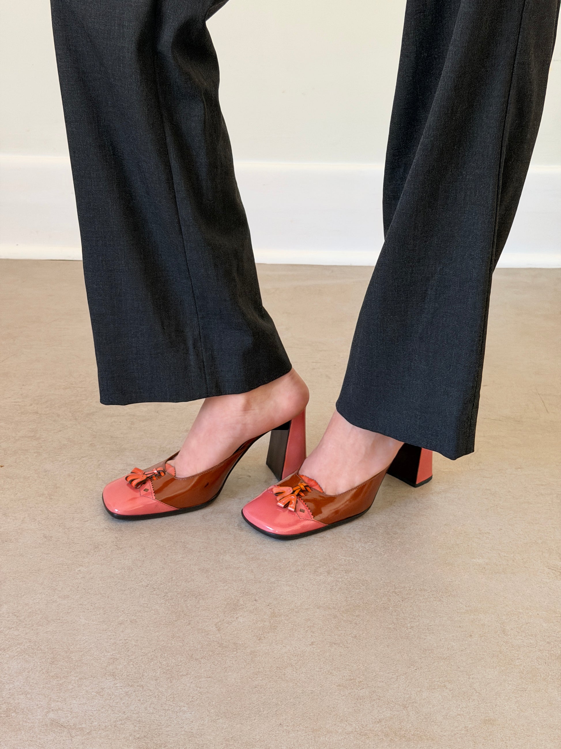 prada fw 1999 two tone patent leather sandals with square toe and low wedge heel, finished with contrast pink leather and tassel detailing across the vamp. visible wear throughout consistent with age, heel caps have been replaced since imagery *ships end of next week