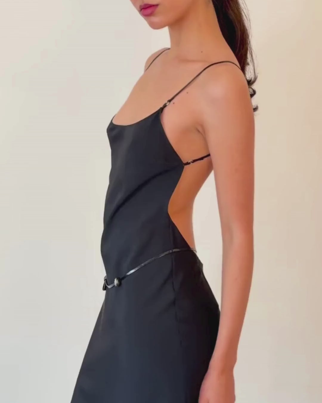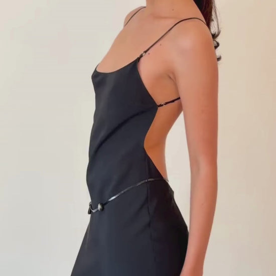 prada spring summer 2000 black silk-nylon blend midi dress, featuring an open back with fine leather straps and a low, thong waist detail. a rare archival piece, only a handful are known to circulate. in excellent vintage condition with minimal signs of wear