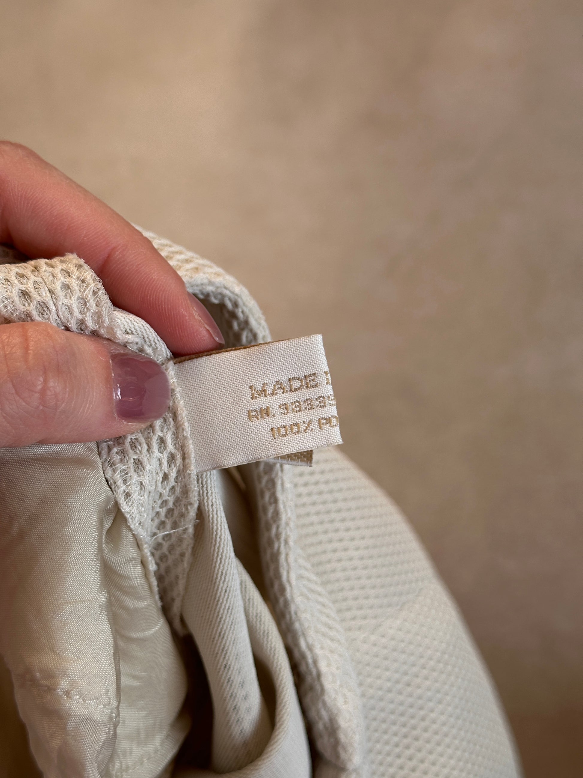 rare archival spring summer 1999 piece in ivory technical mesh with a subtle tonal texture. tailored knee-length cut with structured pleats at the front, side pockets, belt loops, and concealed zip fly. minimal, architectural design true to late-90s prada sport aesthetics