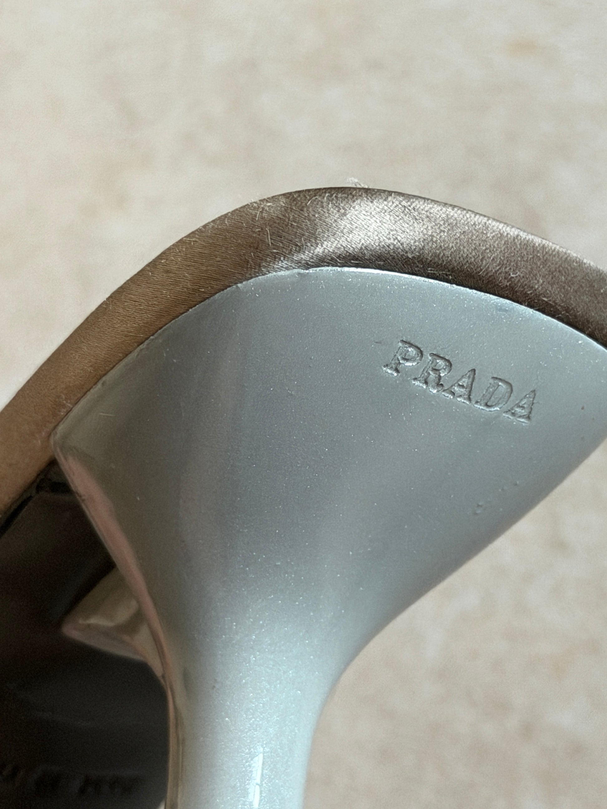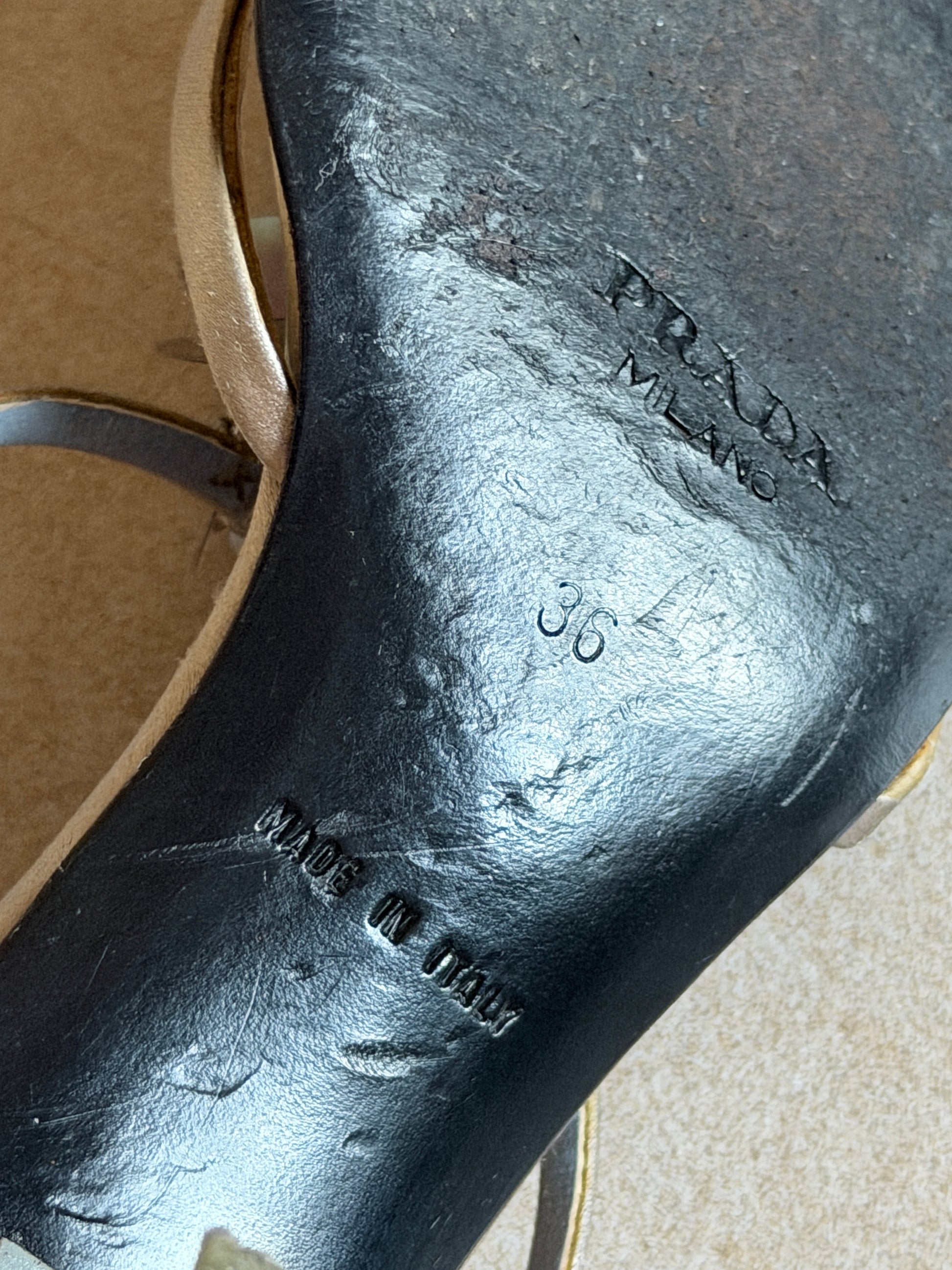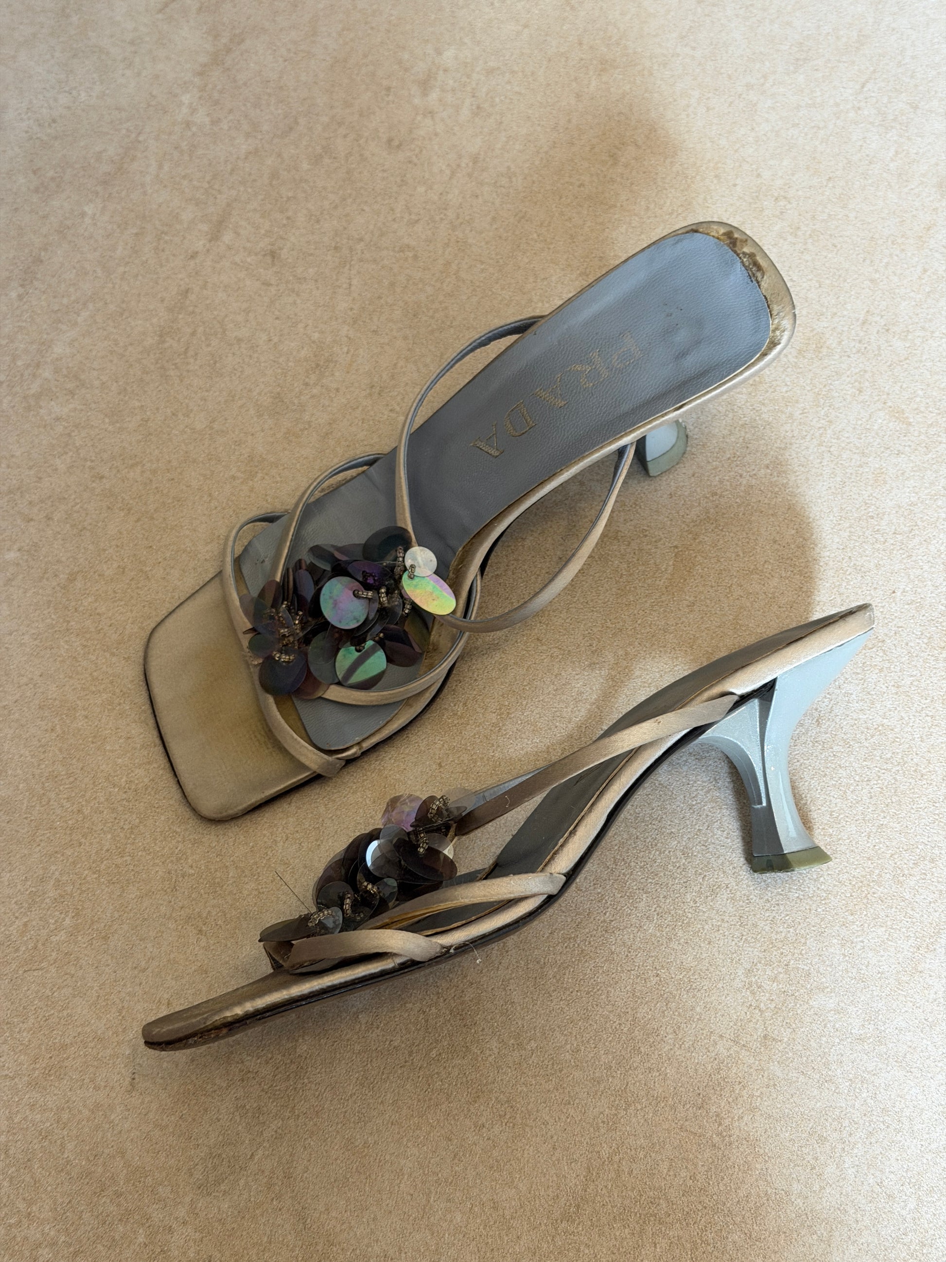 prada embellished mule sandals with square toe and low sculptural block heel, finished with iridescent disc detailing across the strap. subtle wear throughout consistent with age. heel caps have been replaced since imagery for optimal wear *ships end of next week