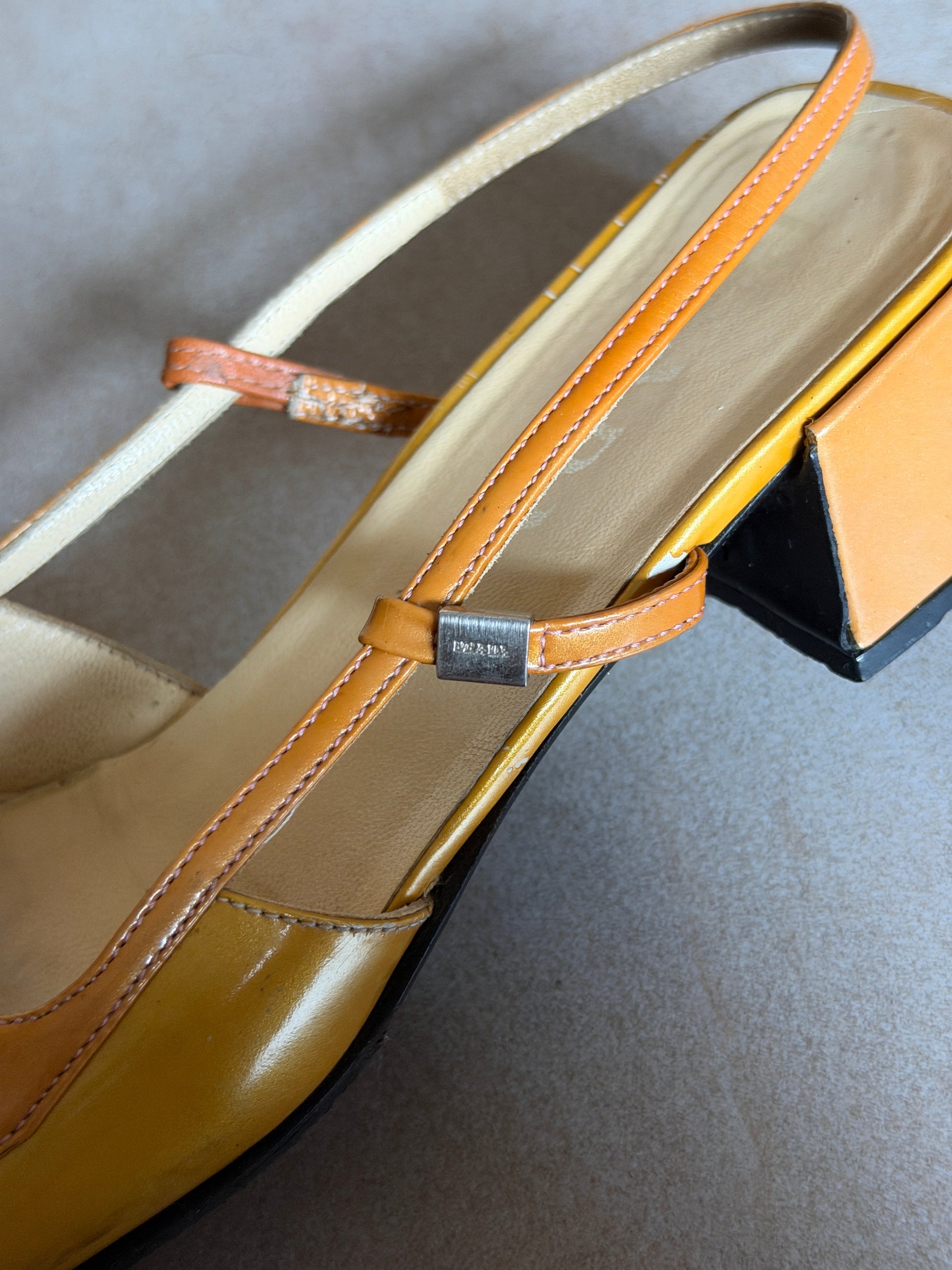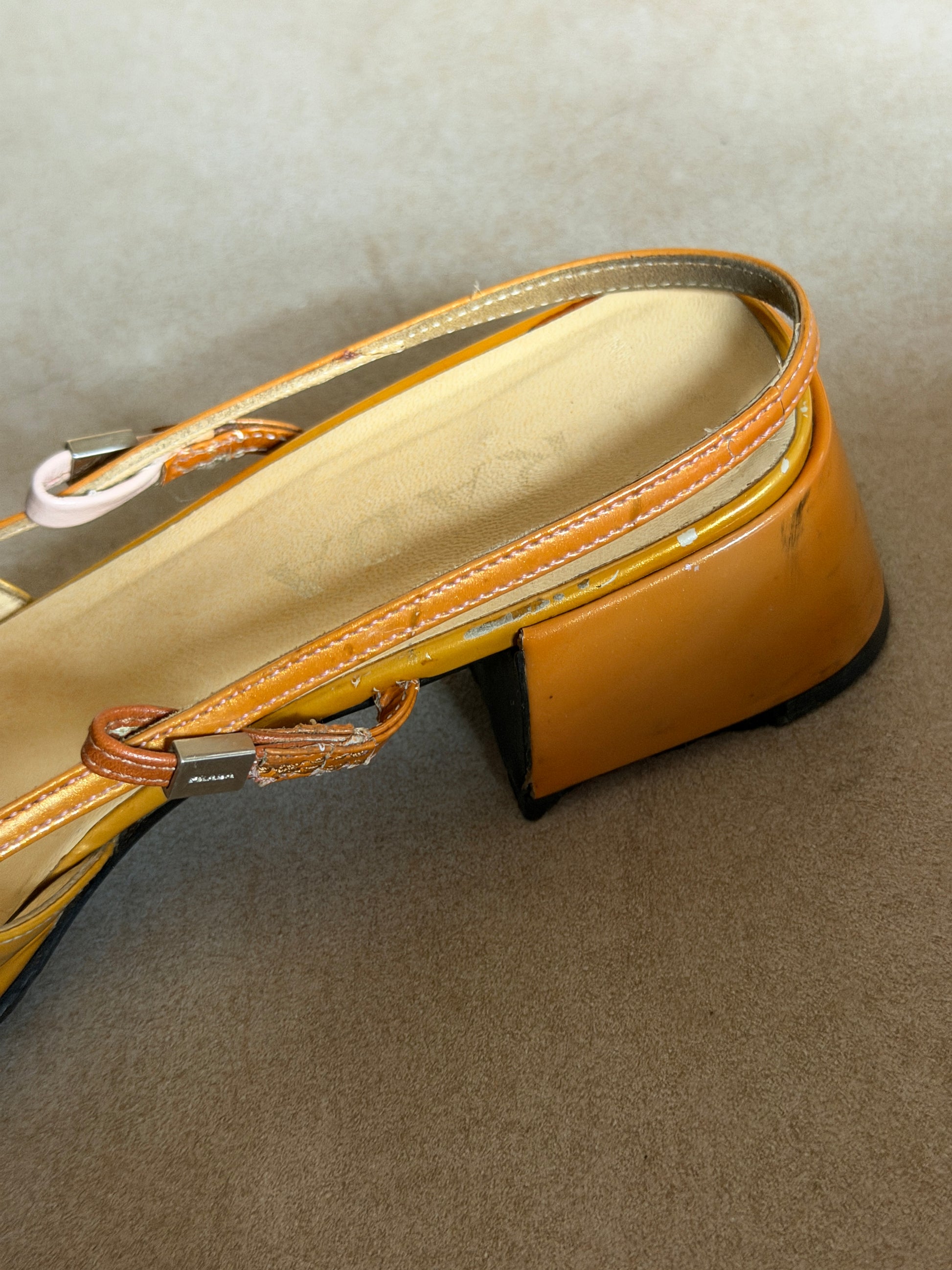 prada two-tone slingback sandals featuring a metallic gold leather toe, tan leather trims and a square front with bow detail. low block heel. straps have been repaired, please refer to images. in fair vintage condition with signs of wear throughout. heel caps have been replaced since imagery *ships end of next week