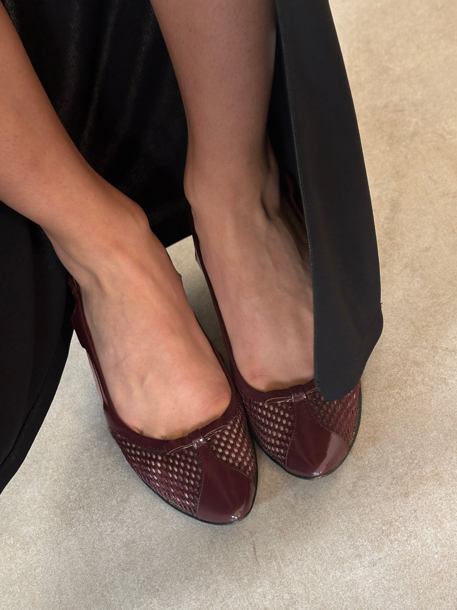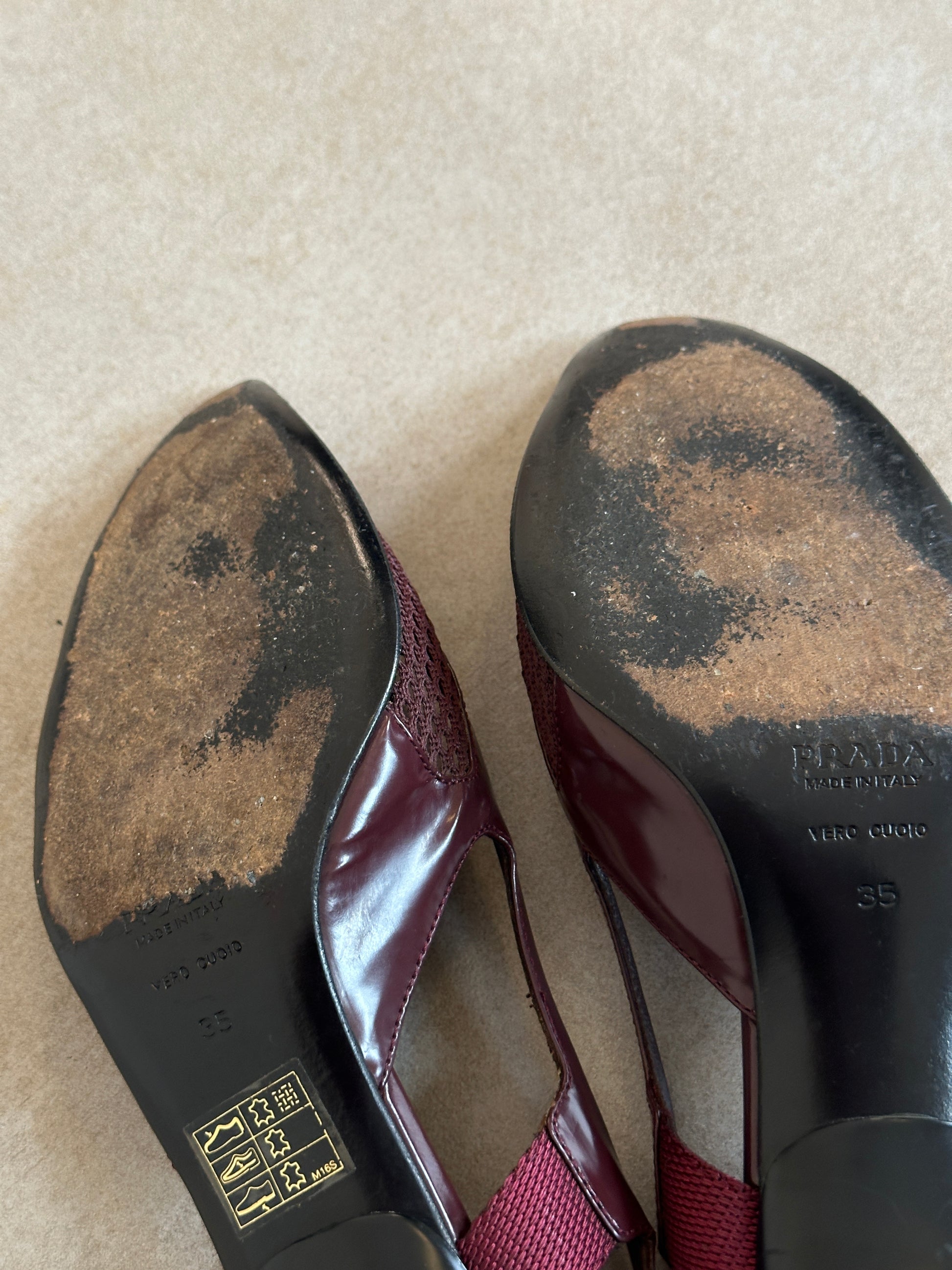 prada ss 2000 slingback sandals in deep purple. pointed toe with mesh body and patent leather trim, finished with small bow detail at the front. slim adjustable ankle strap and mid heel. made in italy