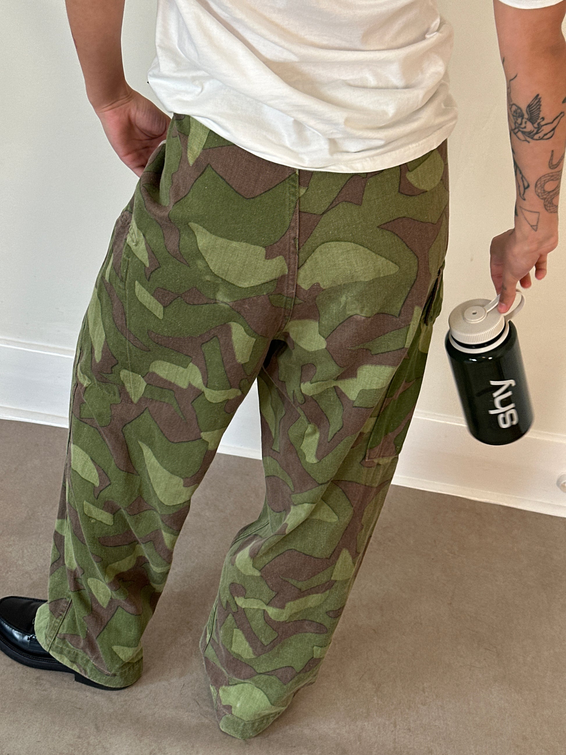 finnish army m62 reversible overpants featuring classic woodland camouflage on one side and snow camouflage on the reverse. constructed from durable cotton with a loose, utilitarian fit. condition shows general signs of use consistent with age
