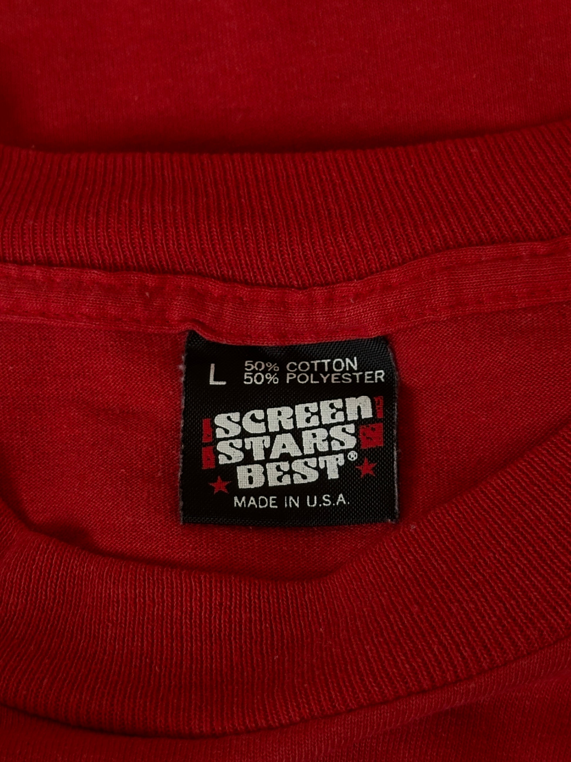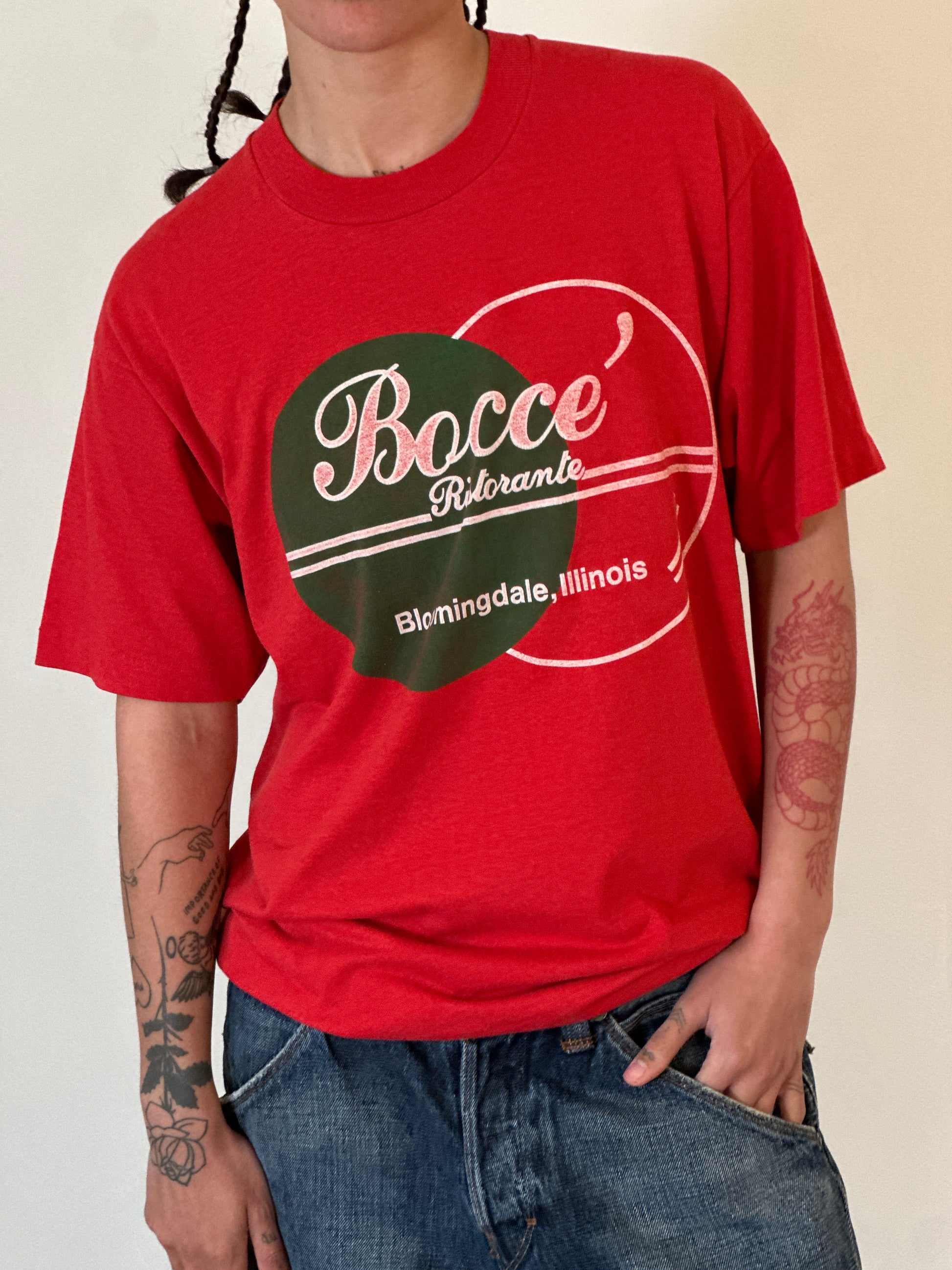 1980s screen stars red t-shirt featuring a front print with graphic and a back print reading “the home of italian soul food.” made in the usa from a 50/50 cotton-polyester blend. condition shows wear with minor collar damage, consistent with age