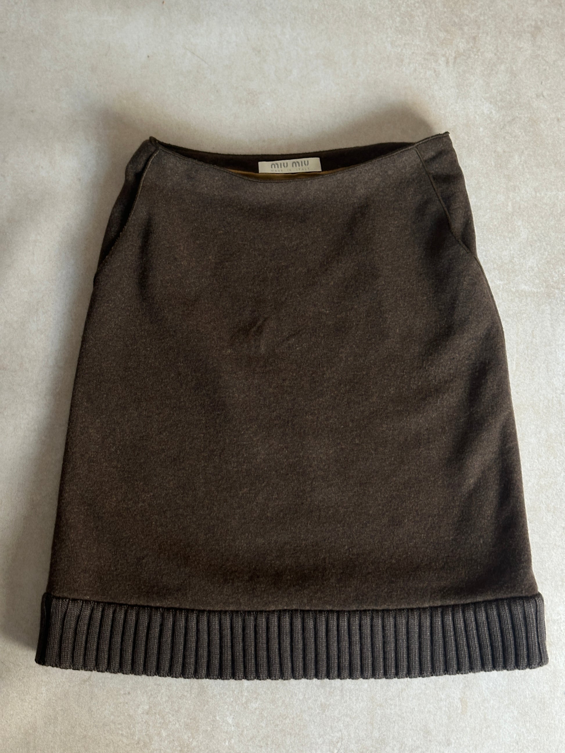 miu miu dark brown wool skirt, crafted in italy from a smooth medium-weight wool blend with subtle nylon and viscose. features side pockets and a ribbed hem detail, fully lined and in excellent vintage condition