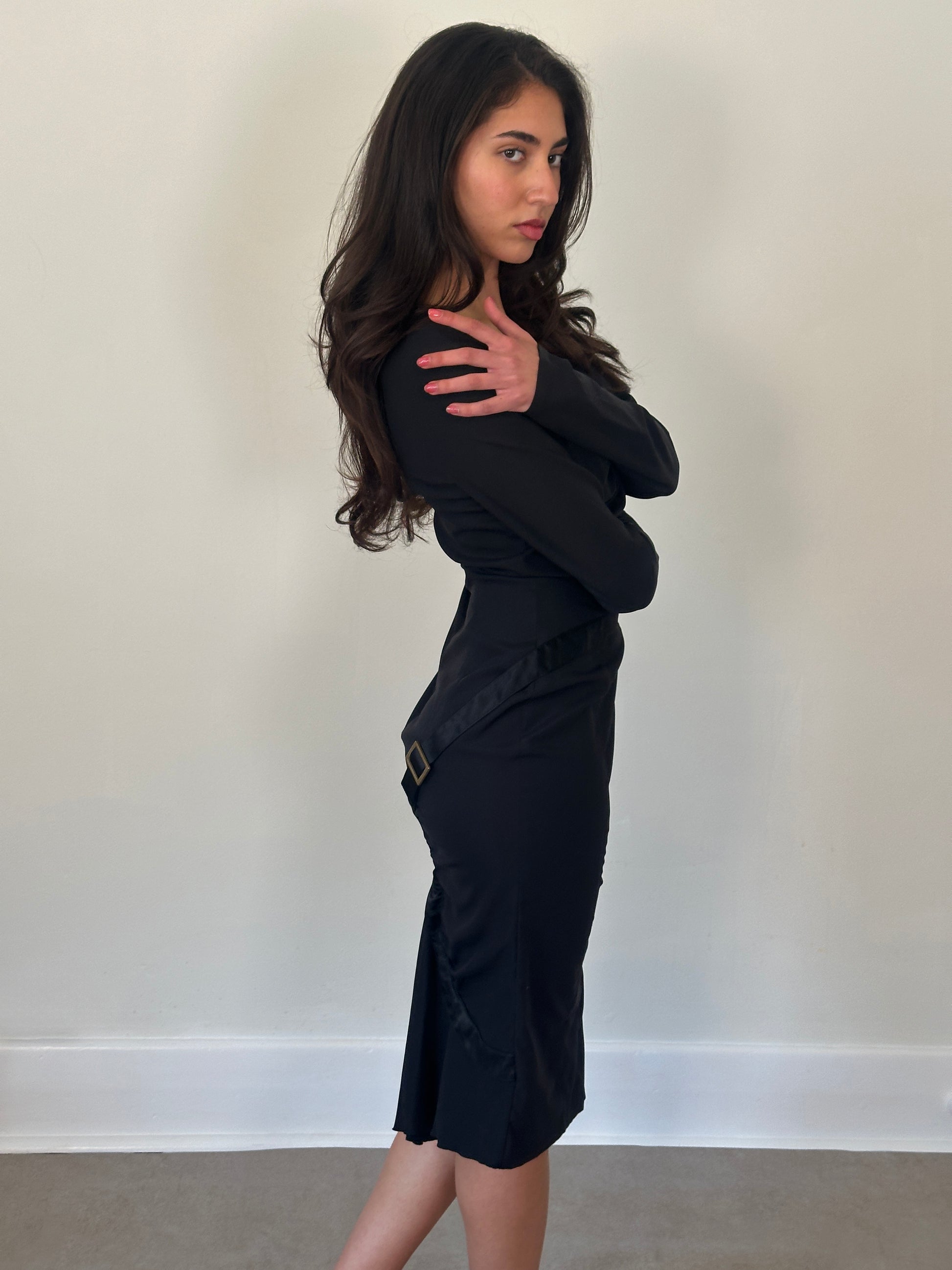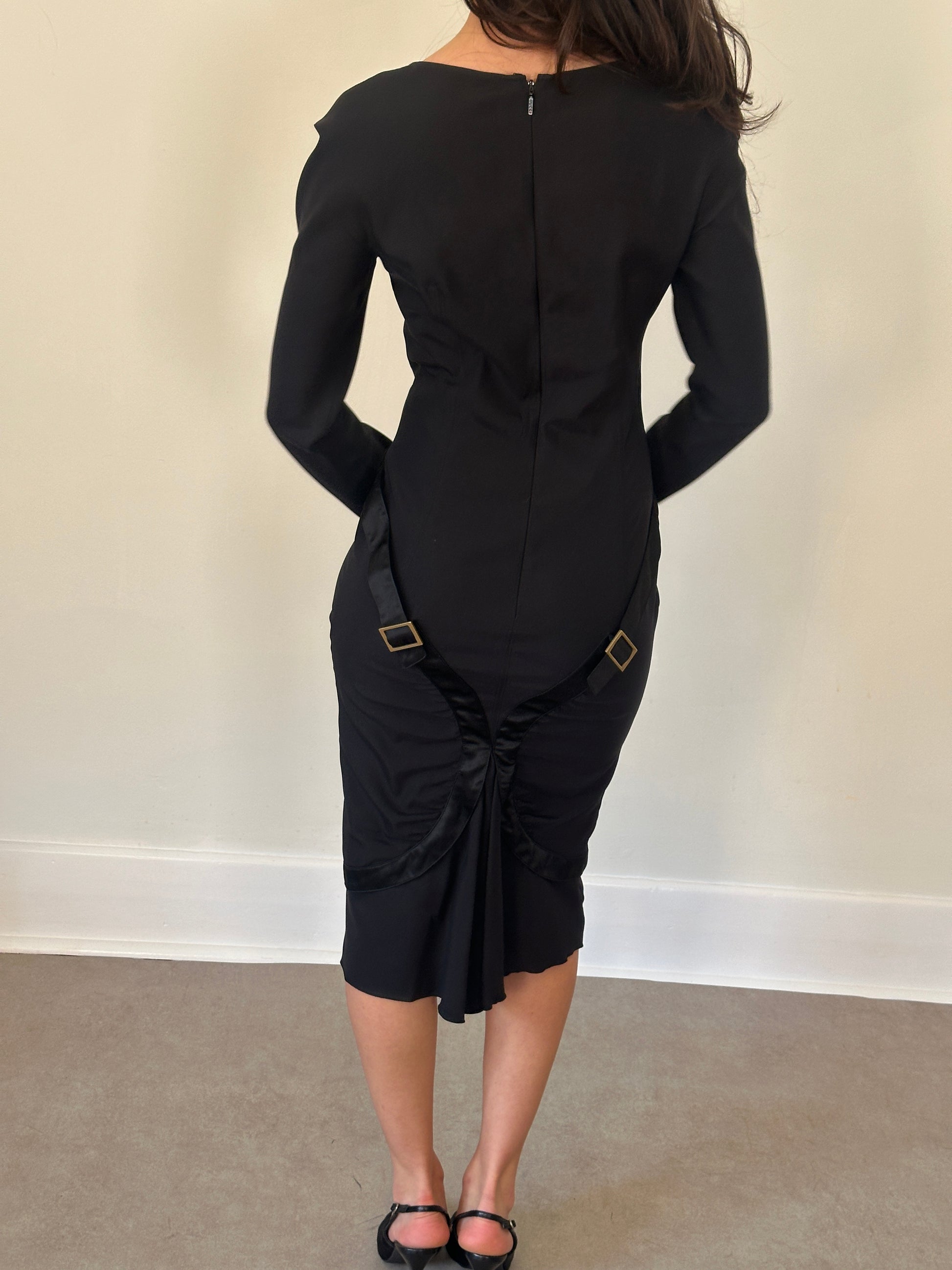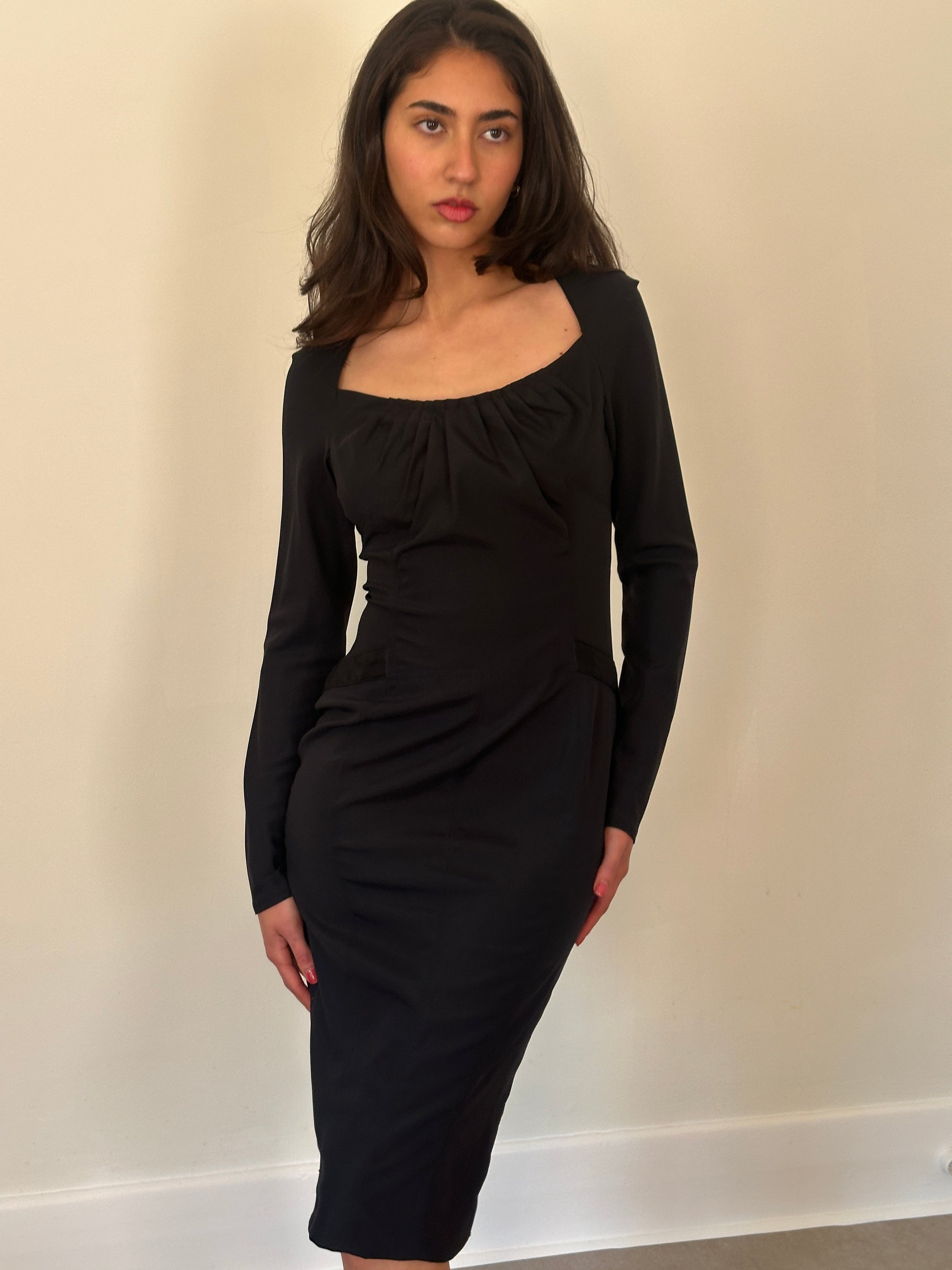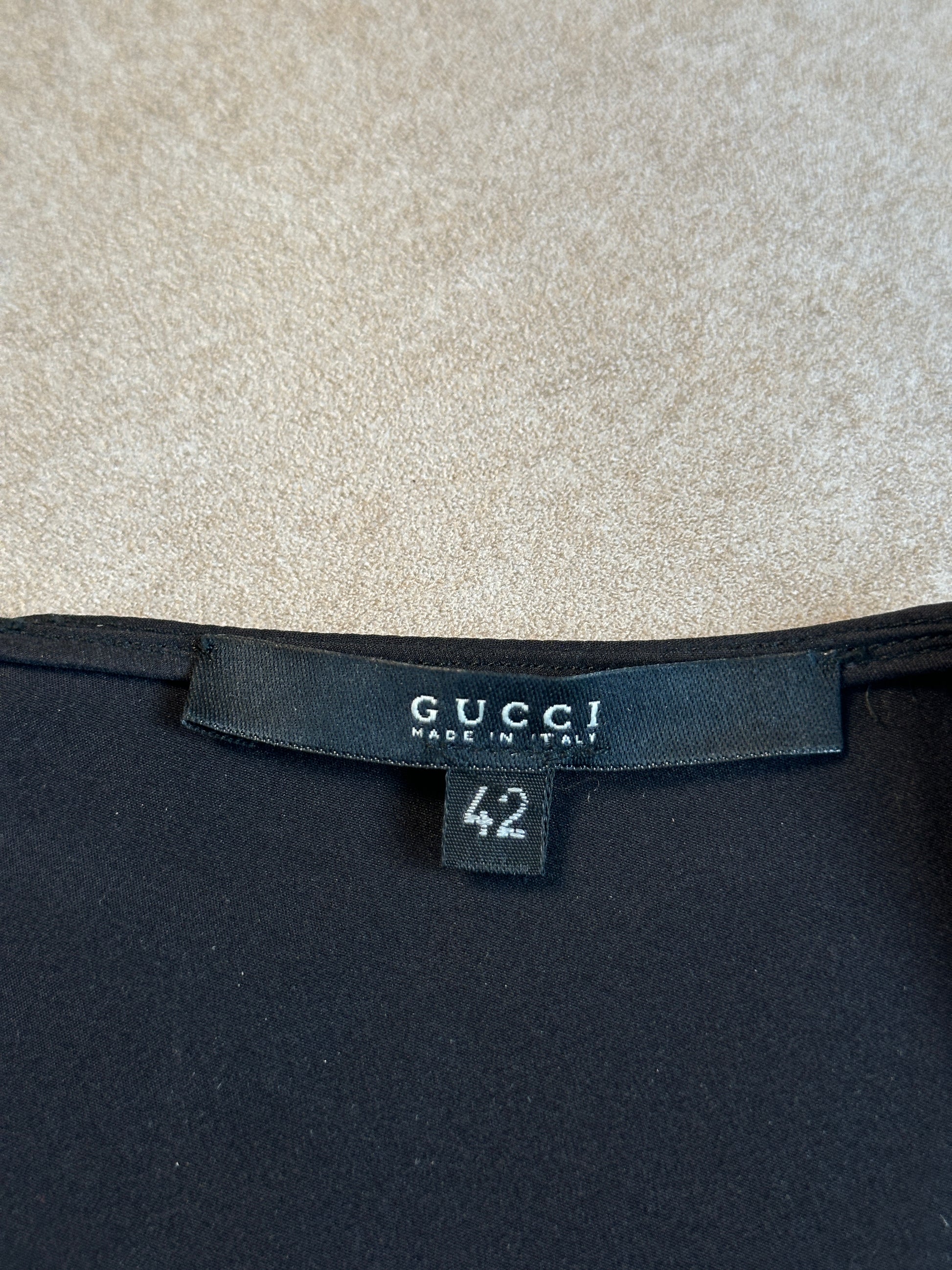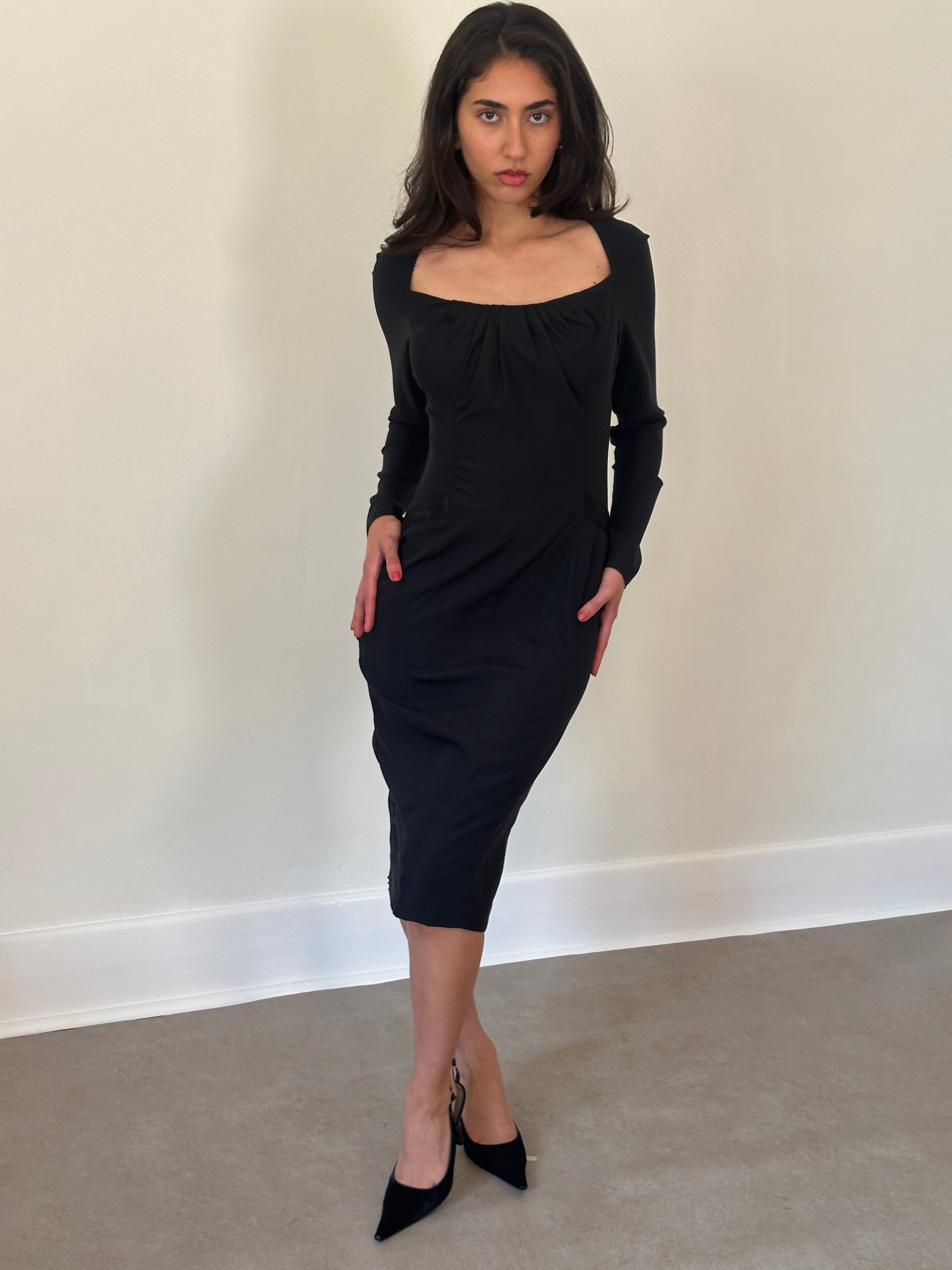 vintage gucci knee-length black dress from the tom ford era, featuring a sleek silhouette with subtle corset-inspired waist shaping. structured yet minimal, crafted from a smooth, slightly stretchy fabric with a back zip closure. no visible flaws — zipper runs smoothly, in excellent condition.