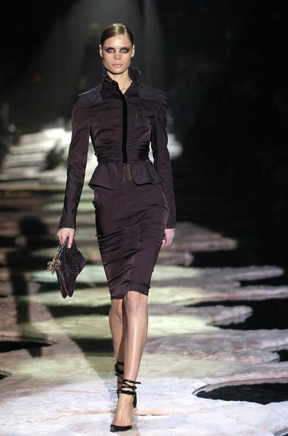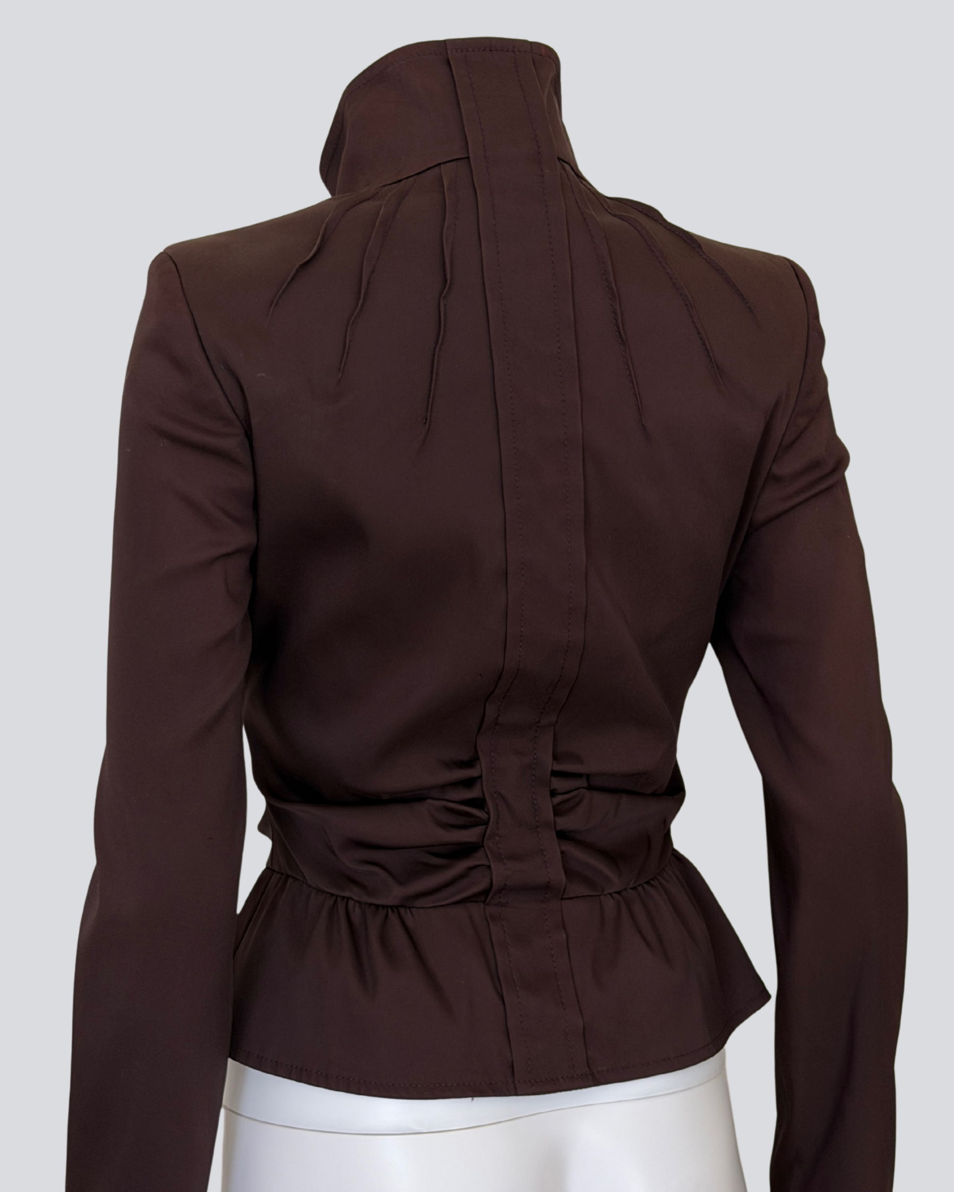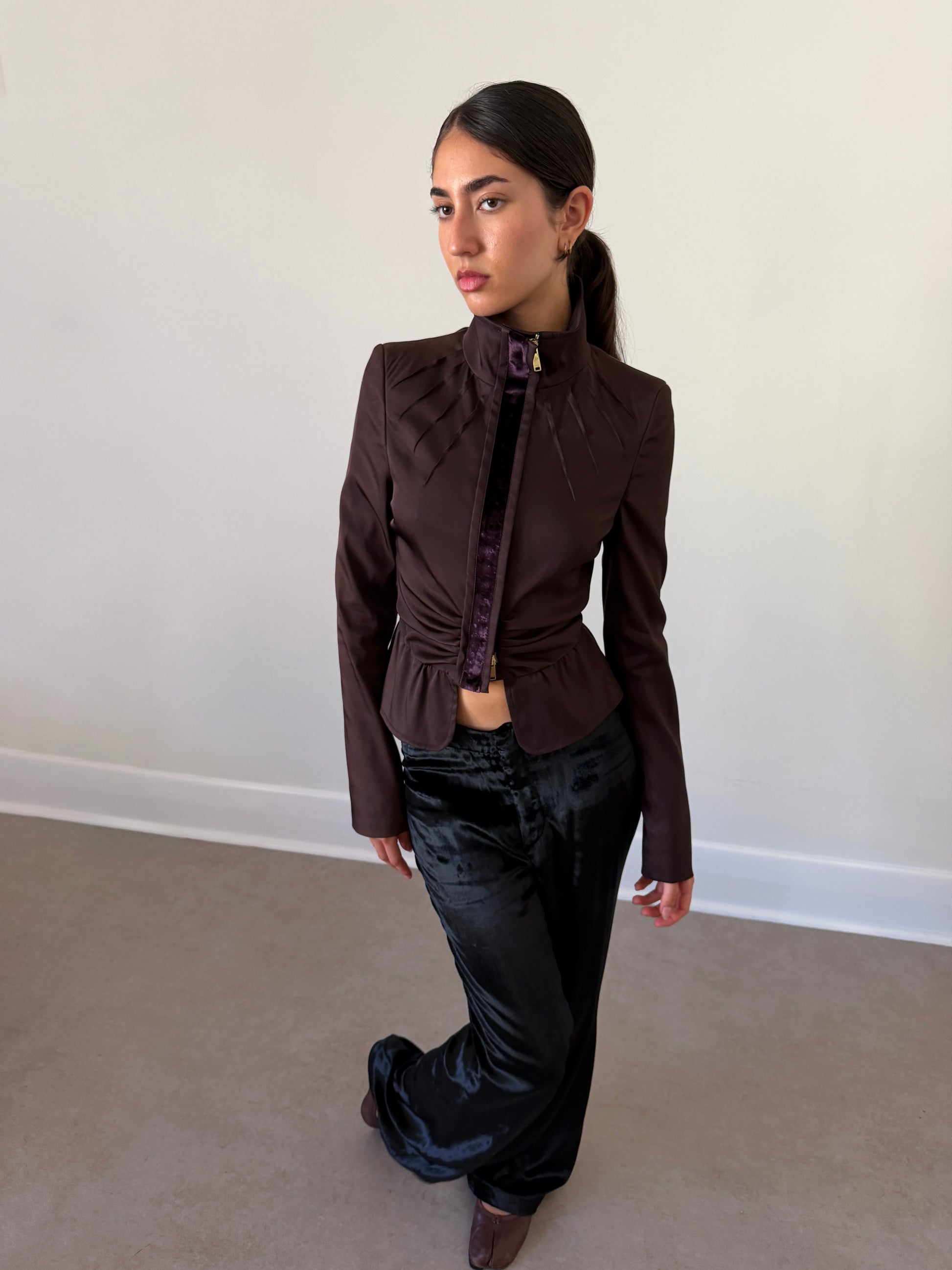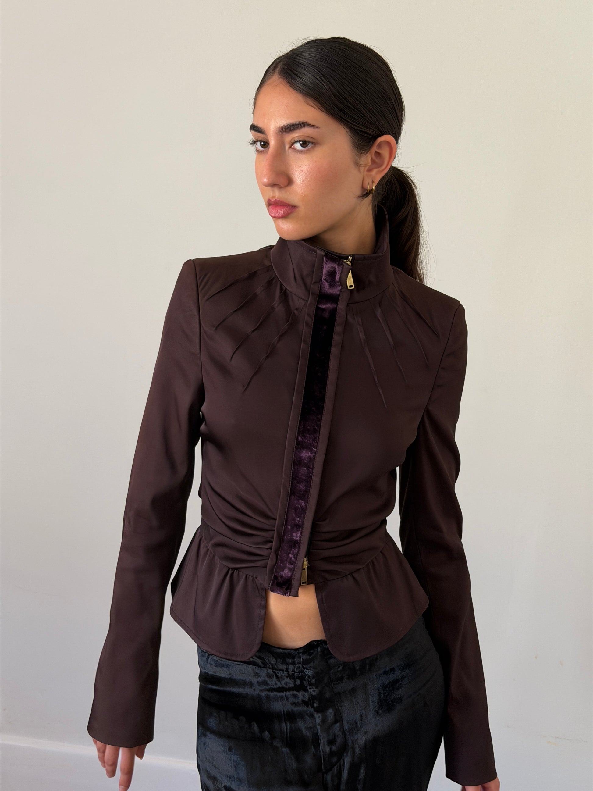 gucci by tom ford fw 2004 purple toned stand-collar jacket with a fitted silhouette, gathered waist, and hidden zip front. finished with subtle velour paneling through the centre. vintage condition with light wear consistent with age