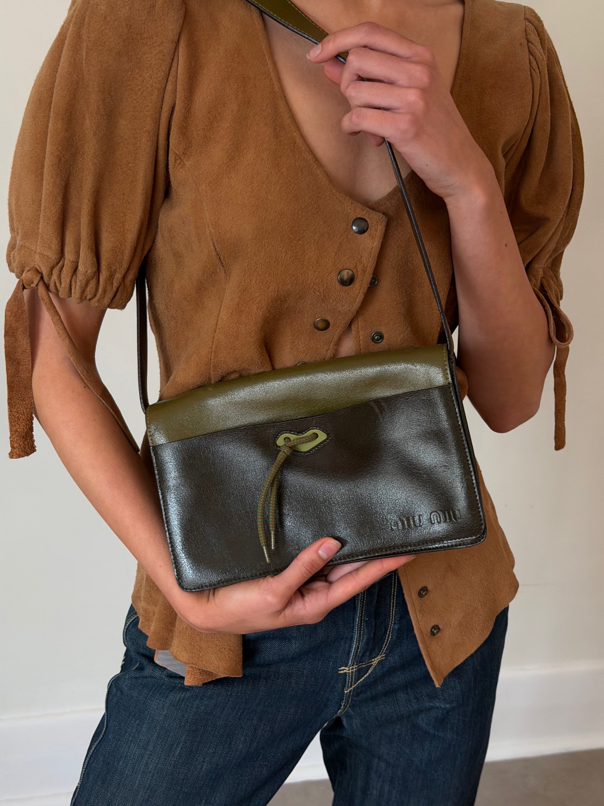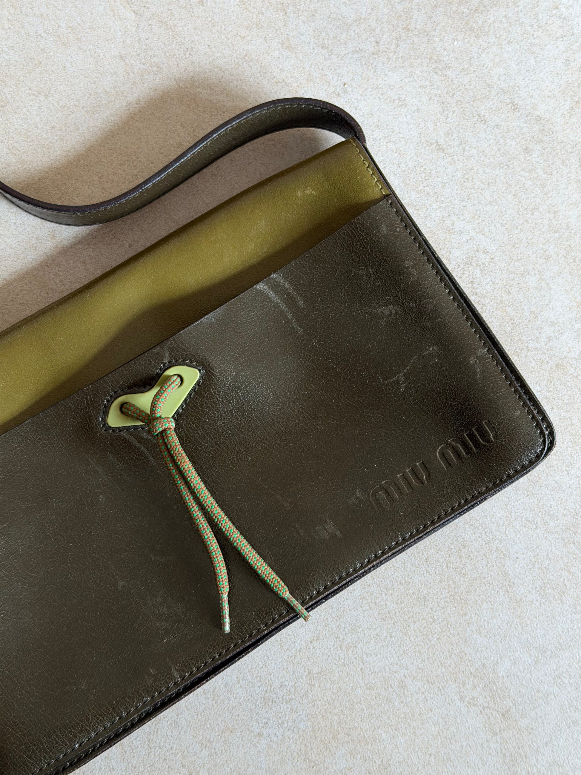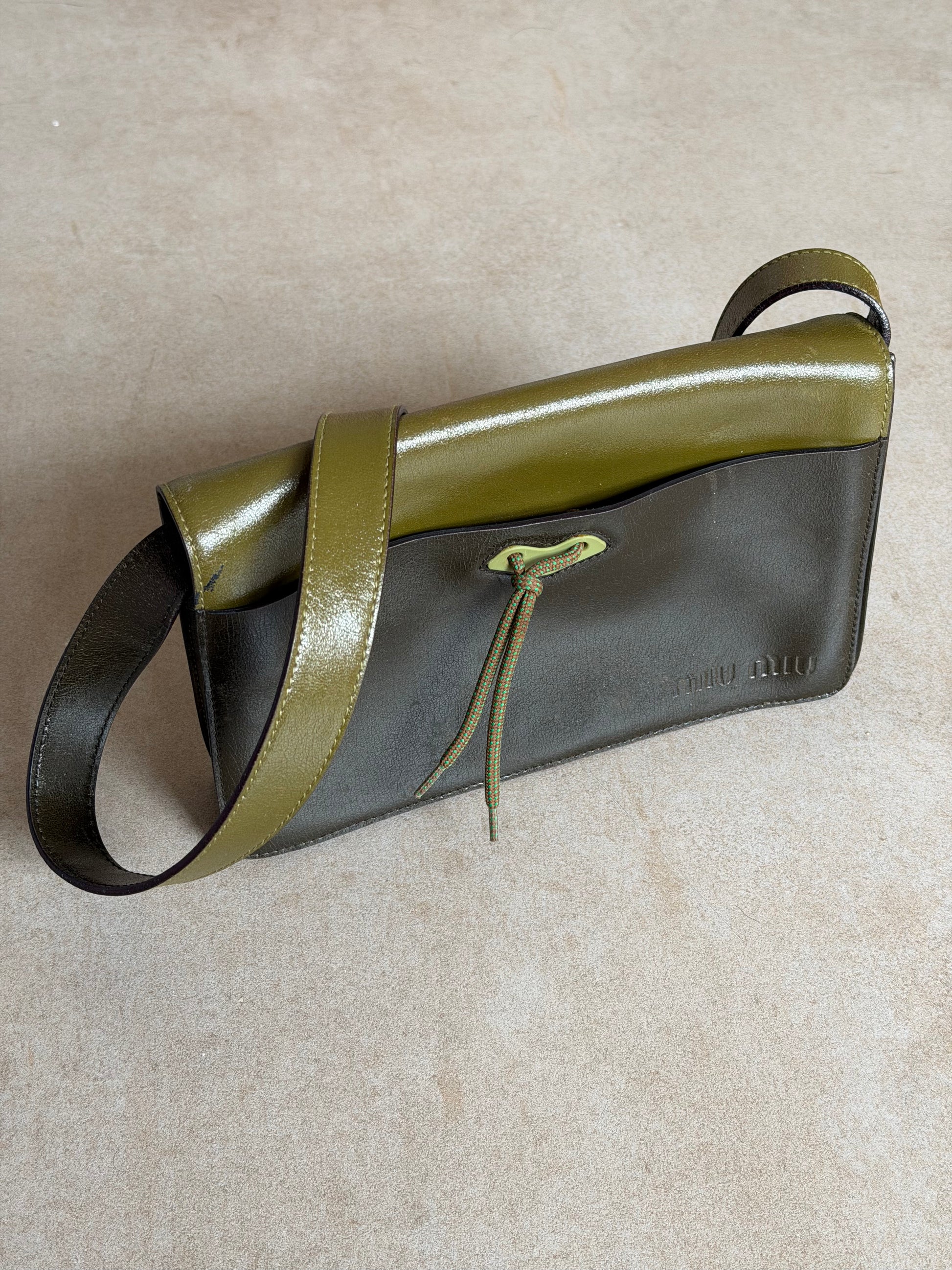 miu miu fall winter 1999 two-tone leather butterfly bag in olive green and deep olive. crafted in italy from smooth leather with a contrast top panel and iconic butterfly shaped front tie detail. features a structured rectangular silhouette with a wide shoulder strap and suede-lined interior. a rare archival piece from early miu miu collections. in worn vintage condition with visible scratches and marks to the leather (see photos), interior clean and well kept