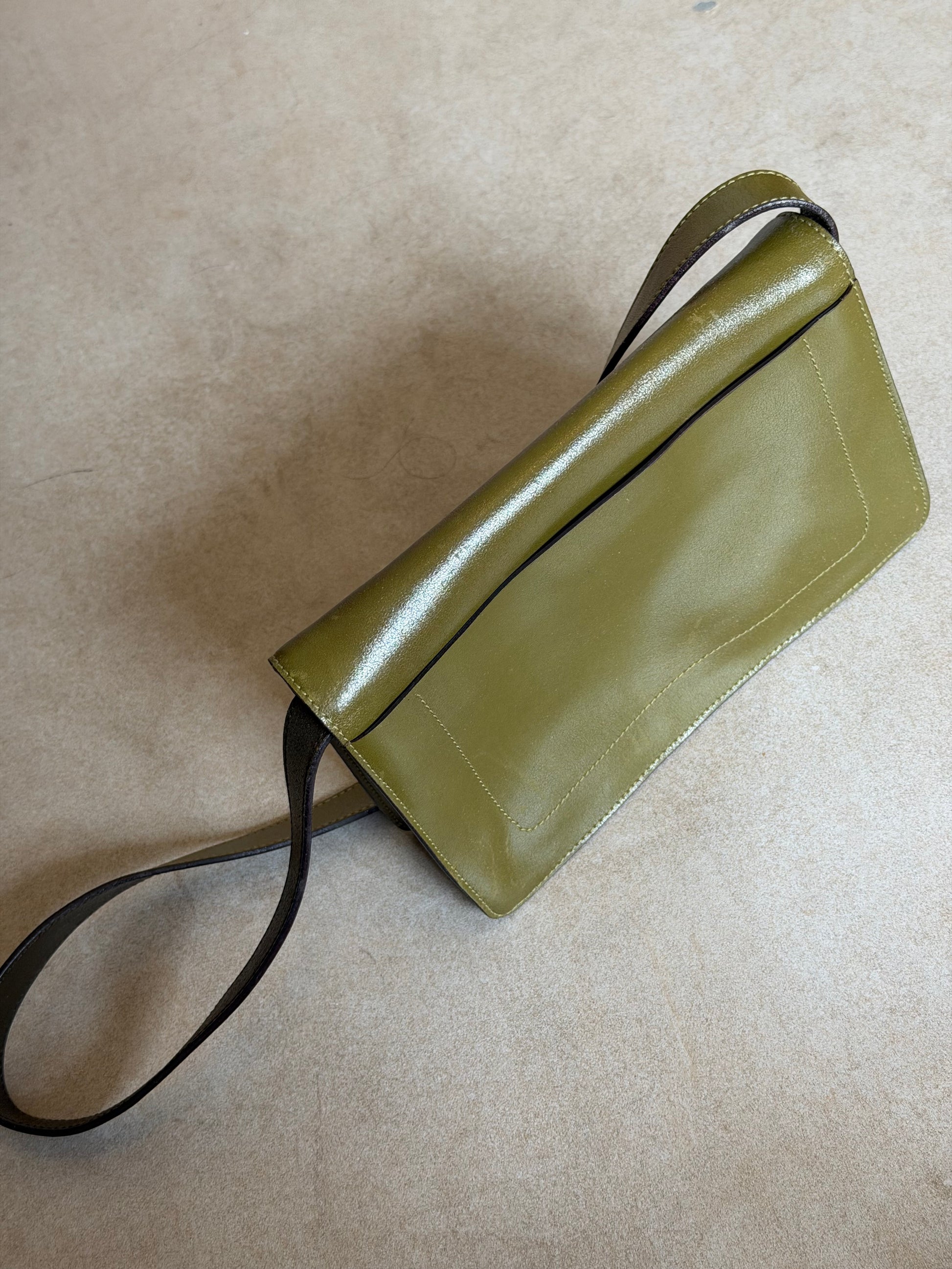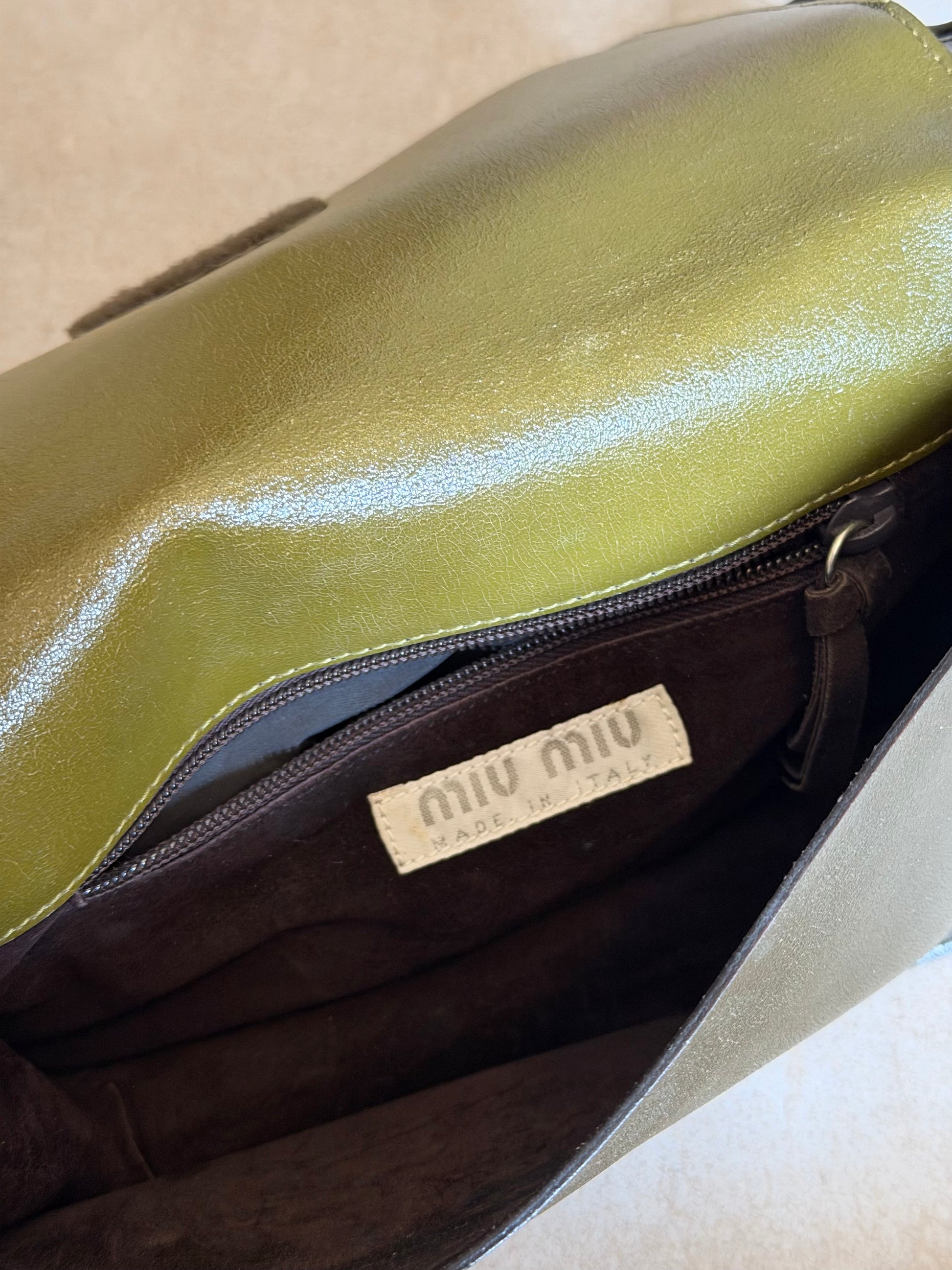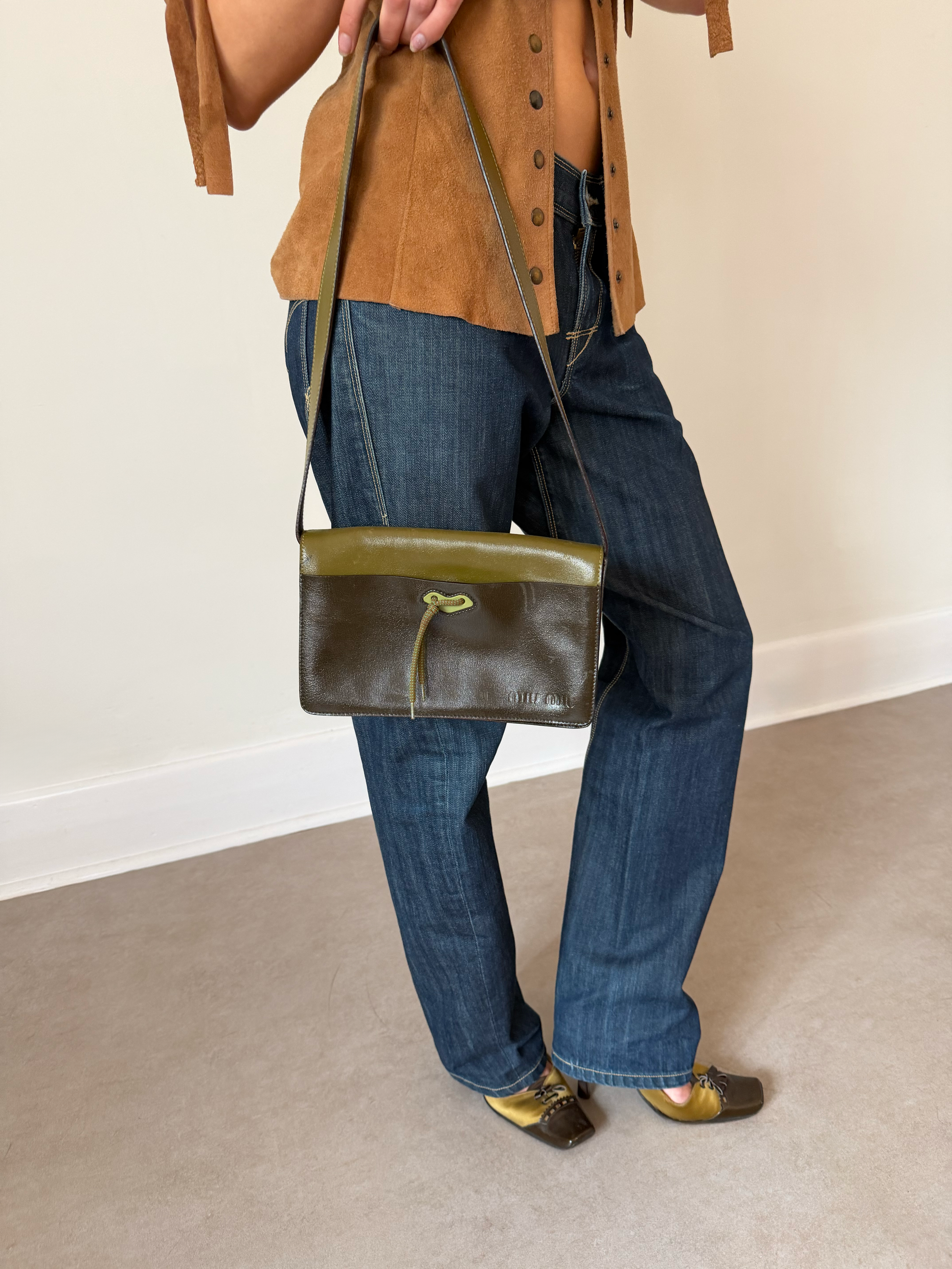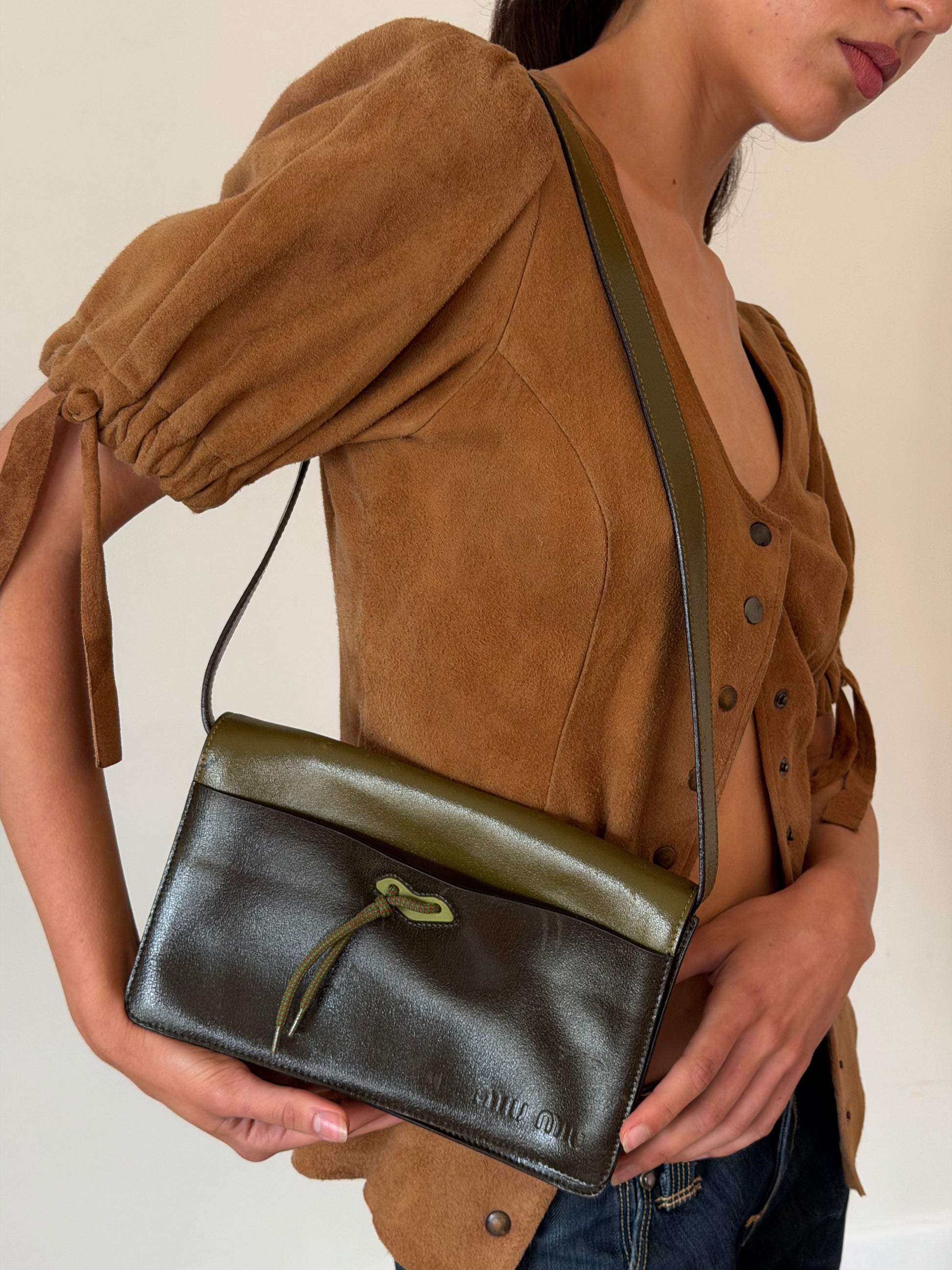 miu miu fall winter 1999 two-tone leather butterfly bag in olive green and deep olive. crafted in italy from smooth leather with a contrast top panel and iconic butterfly shaped front tie detail. features a structured rectangular silhouette with a wide shoulder strap and suede-lined interior. a rare archival piece from early miu miu collections. in worn vintage condition with visible scratches and marks to the leather (see photos), interior clean and well kept