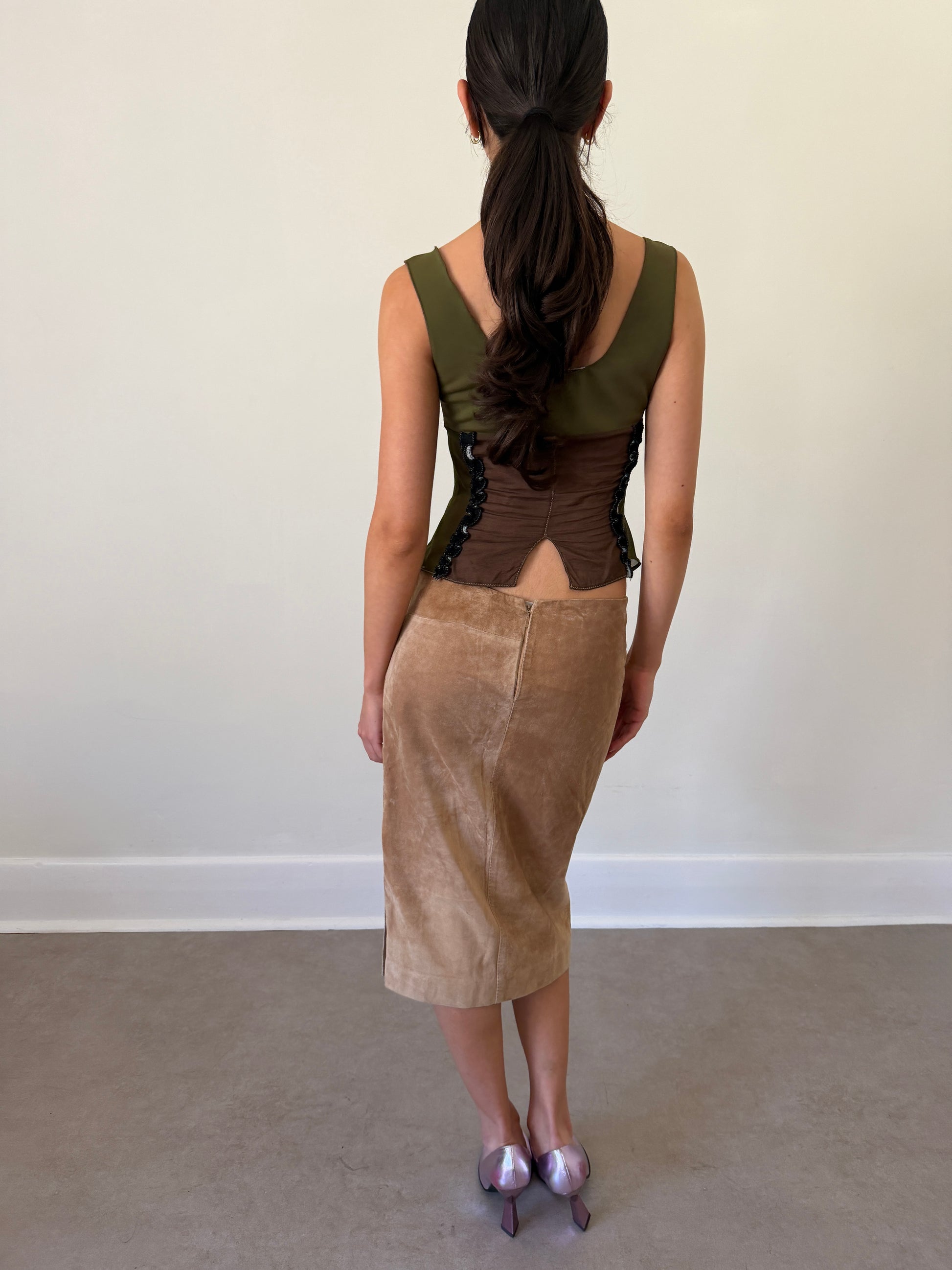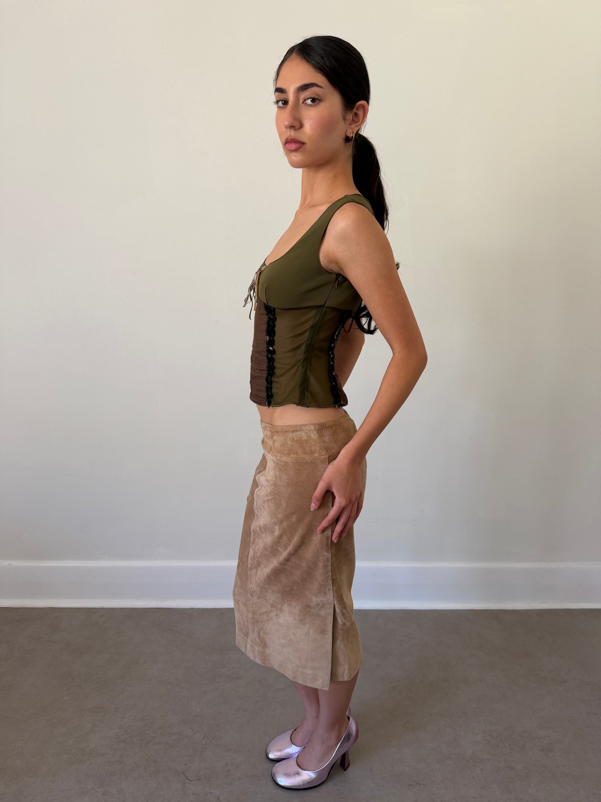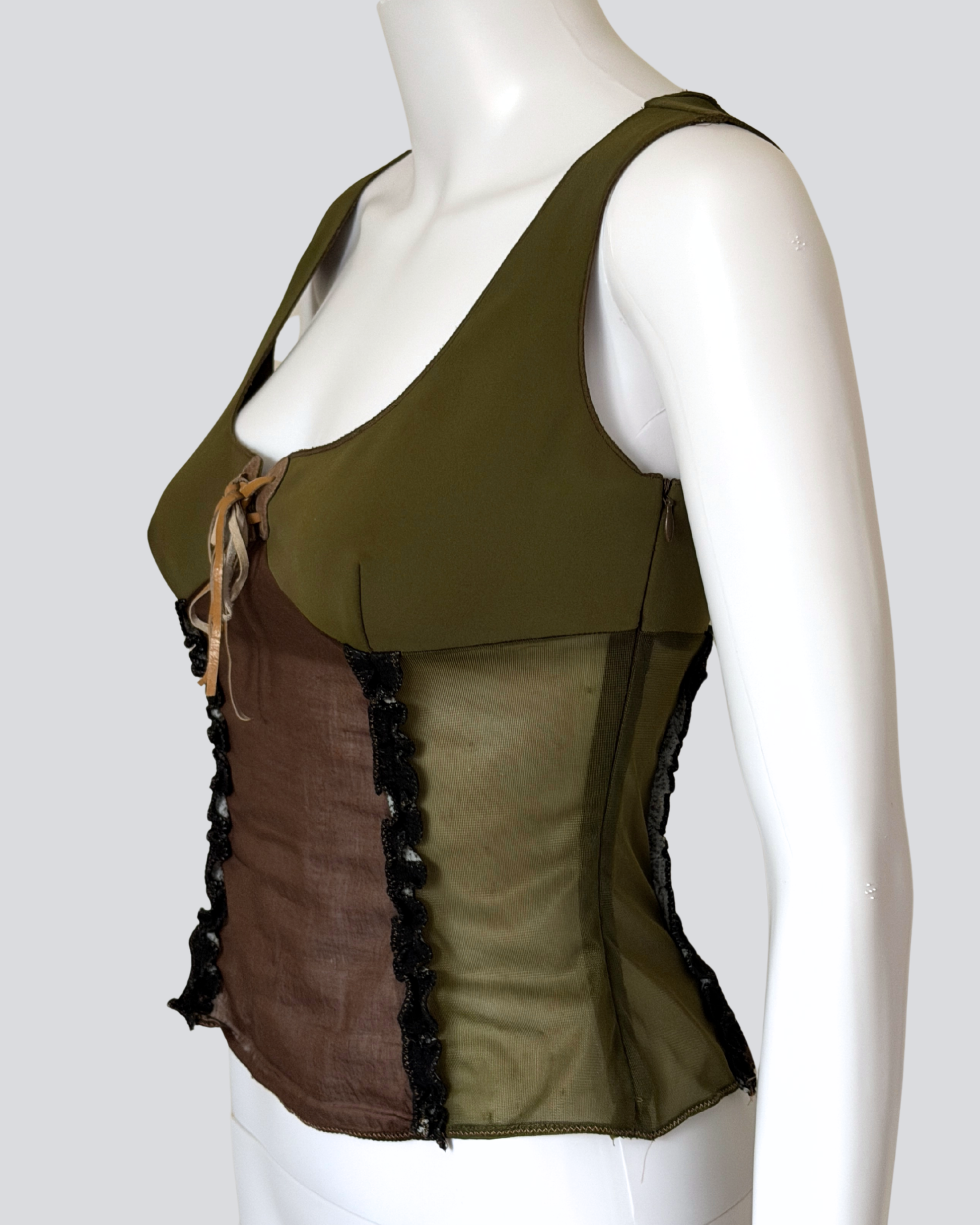 miu miu fall winter 1999 butterfly top in an olive green sheer nylon blend, cut with a softly contoured sleeveless silhouette and a scooped neckline. central semi-sheer brown cotton panel trimmed with black lace and finished with a signature leather butterfly tie motif at the bust. delicate construction with subtle stretch, side zip closure