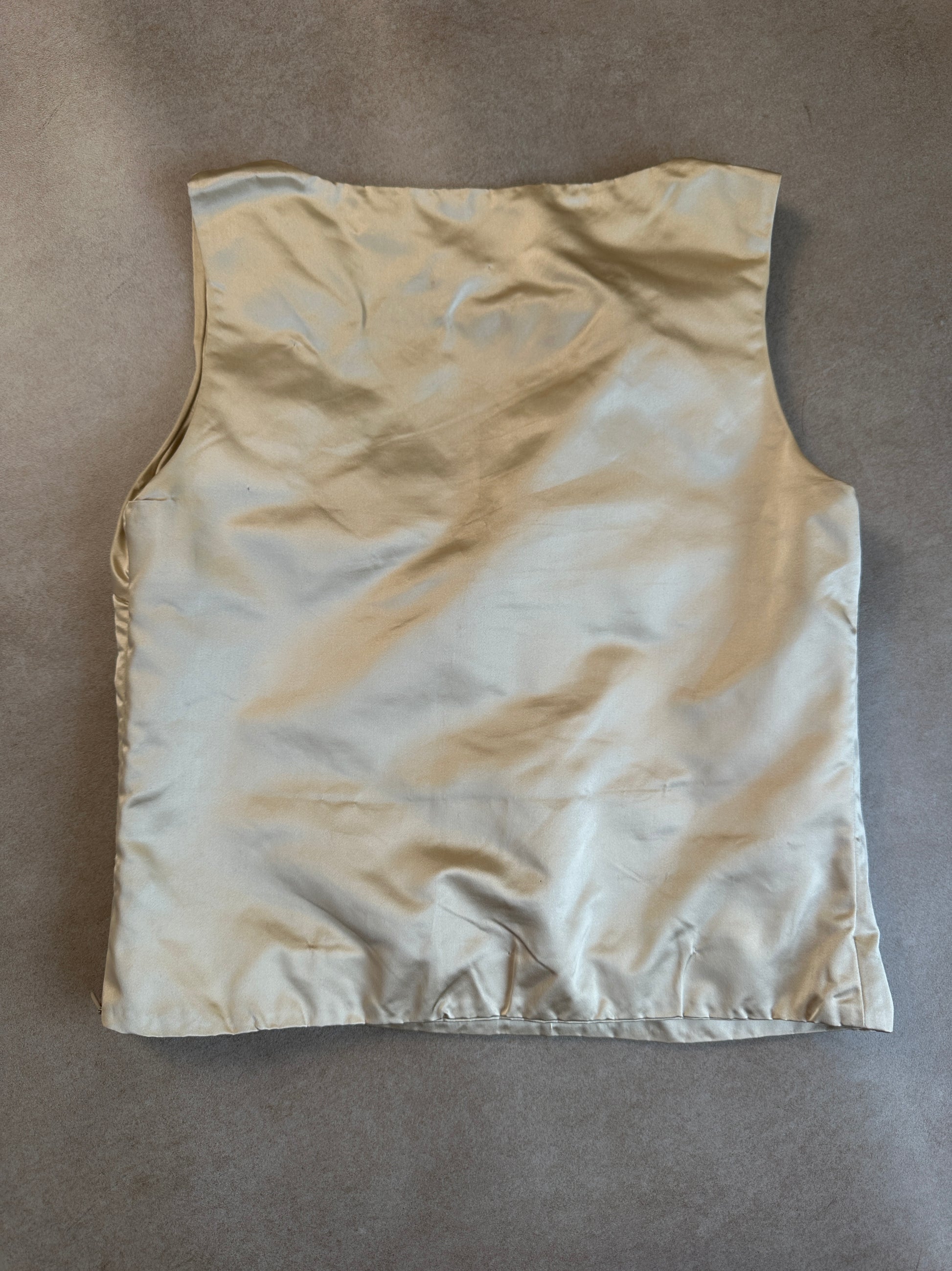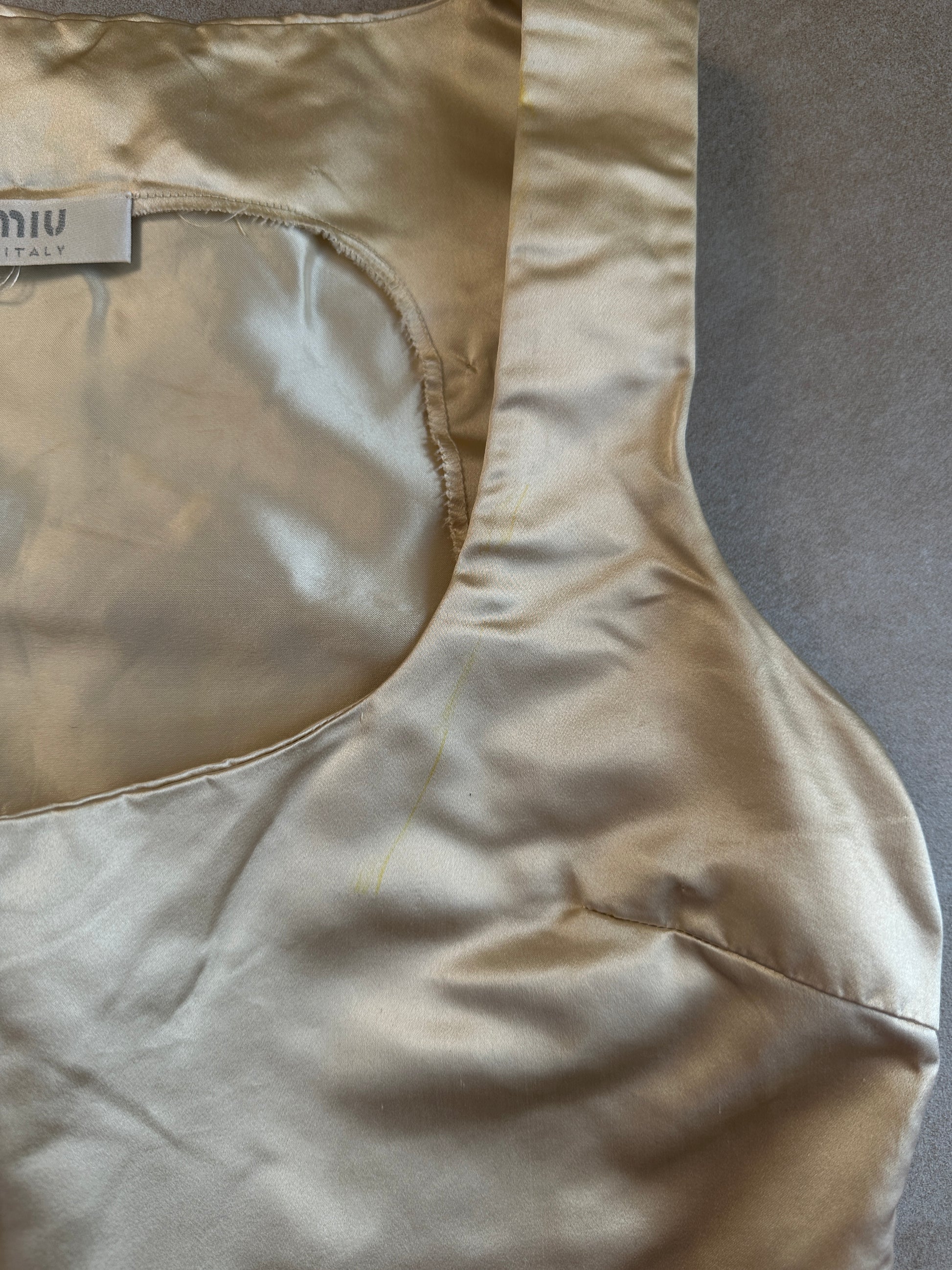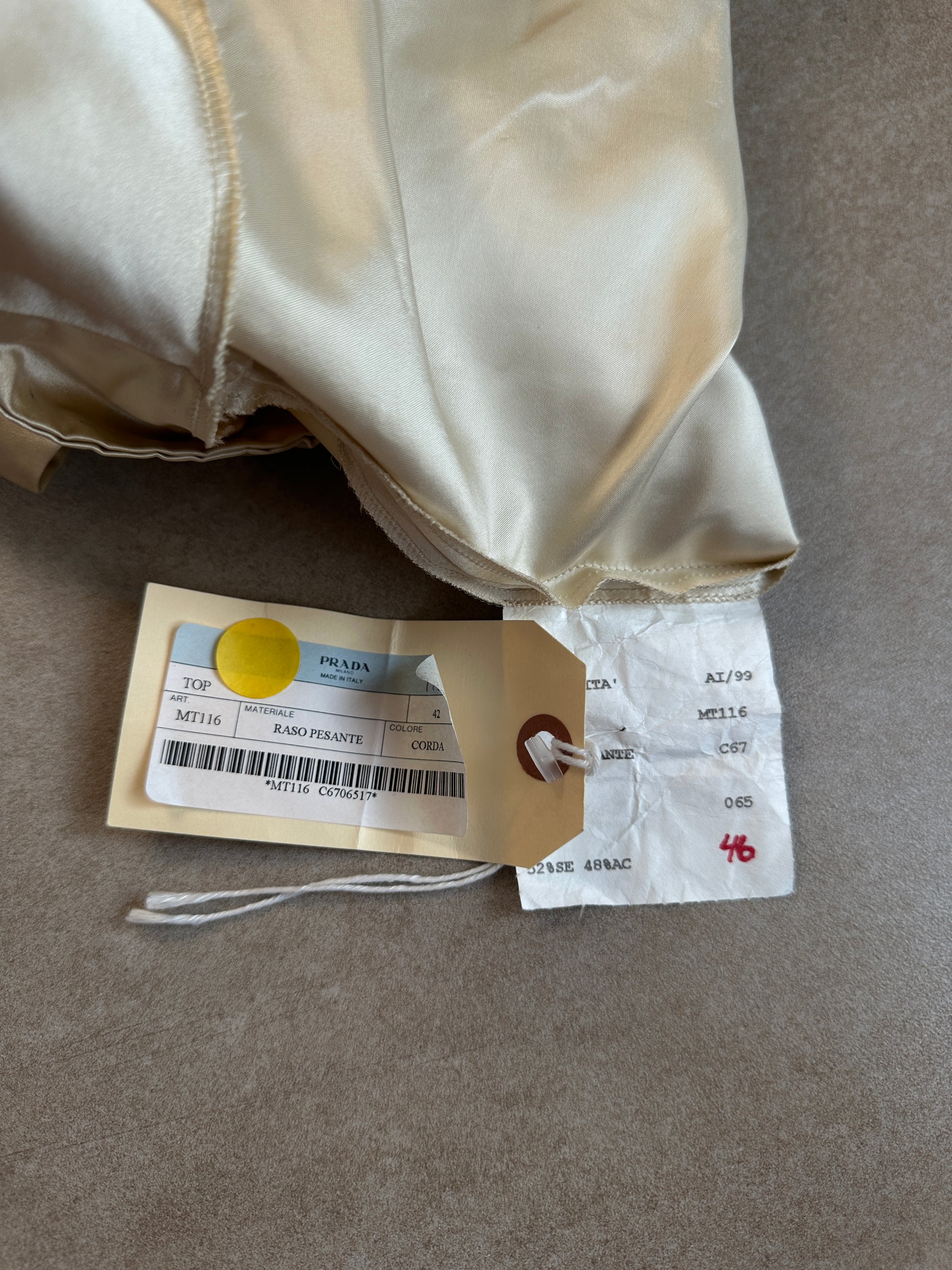 rare (sample) miu miu fw 1999 ivory satin bustier-style camisole, structured silhouette with a subtle pearl like sheen. includes a left-side zipper closure. condition is unused vintage with storage marks, including a faint line on the front, only visible under strong light