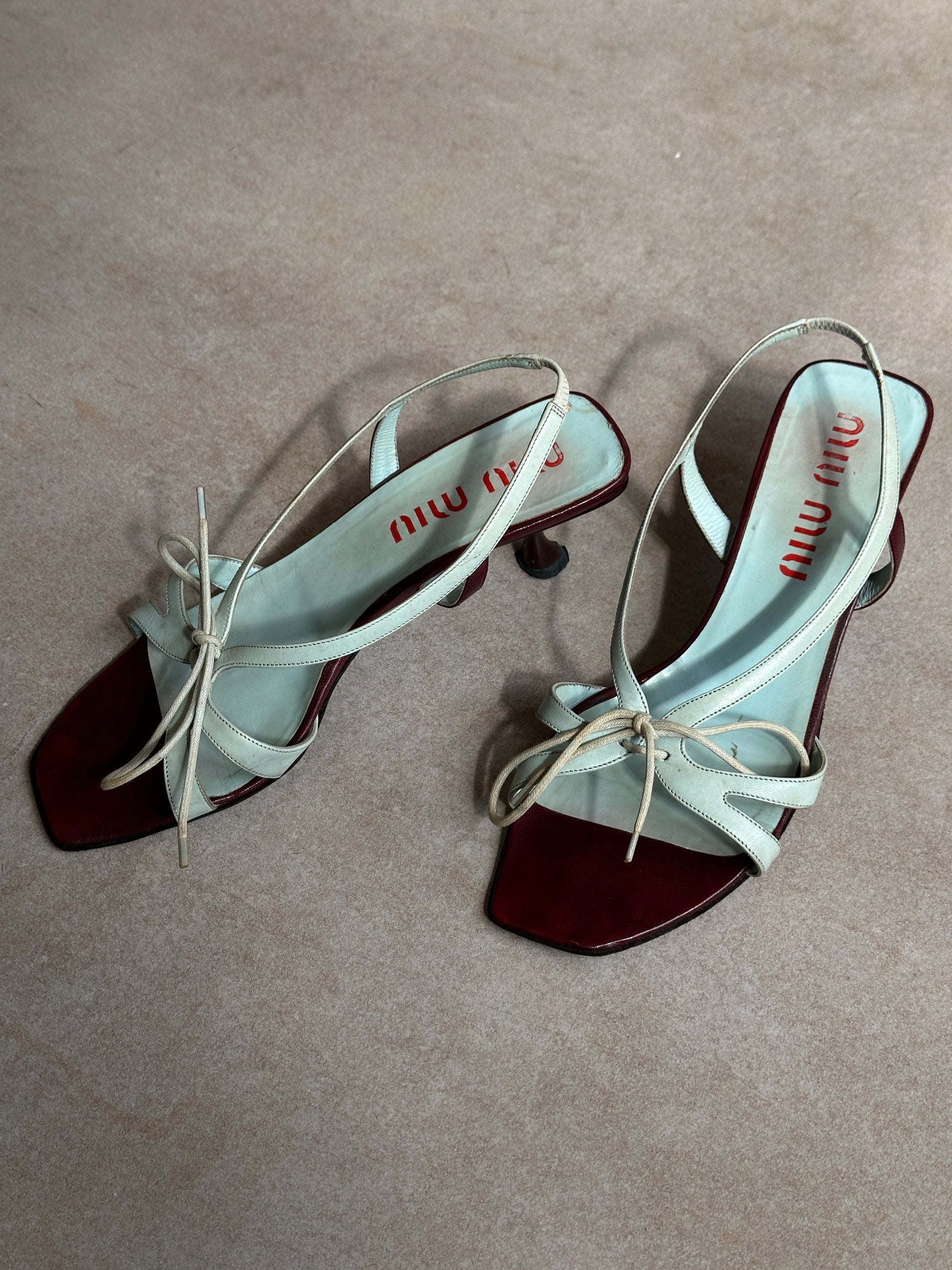 rare miu miu slingback heels featuring a bow detail inspired by butterfly wings. soft cream leather with deep burgundy soles and a square toe silhouette. very good vintage condition with light wear consistent with age. please note minor surface marks on insoles