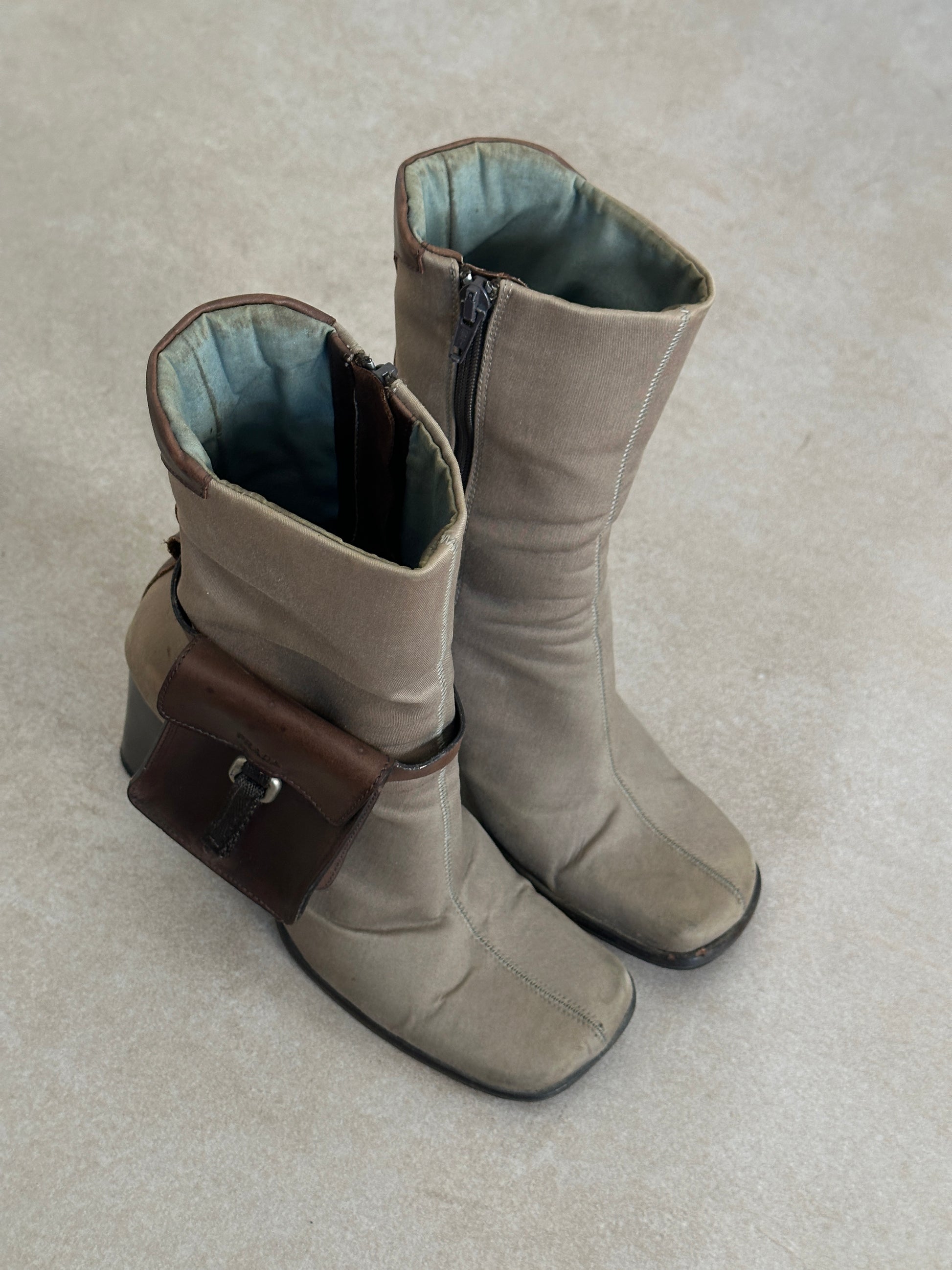 archival mid-calf boots from fall winter 1999, crafted in beige technical canvas with a squared toe and stacked block heel. features a detachable brown leather mini cargo pouch with embossed prada logo and metal hardware. side zip closure for ease of wear. an iconic y2k utilitarian silhouette that bridges runway luxury and functional design.