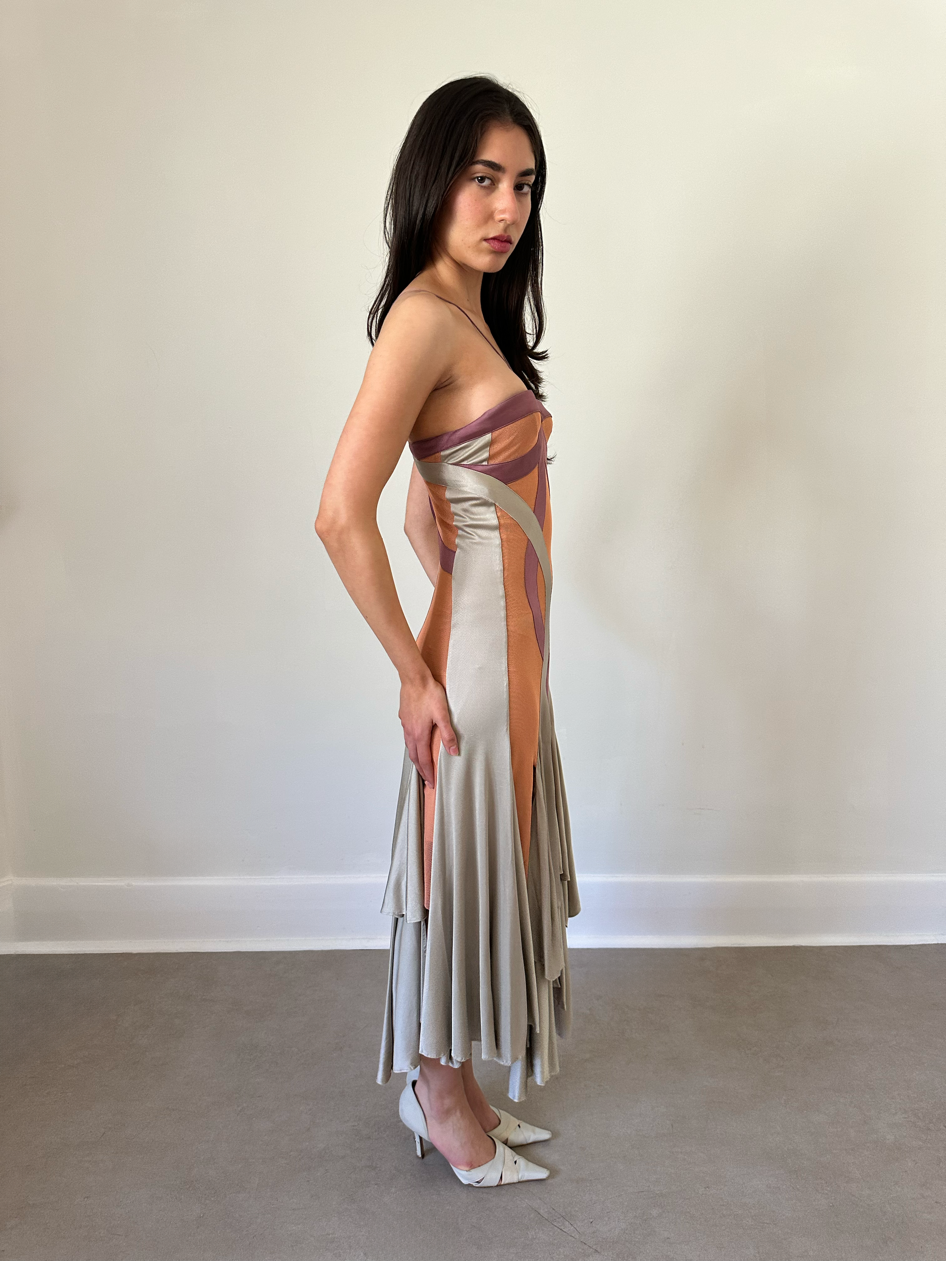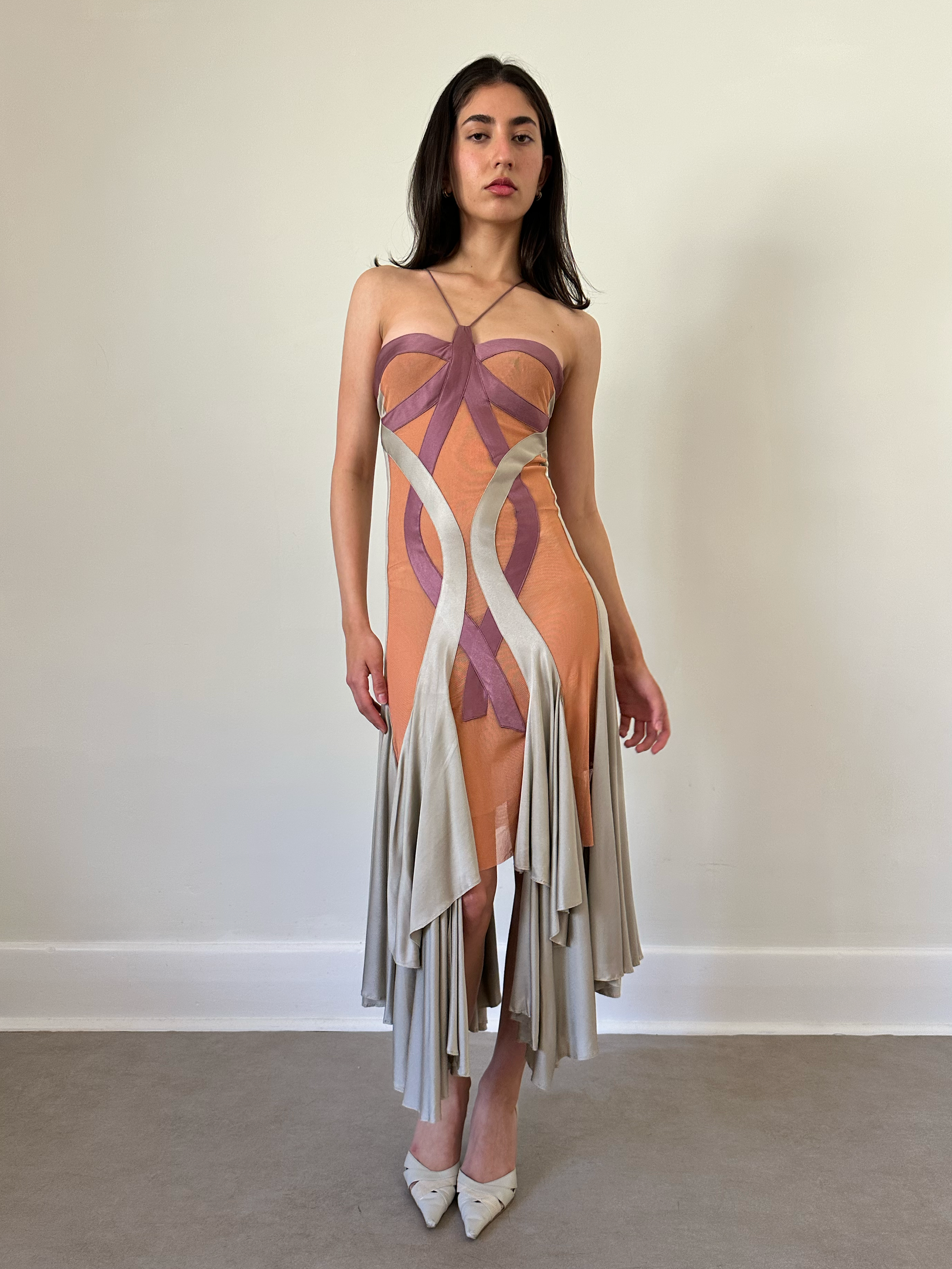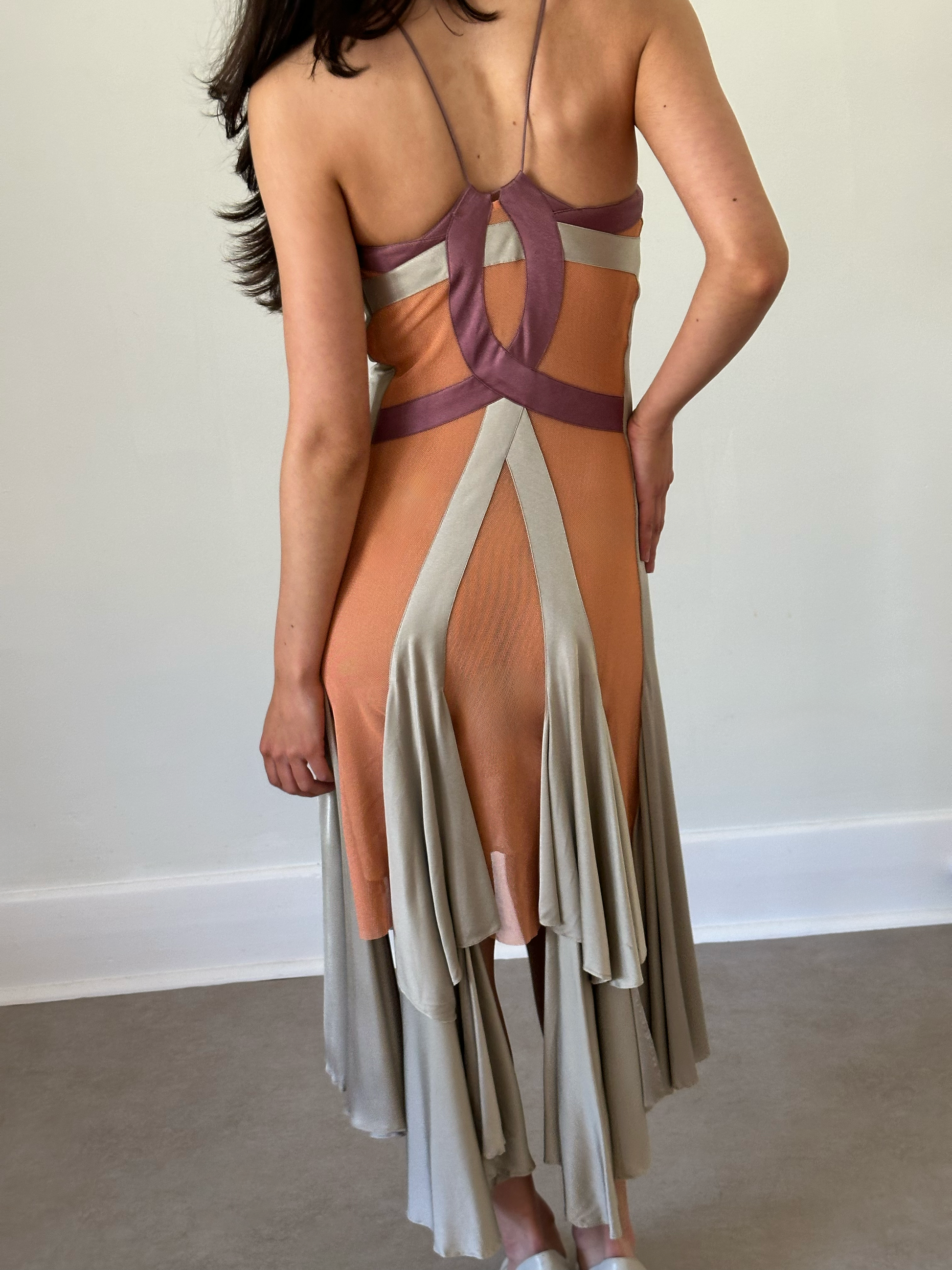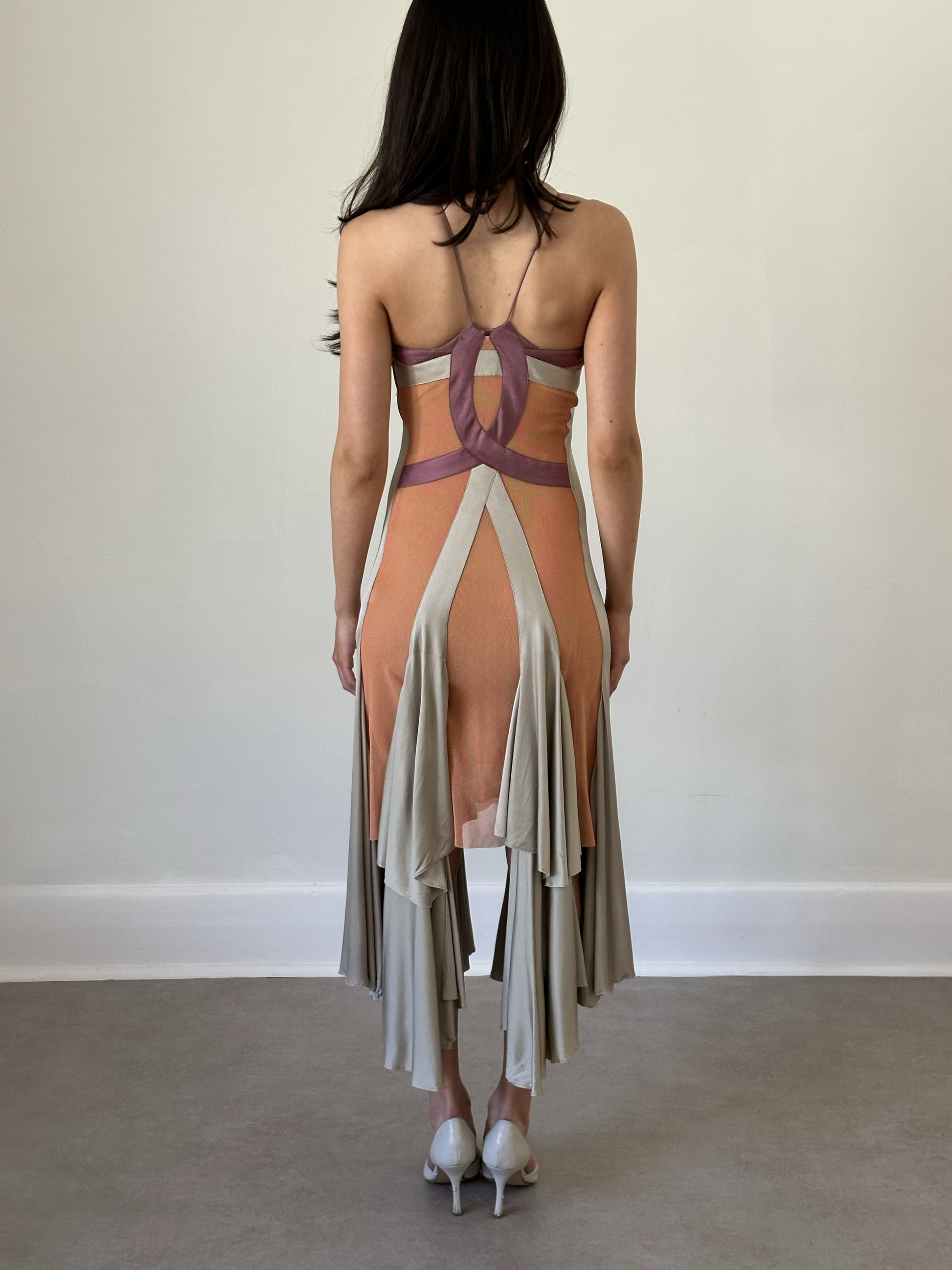 stella mccartney spring summer 2004 panelled satin and mesh dress in mauve, rust, and silver tones. designed with a fitted bodice, sheer mesh inserts, and fluid satin panels that cascade into a draped asymmetric hem. features delicate spaghetti halter straps and a partially open back. in fair vintage condition with minor imperfections