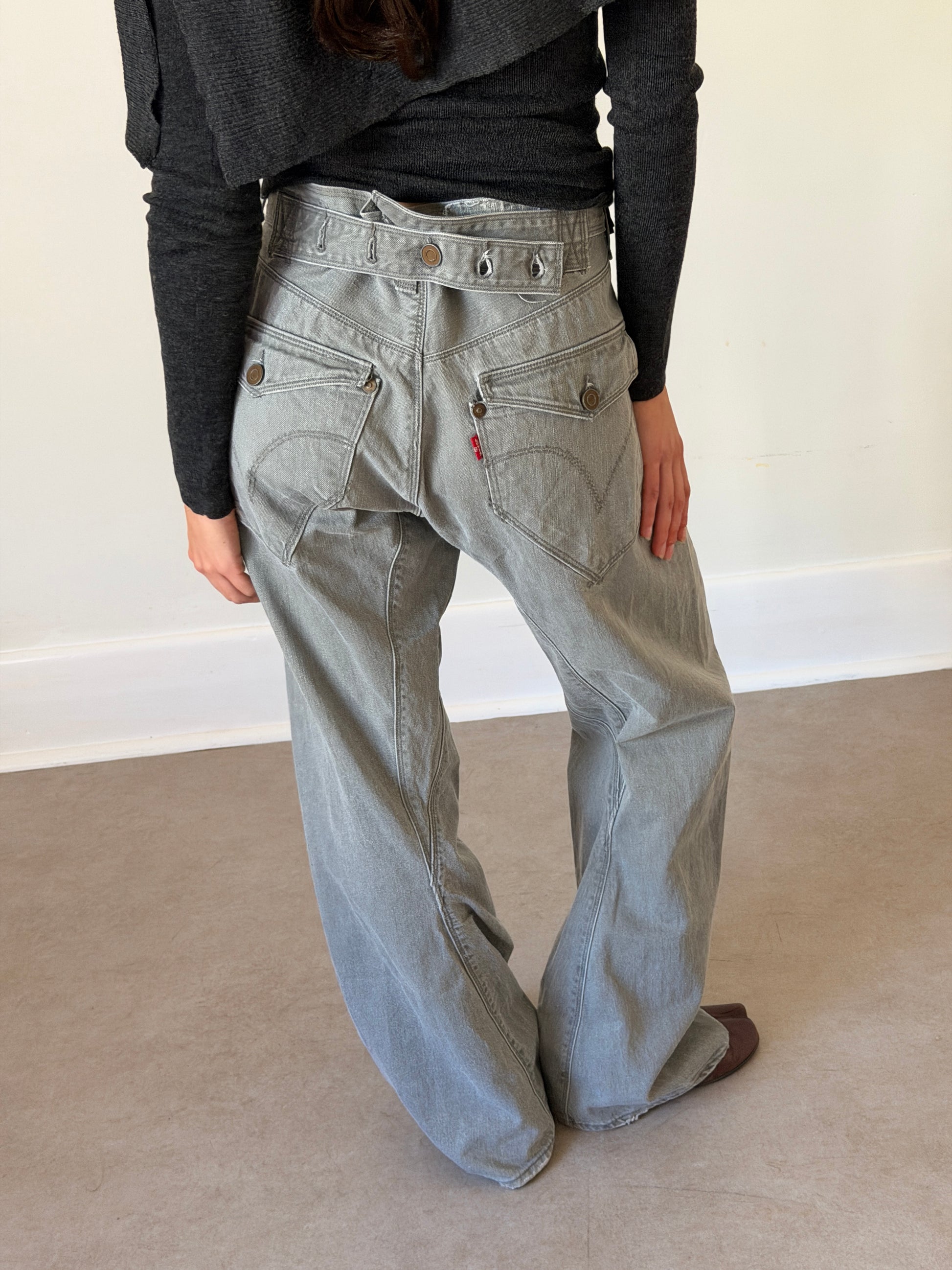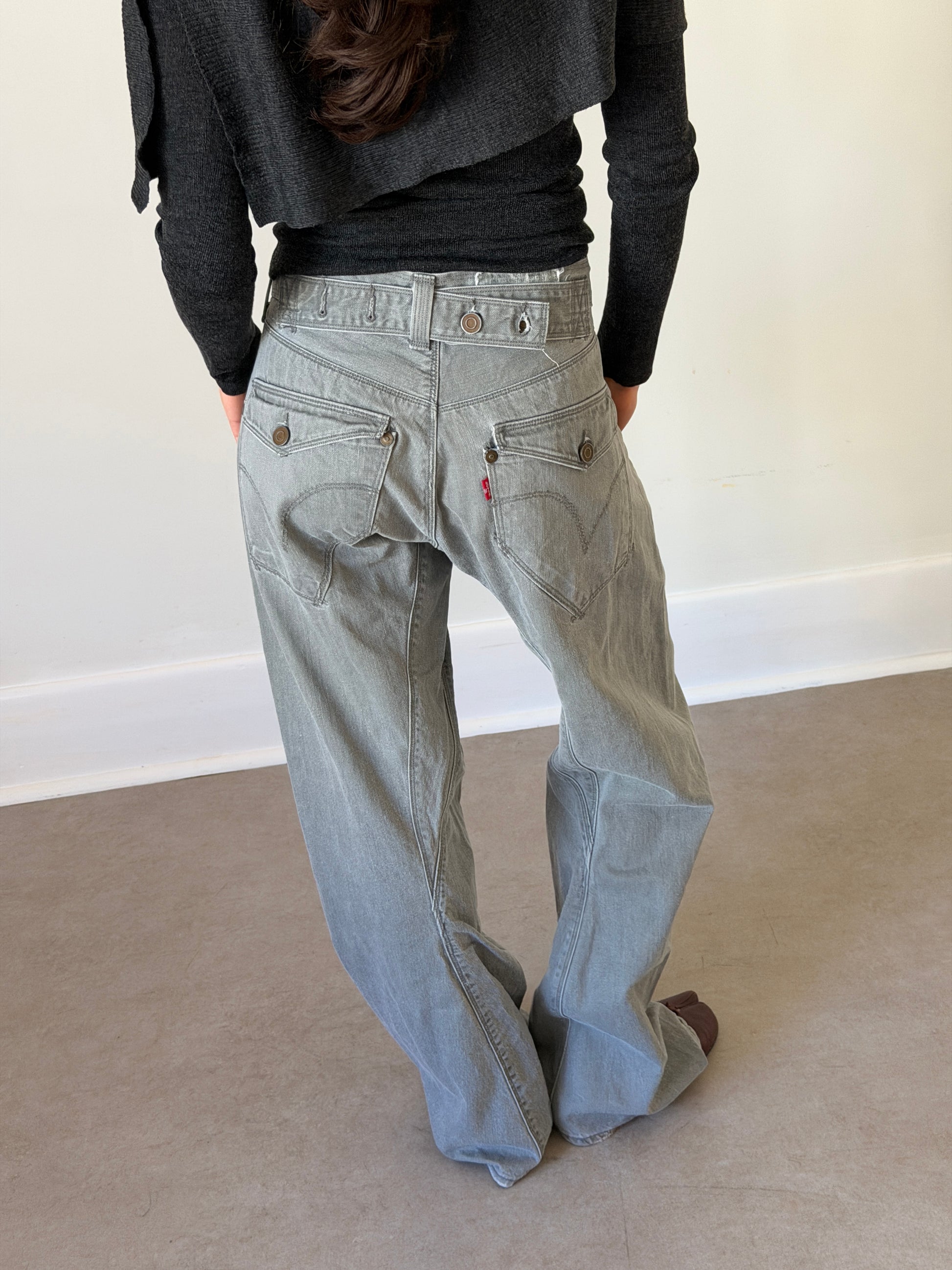 levi’s engineered grey denim, cut in a sculpted three-dimensional silhouette with a relaxed straight leg and subtle flare. classic european engineered construction with articulated seams and a worn-in washed finish. timeless utilitarian denim from the early 2000s. in good vintage condition with visible wear consistent with age.